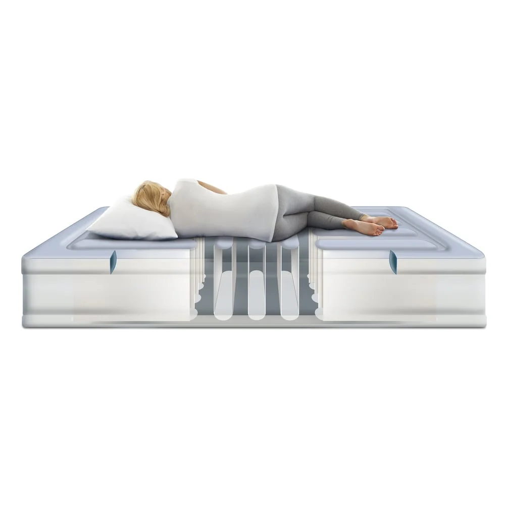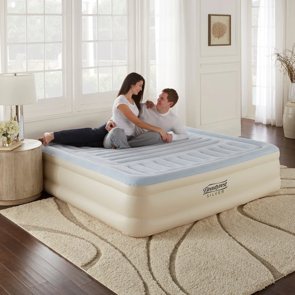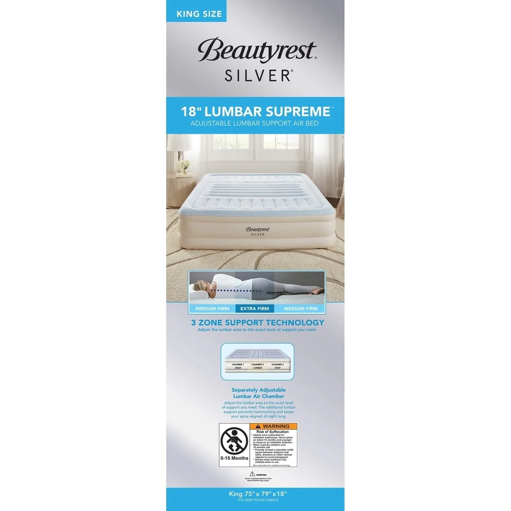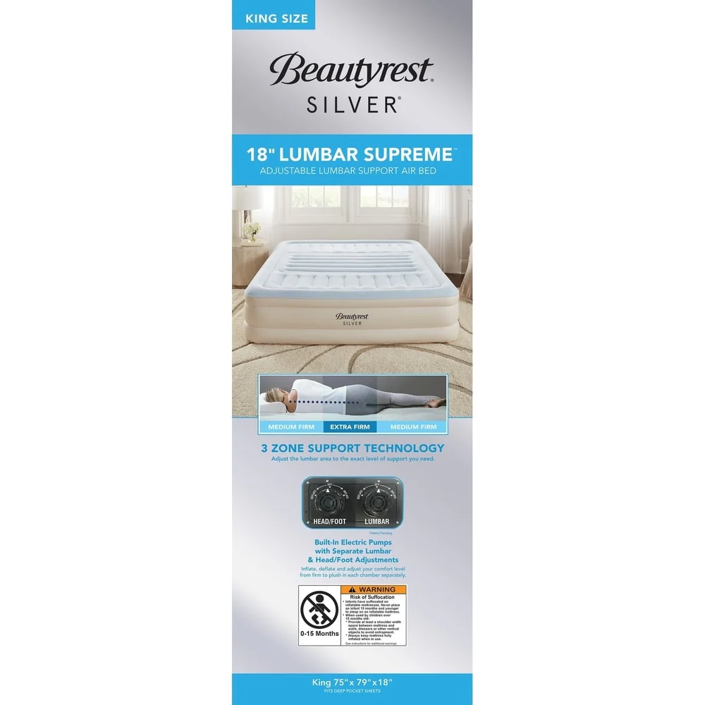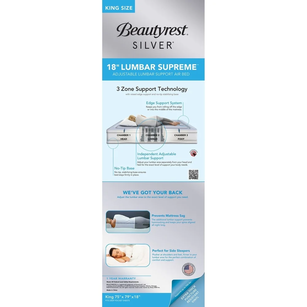 Get the best night's sleep with the Beautyrest Silver 18-inch King Size Lumbar Supreme Air Bed Mattress. This air bed mattress is perfect for side sleepers as it offers different levels of support, with a plush feel at the shoulders and feet and firmer support in the lumbar area. With the Adjustable Tri-Zone Lumbar Support feature, you can customize the support for your lower back, providing the exact level of comfort you need. The puncture-resistant vinyl construction and no-tip stabilizing base make it a durable and safe choice for you or your guests.