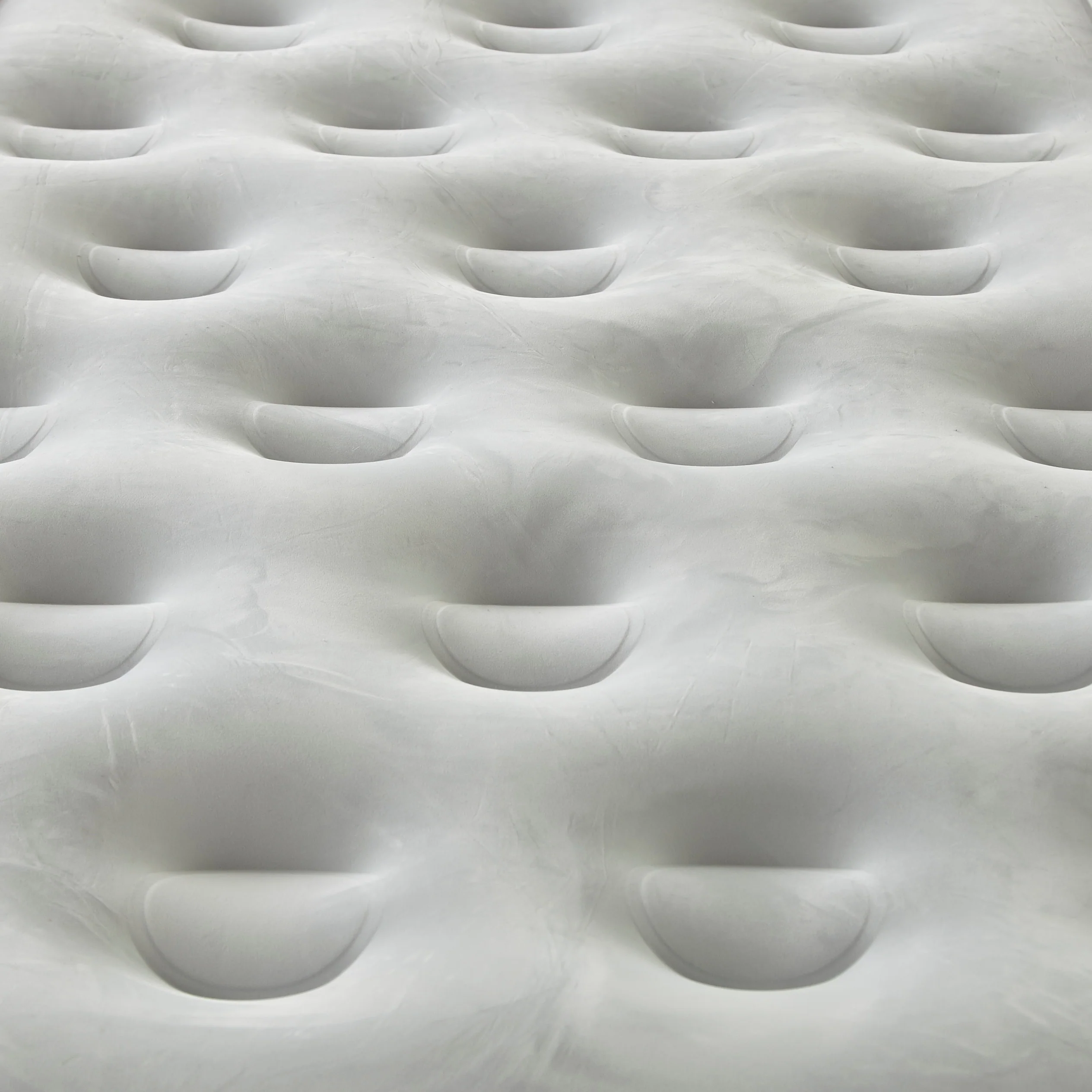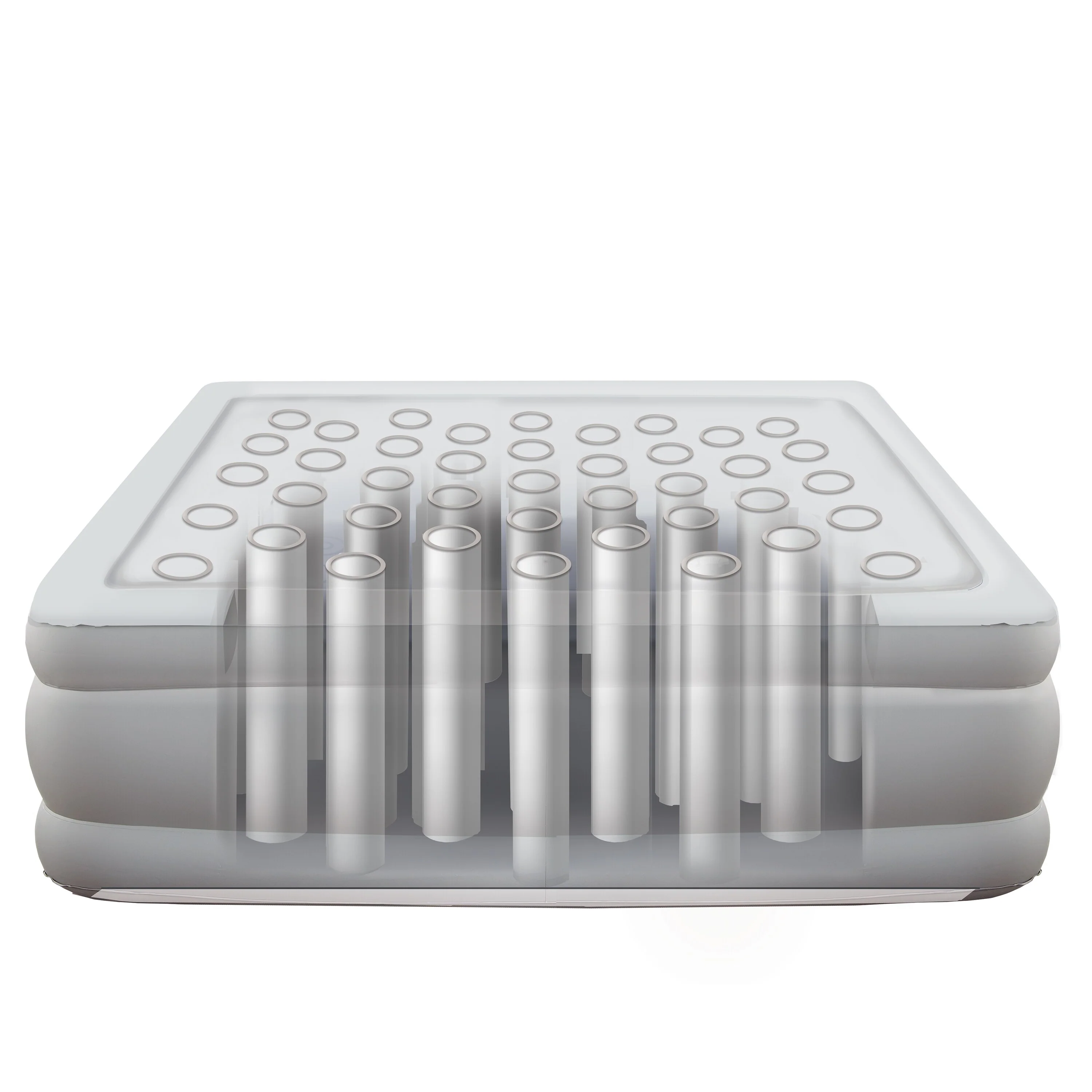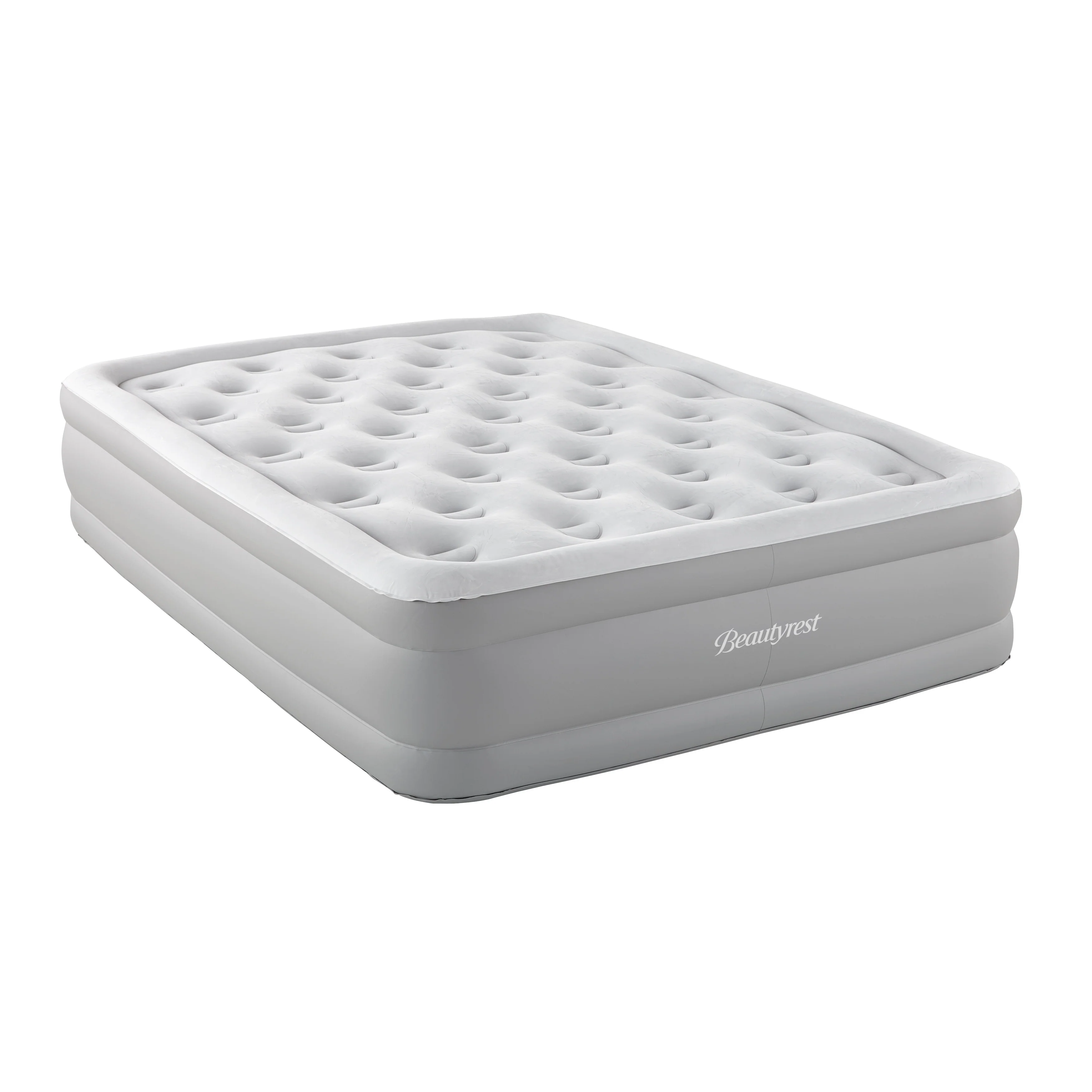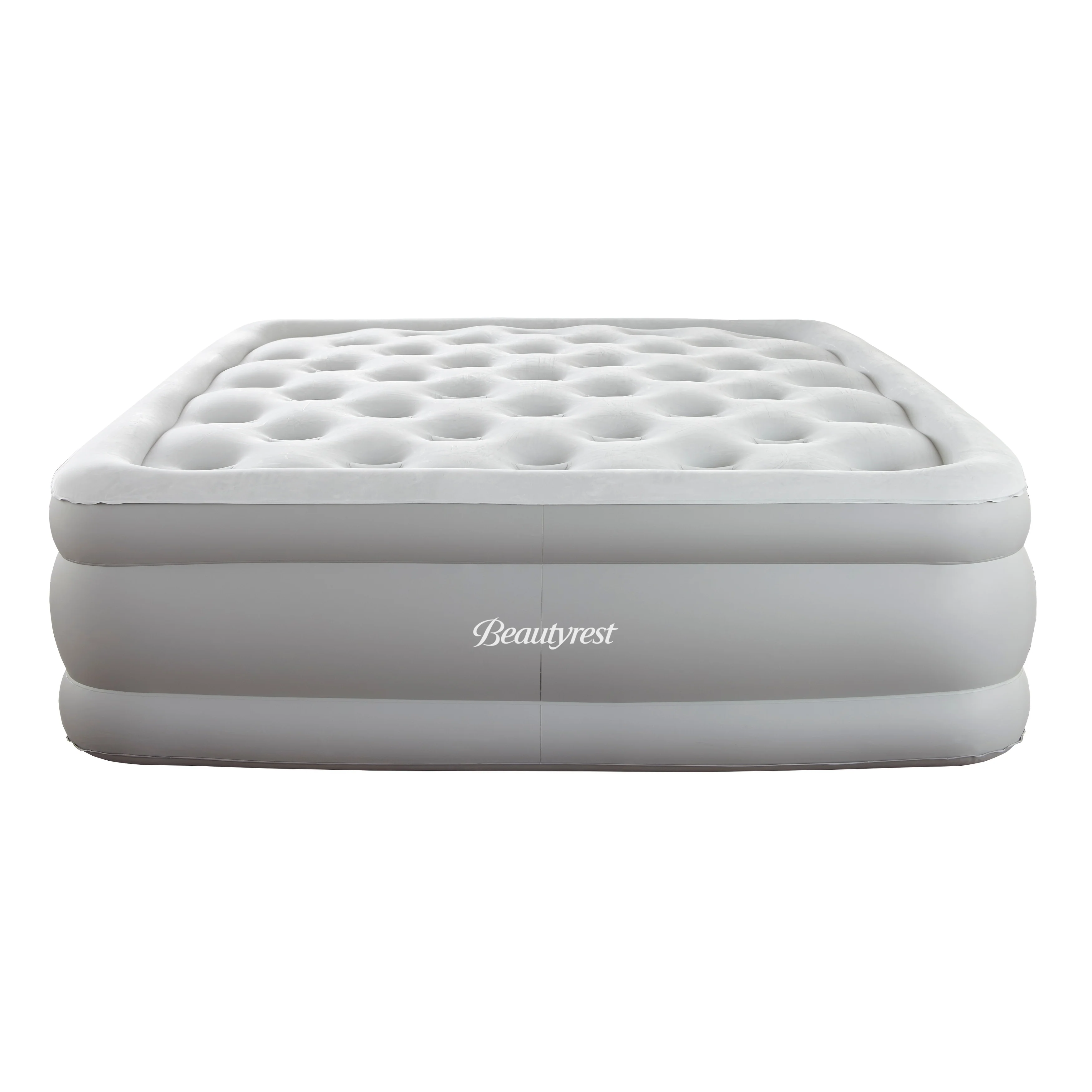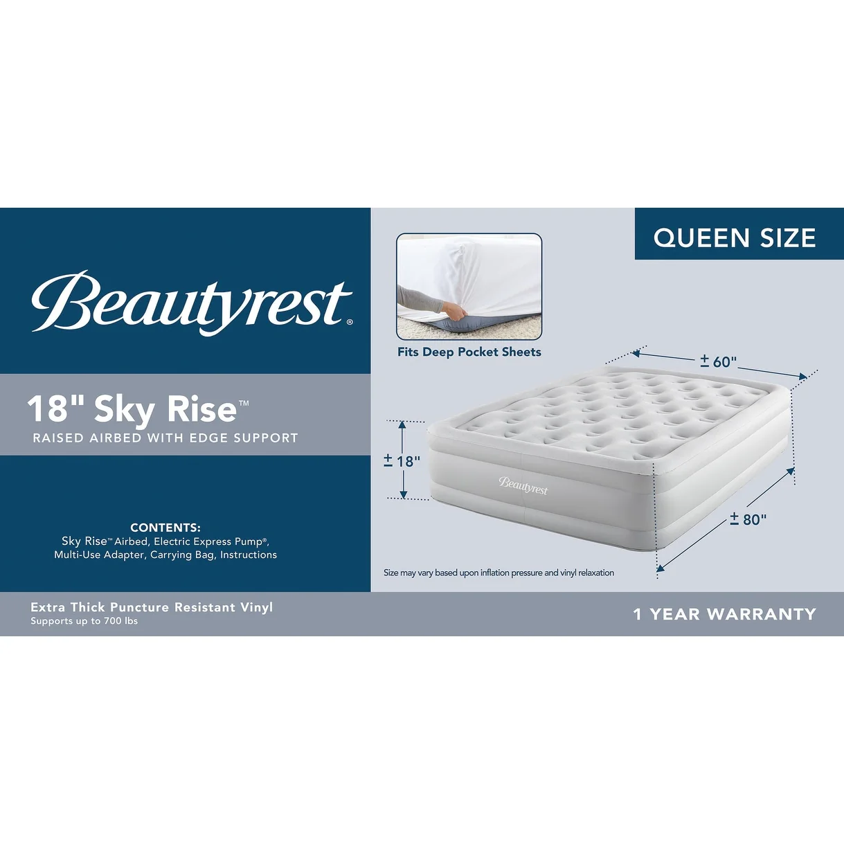 Get a good night's sleep, even on the go, with the Beautyrest Sky Rise 18' Queen Air Mattress with A/C Pump. This adjustable air mattress allows you to customize your comfort level with just a touch of a button. The offset coil design provides exceptional pressure-relieving support that contours your body throughout the night. With a plush velveteen cover and extra-thick puncture-resistant vinyl, this air bed is durable and comfortable. It supports up to 700 pounds and fits deep pocket size sheets, making it perfect for guests or camping trips. Includes a carrying bag and A/C pump for easy inflating and deflating.