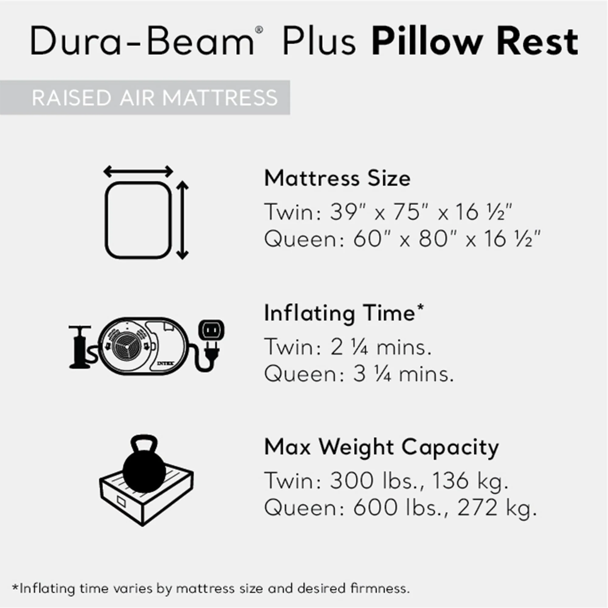 - Built-in pump electrically inflates and deflates the mattress for super convenient setup and takedown process