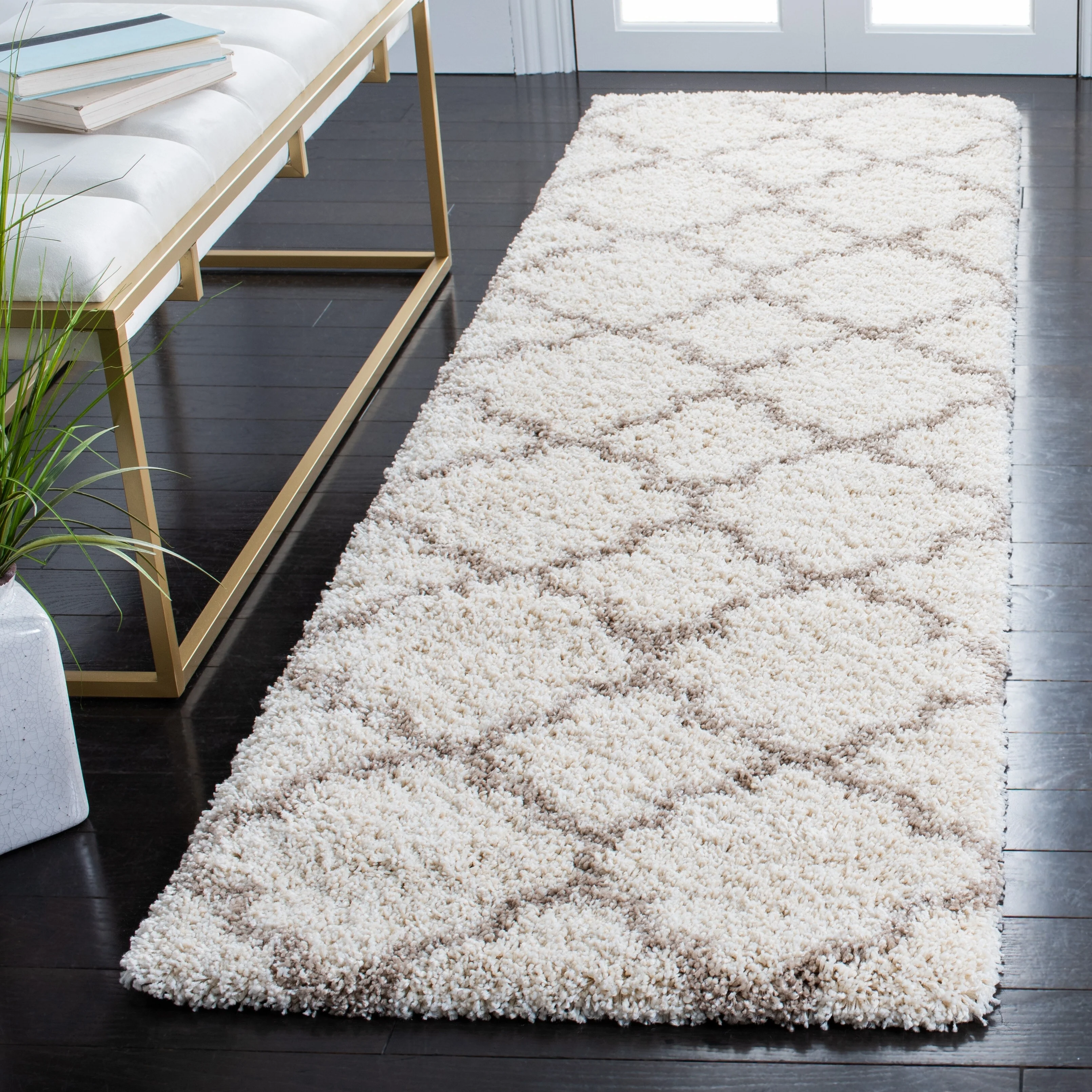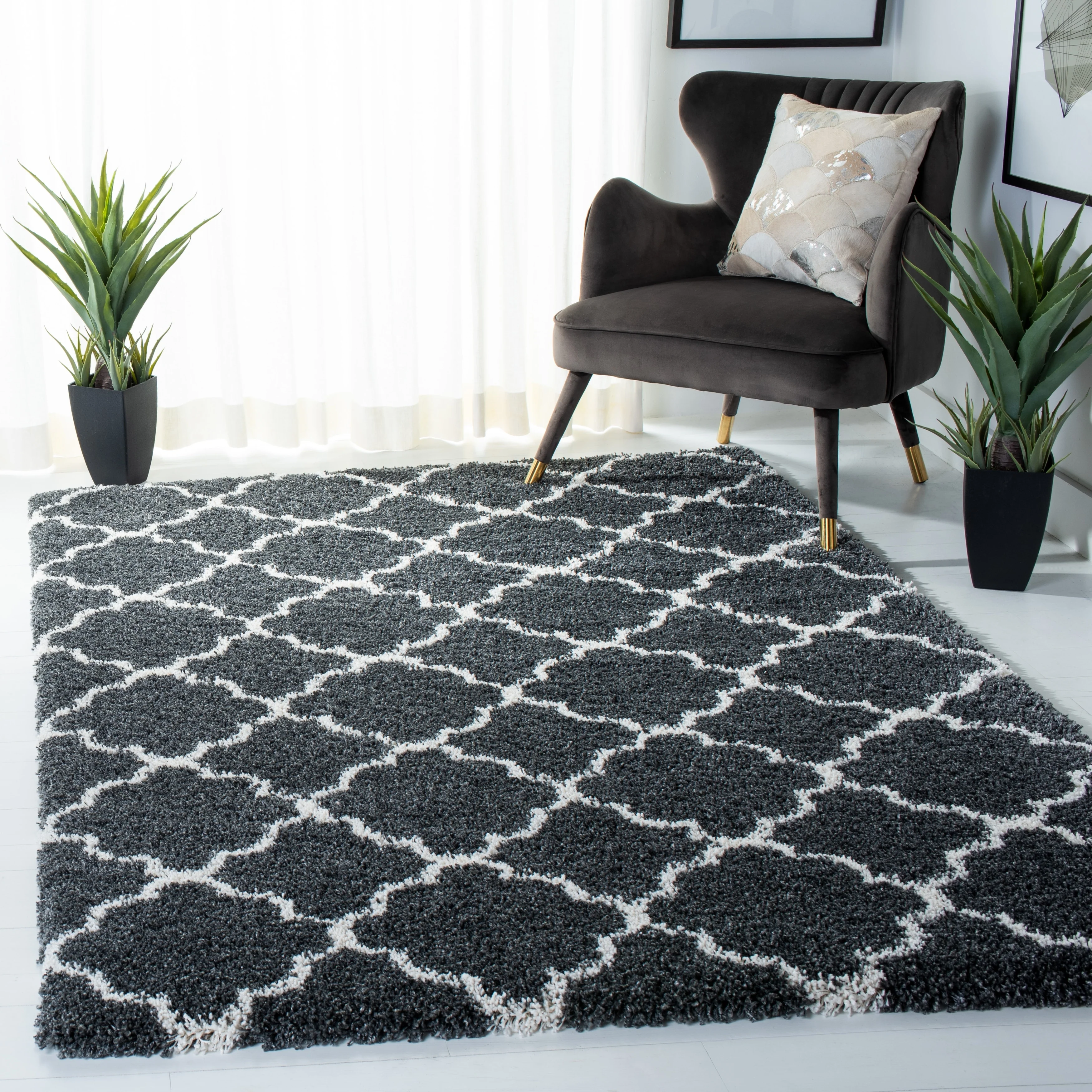 The SAFAVIEH Hudson Shag Vitchka Glam Trellis 2-inch Area Rug offers both fashion and function to elevate any room in your home. With a plush and thick shag pile, this rug is perfect for adding cozy cushioned softness underfoot. The machine-woven durable fibers ensure that this rug doesn't shed, making it ideal for high-traffic areas. The trendy trellis design enhances any room's style, while the stress-free maintenance makes it easy to keep clean. Part of the SAFAVIEH Hudson Shag Collection, this rug is the perfect addition to any contemporary, country, rustic, or transitional d茅cor.