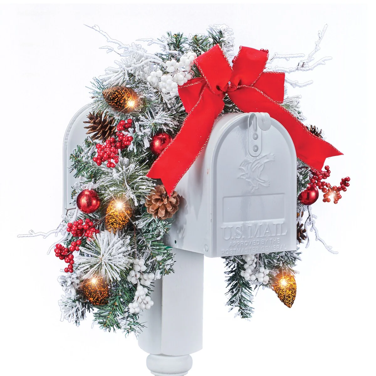 Frosted Pine Holiday Mailbox Swag with Solar LED Lights - 15.500 x 6.250 x 6.250