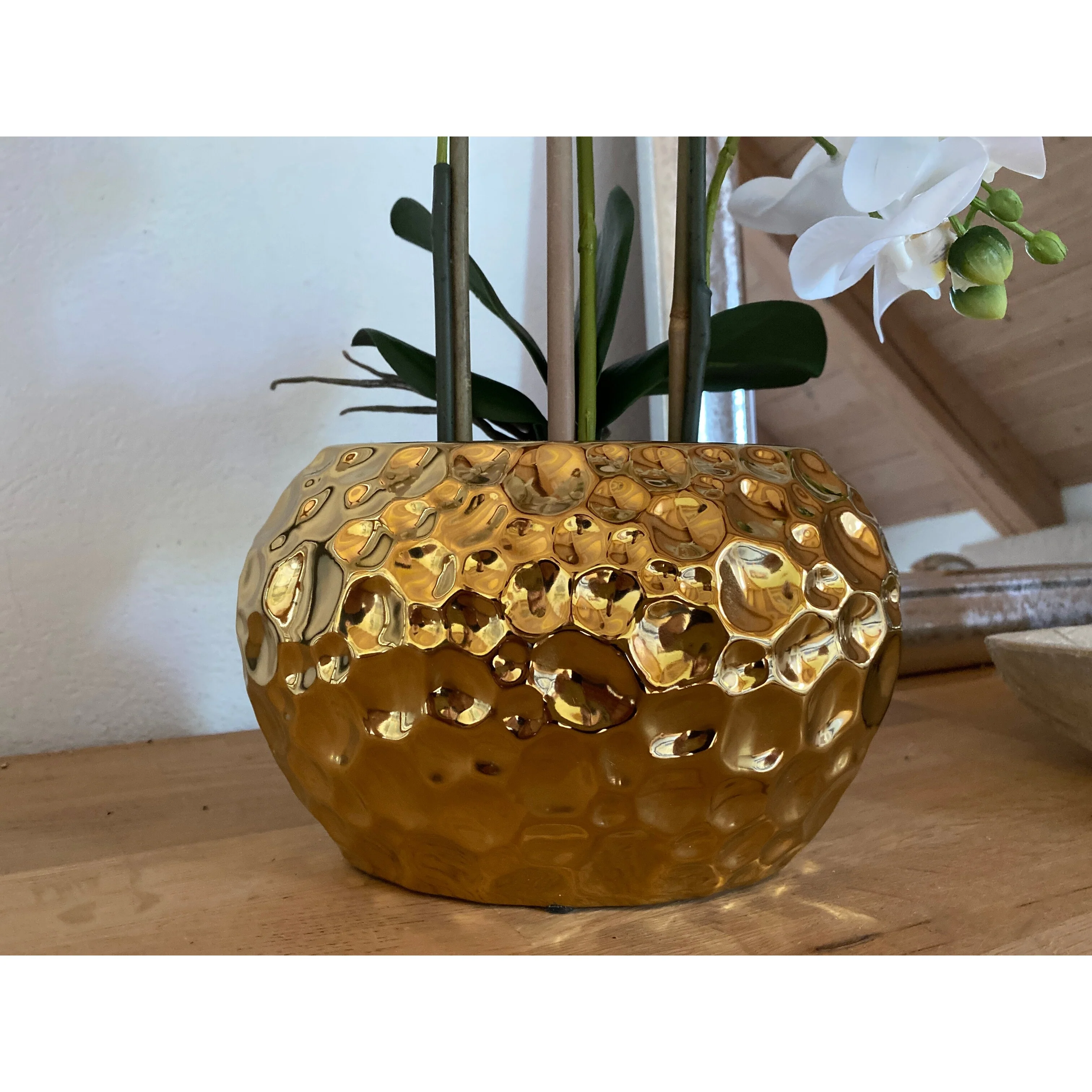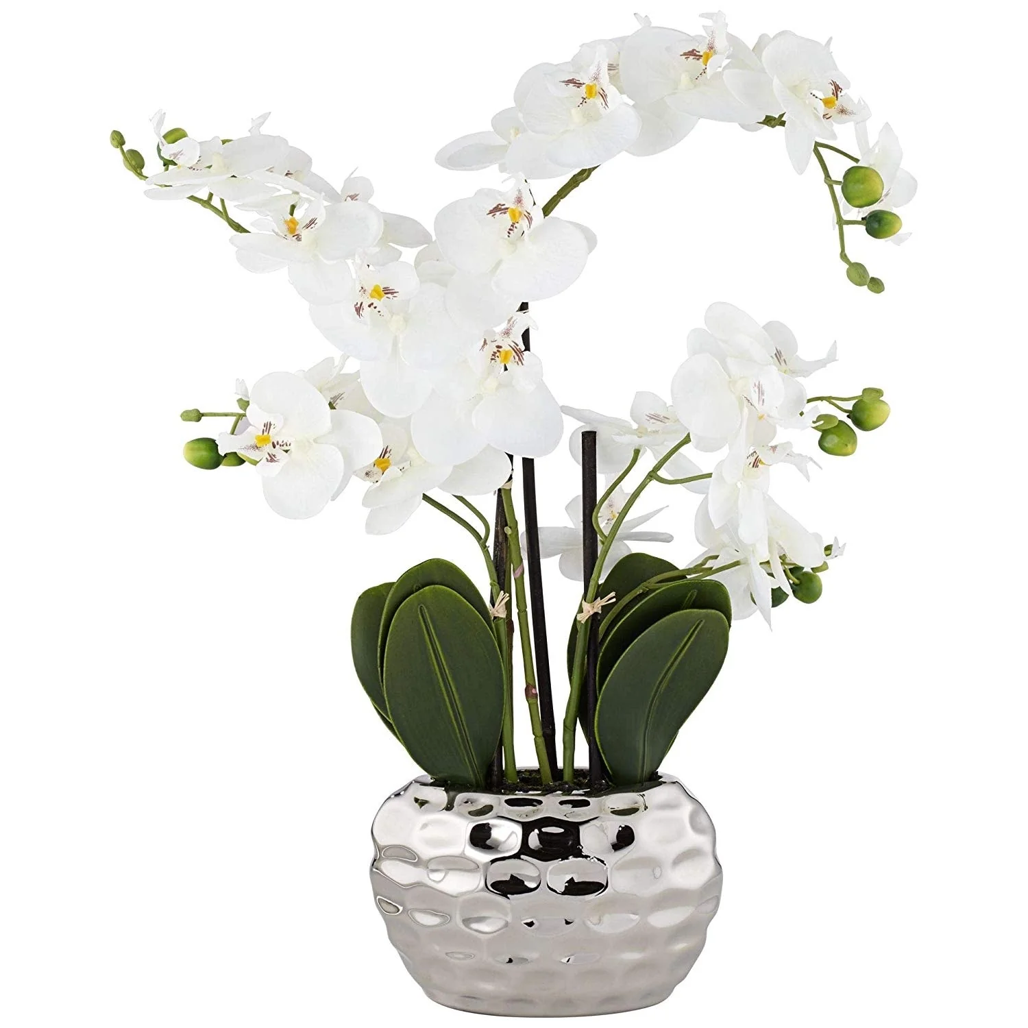 Beautiful and delicate artificial Orchid Phalaenopsis plant for your home or office. This plant has 3 stems with sprays of flowers and buds. It also includes an attractive oval silver vase. For a more realistic look, this plant is embellished with artificial leaves and roots. This plant will bring beauty to dull tables, shelves and dark corners.The stylish, artsy centerpiece arrangement creates a fresh, homely ambience and is an eye-catcher in any room, even in darker corners and niches. Be enchanted by this ever-blooming and easy-care artificial plant. You will be excited. The decorative, silver-colored oval vase, 8x4.5x5' (20x11x13 cm), is included. The total height of the plant is 24 Inches (60 cm).