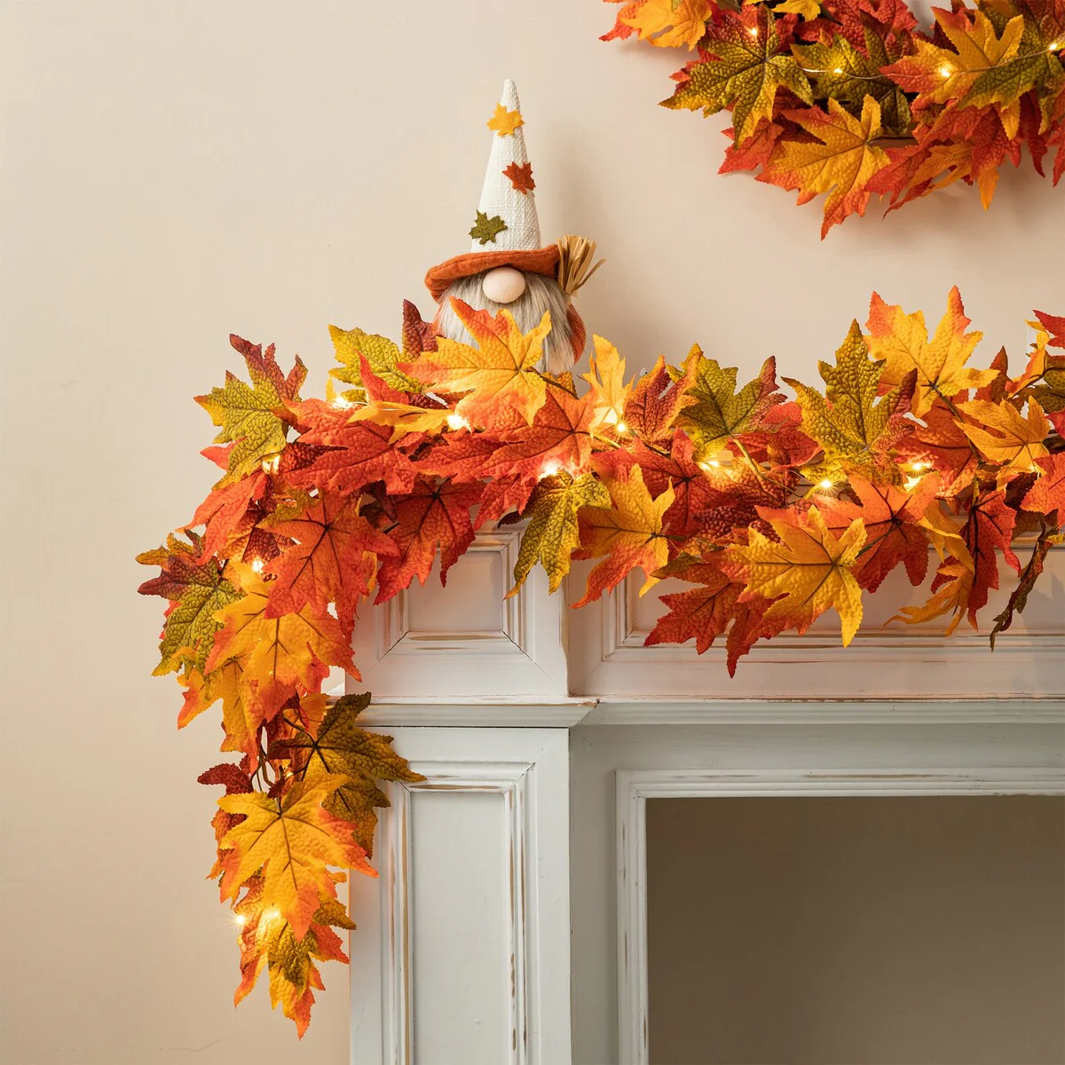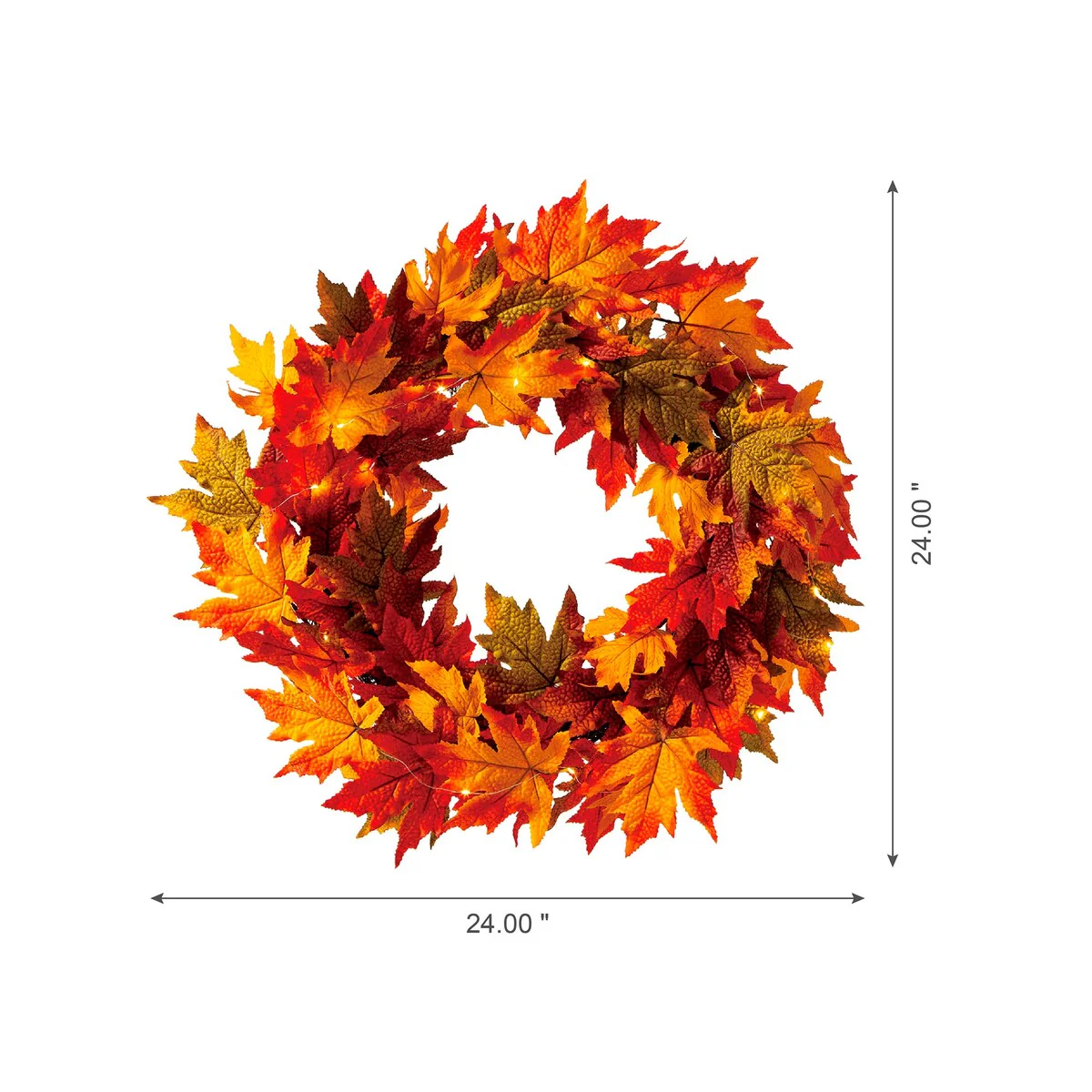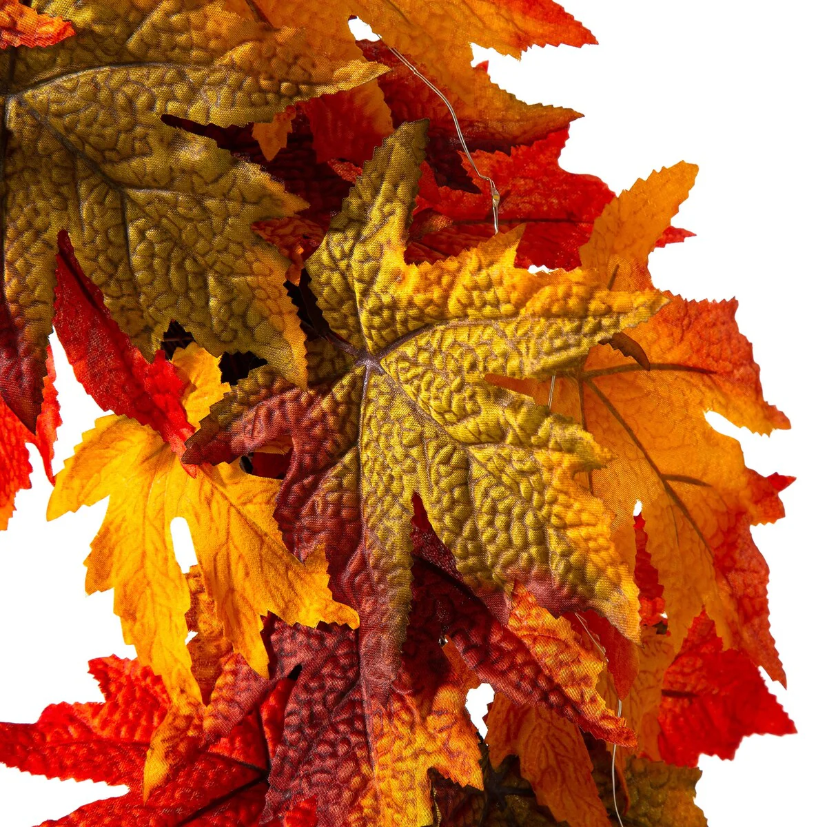 - Pre-lit with 20 clear lights and trimmed with fall leaves for added natural appeal