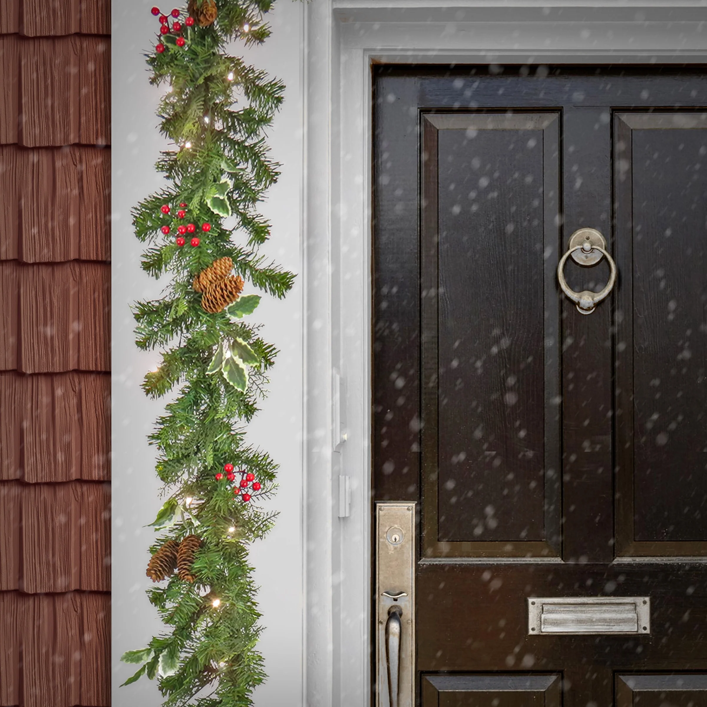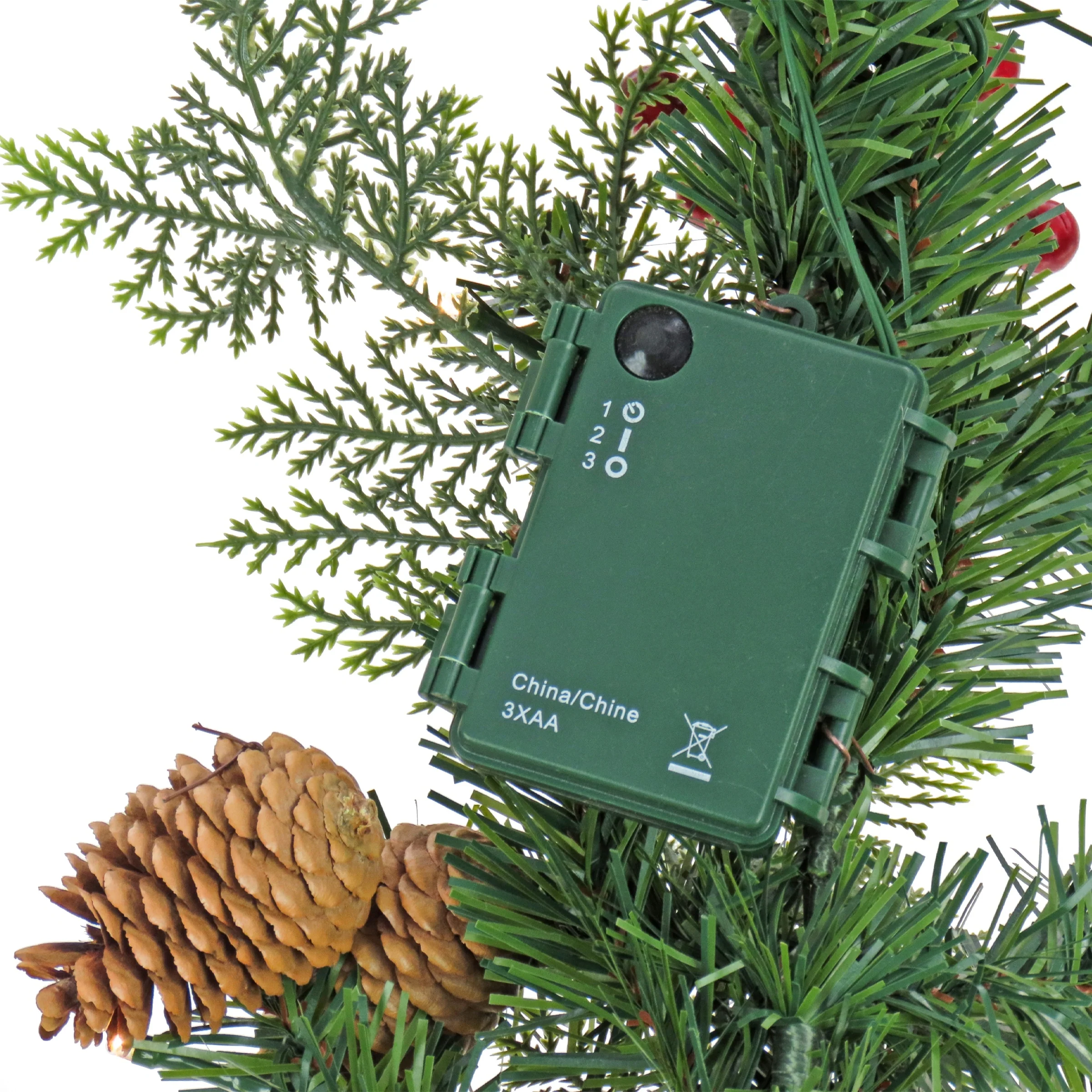 This garland features a mixture of evergreen and cedar branch tips and is trimmed with red berry clusters, pinecones, and holly leaves. It is pre-strung with 30 battery-operated warm white LED lights that are energy-efficient and long lasting. 6 hours ON/18 hours OFF timed operation. This indoor/outdoor garland can be displayed over doors, windows, fireplace mantels, fence, or stairway railings.