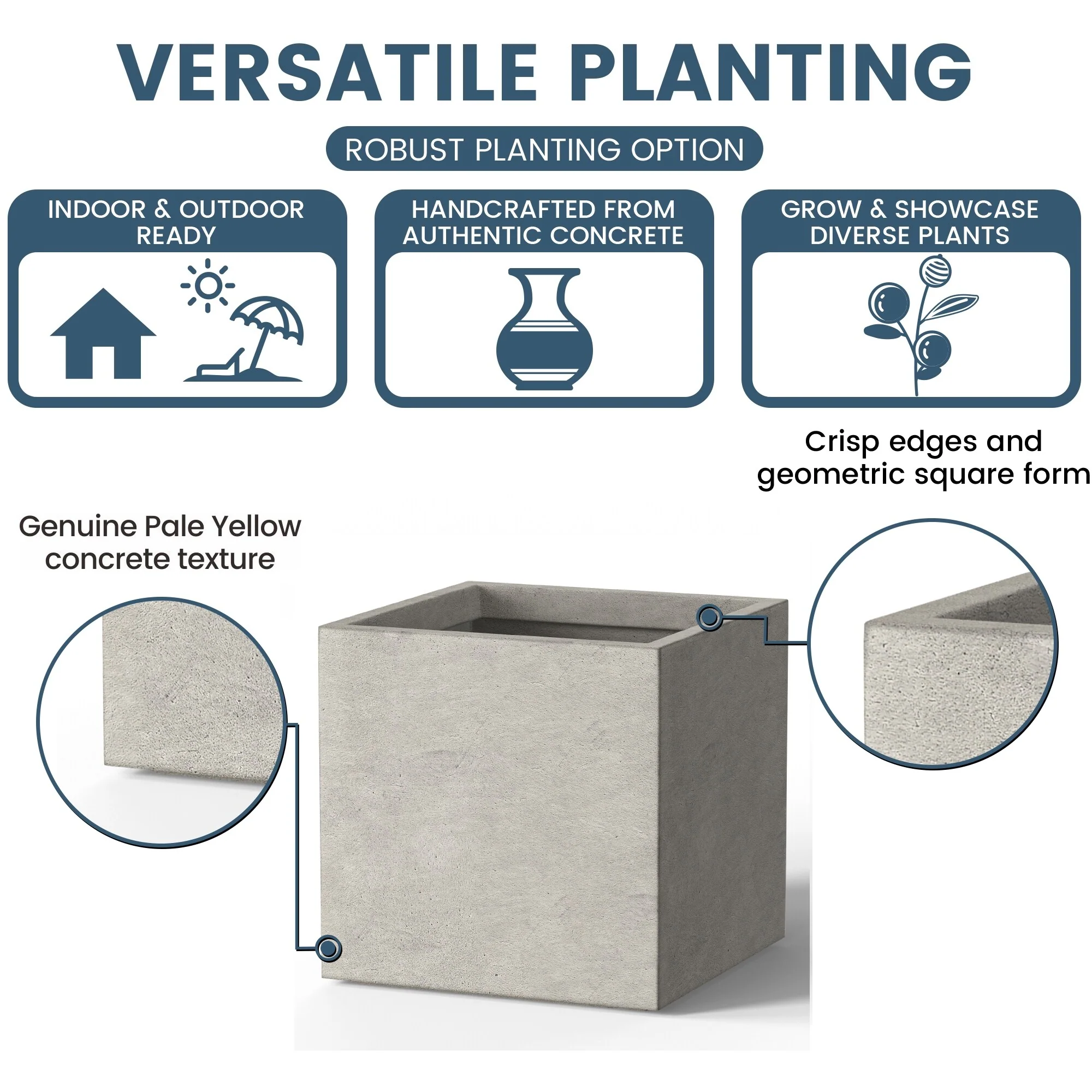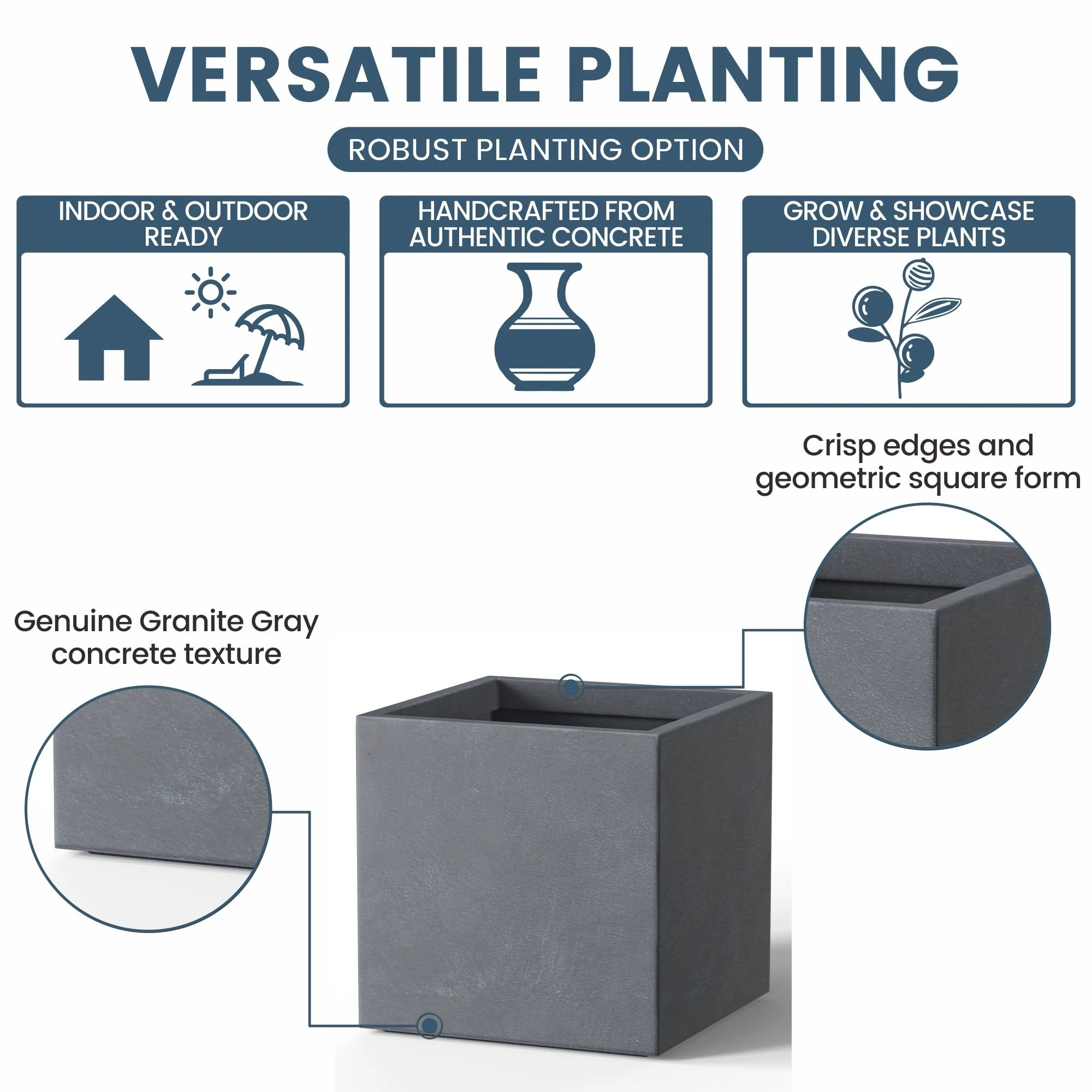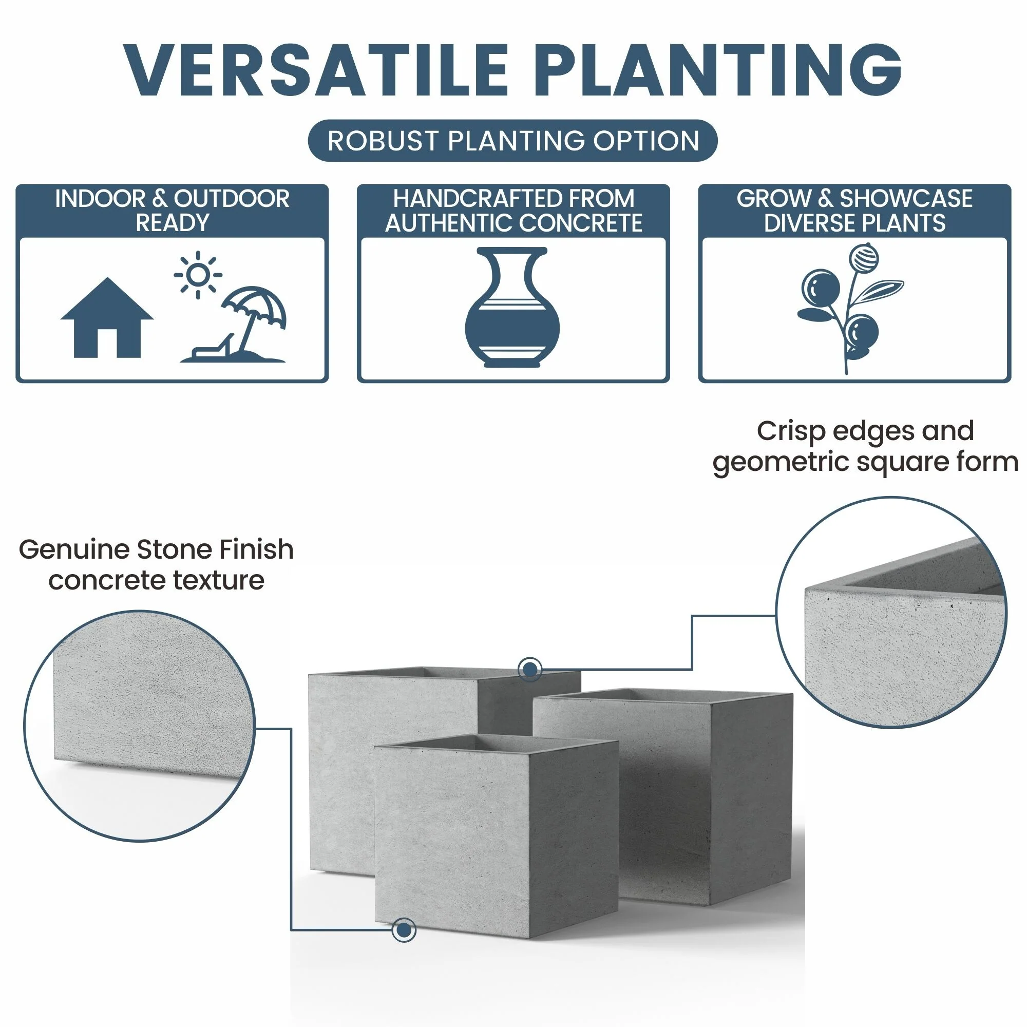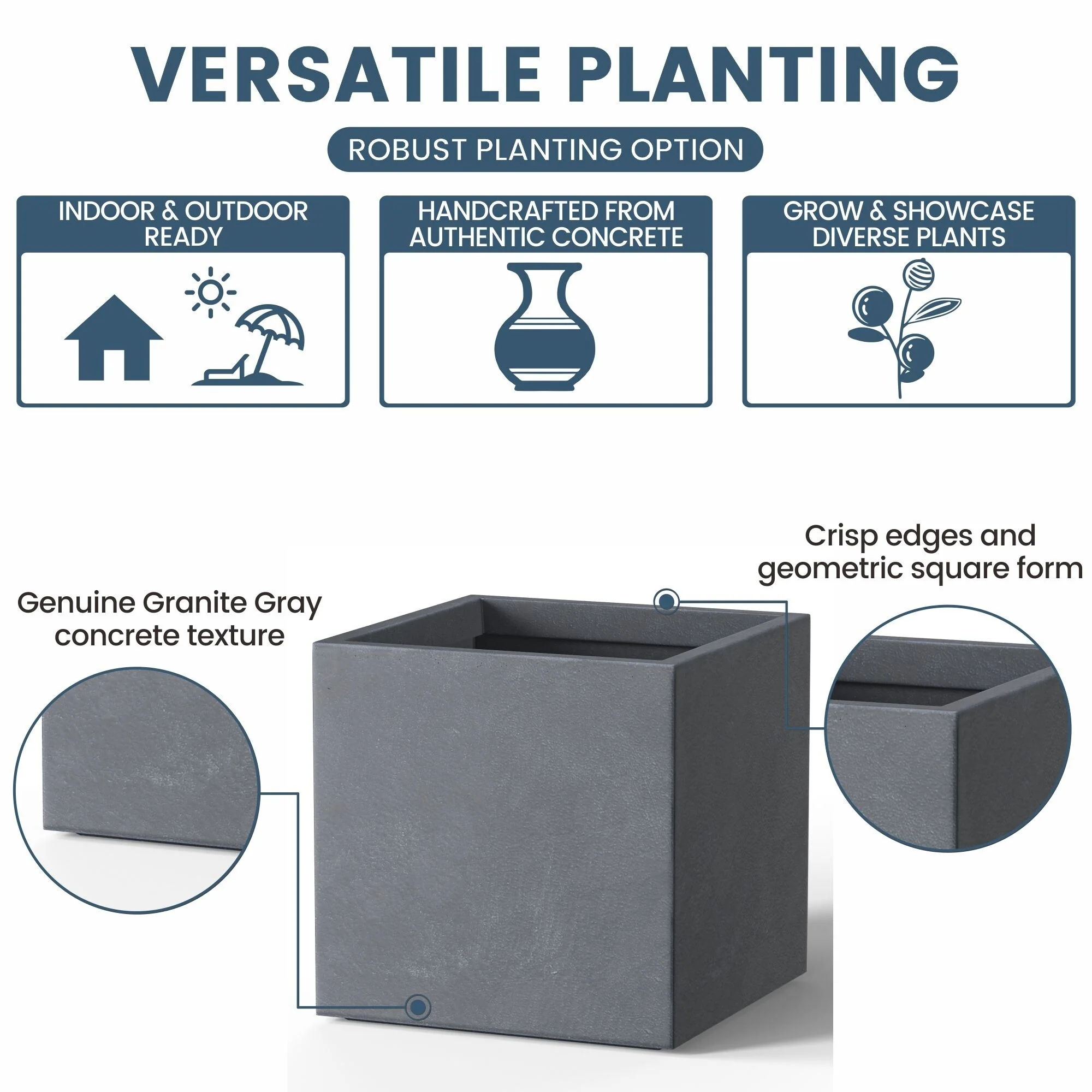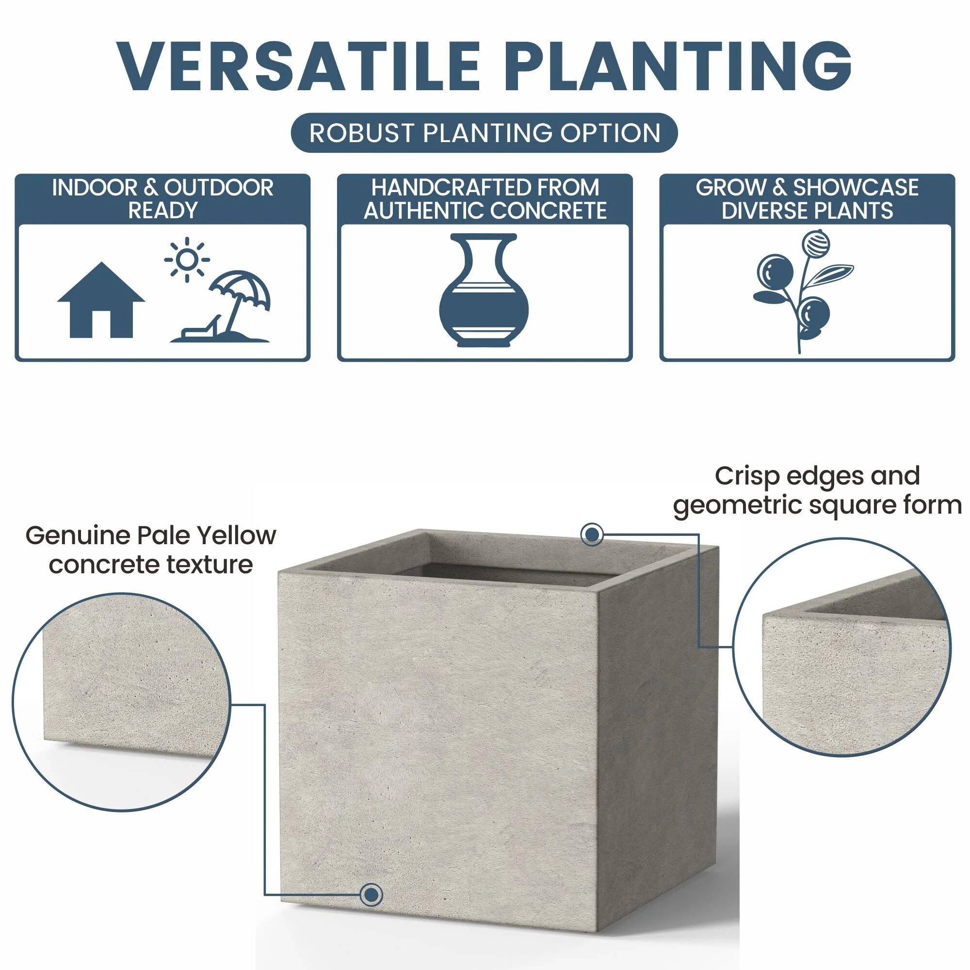 *Rust Resistant: With no metal parts to worry about, these square cement planters resist rusting, ensuring a pristine look through all weather conditions