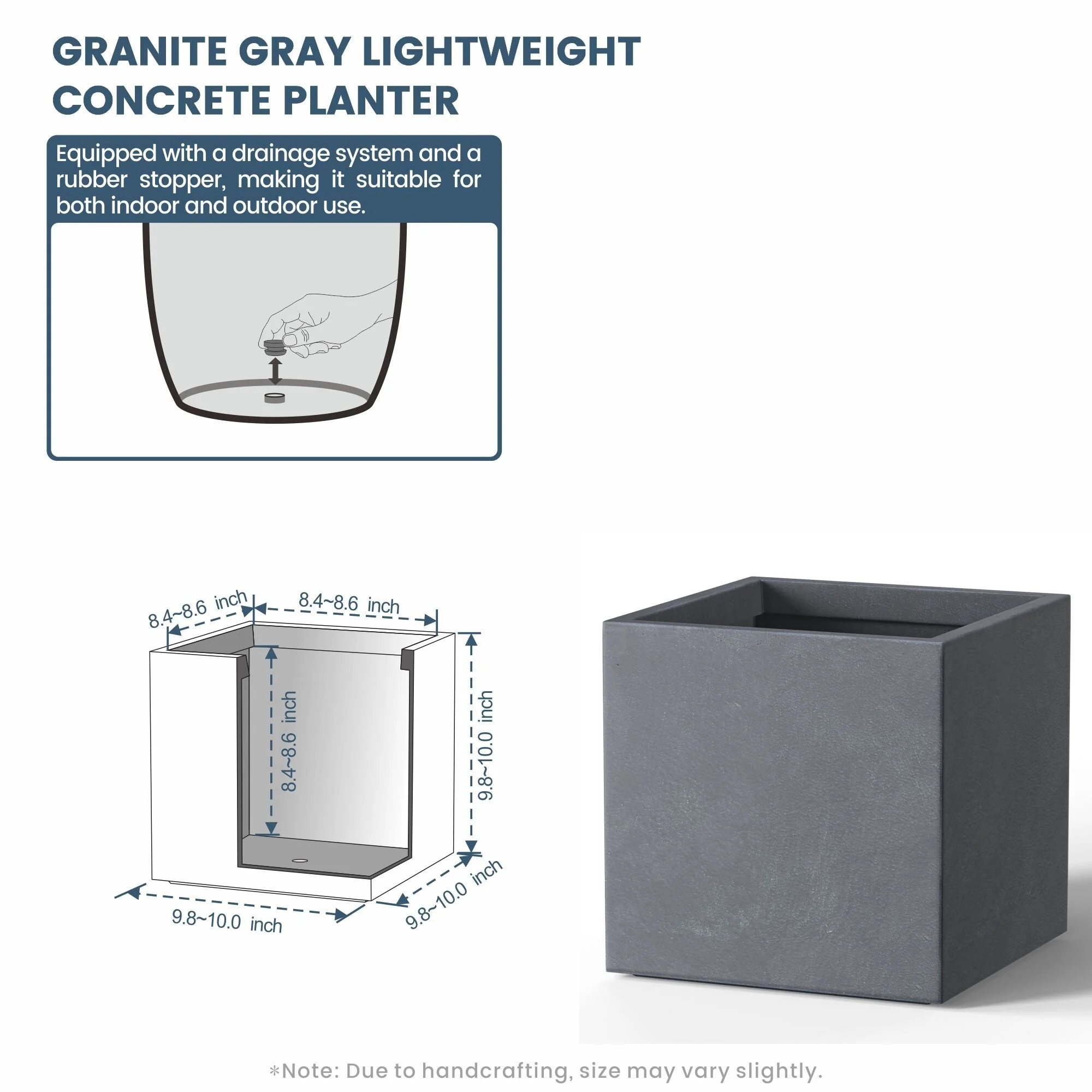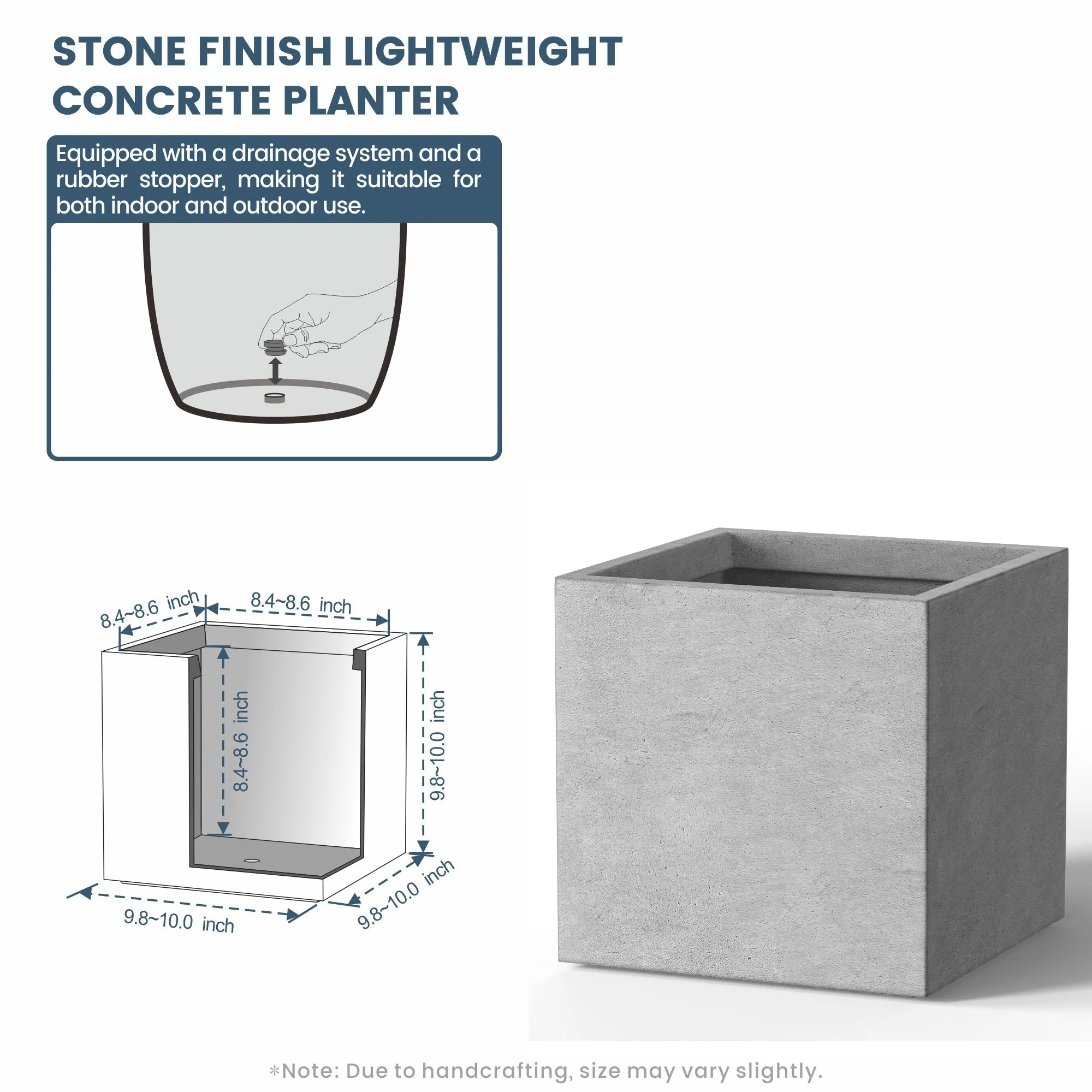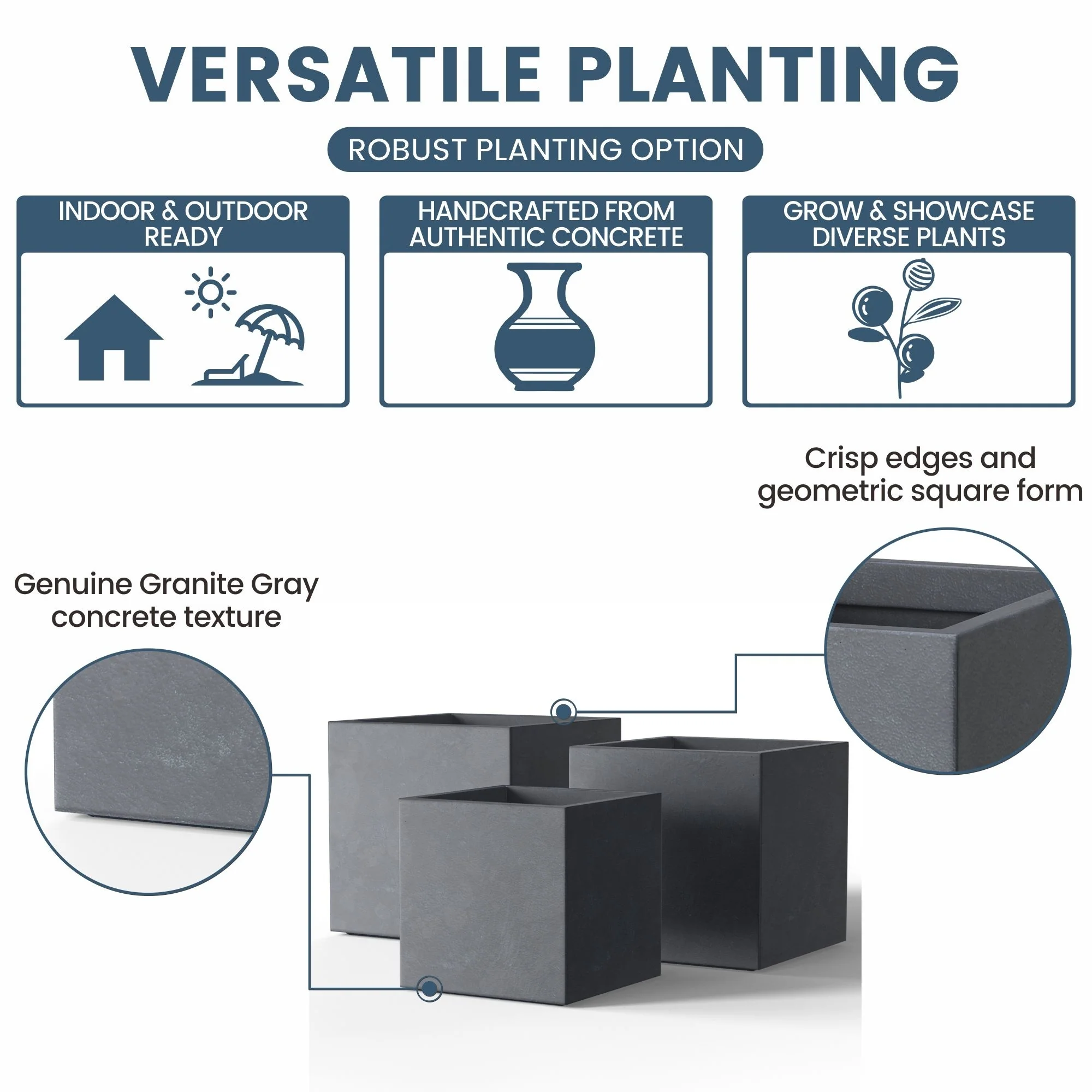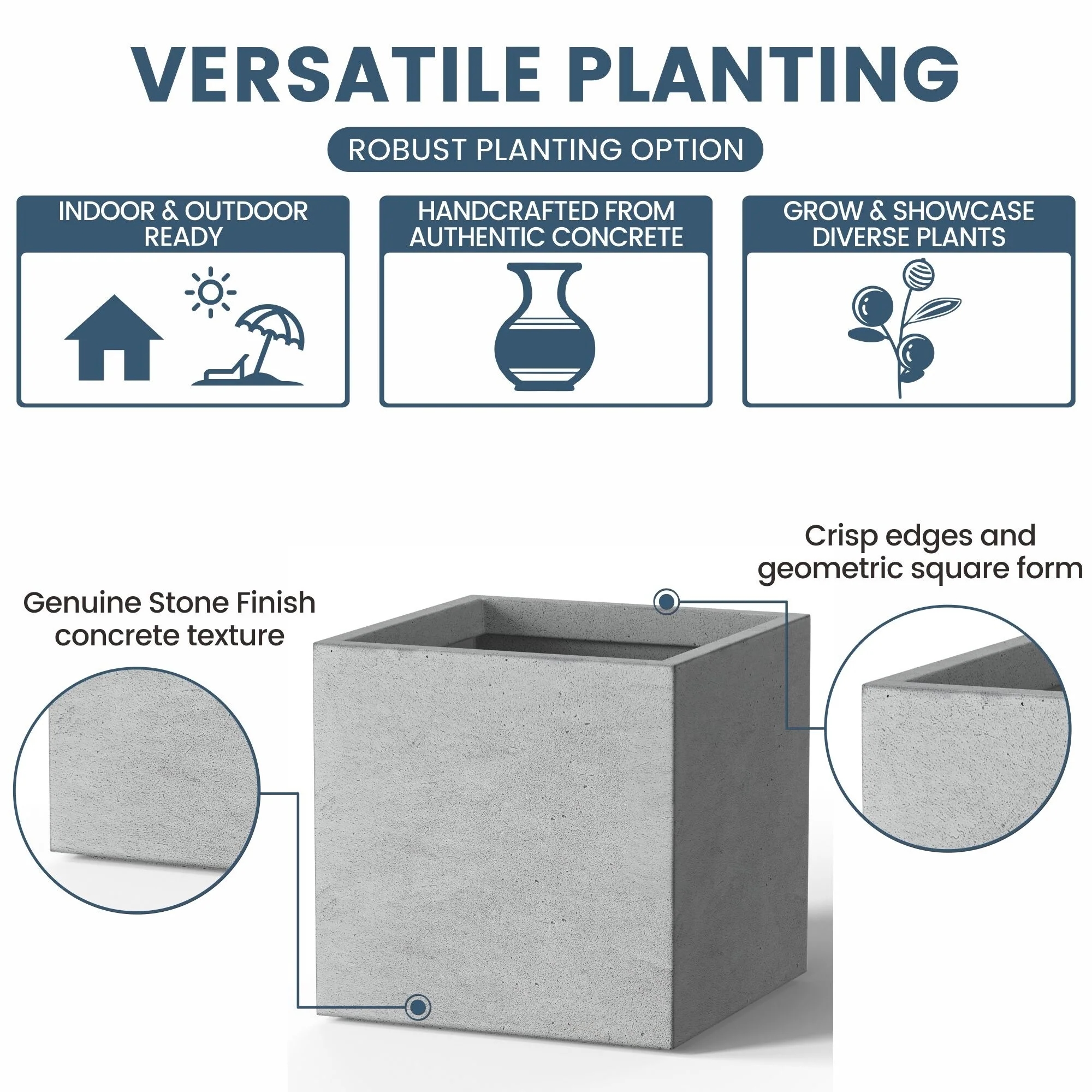*Rust Resistant: With no metal parts to worry about, these square cement planters resist rusting, ensuring a pristine look through all weather conditions