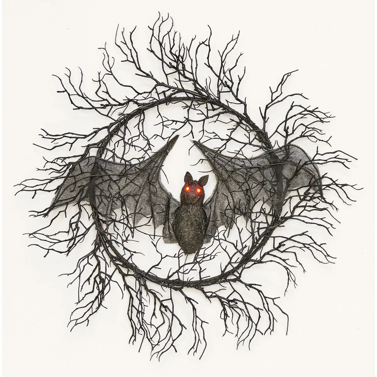 22 Plastic Twig Halloween Wreath with Light Up Eyes Bat - 22