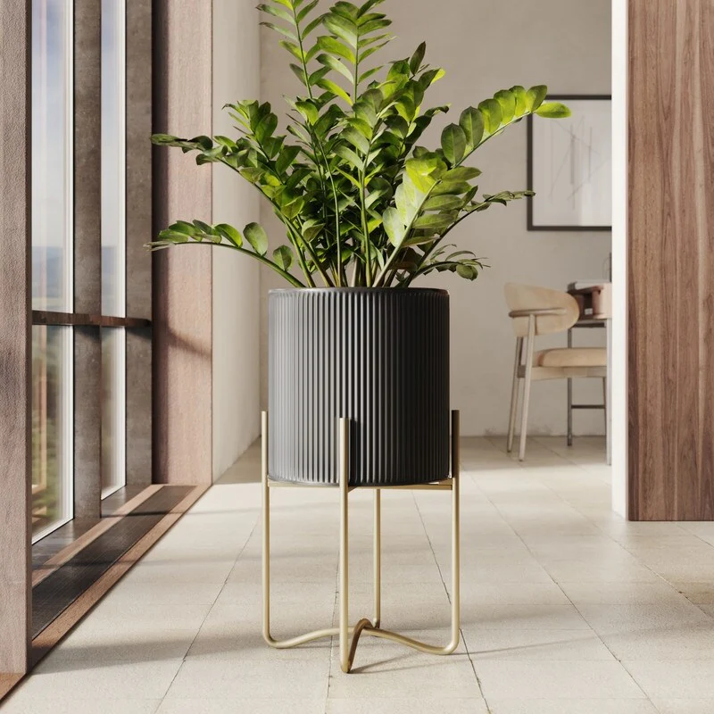Everett Black Mid-Century Modern Indoor Metal Pot Planter with Tall Metal Base