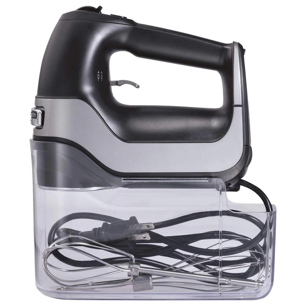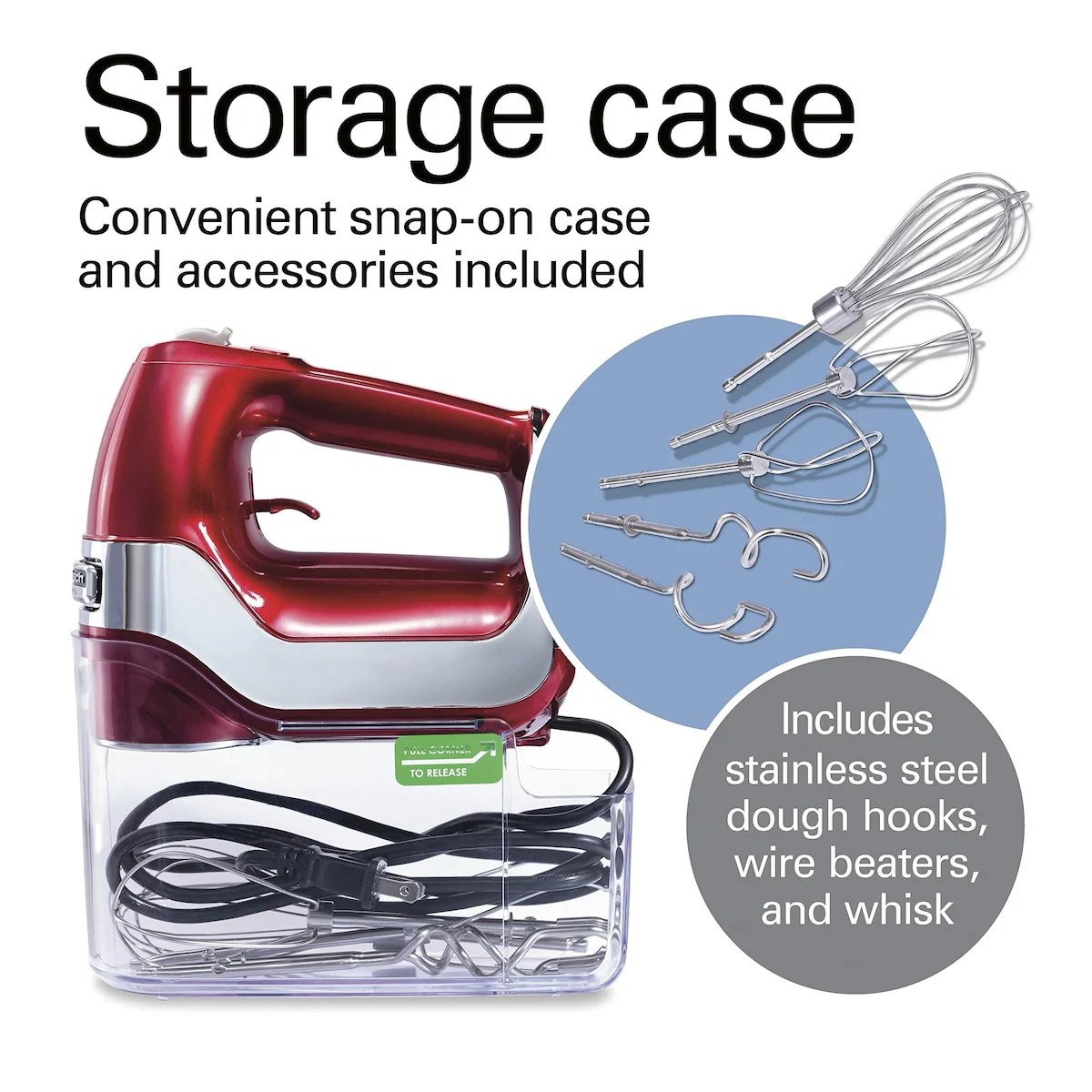 Includes snap-on storage case with beaters & whisk. Keeps everything in one place. Stainless steel attachments are dishwasher-safe.