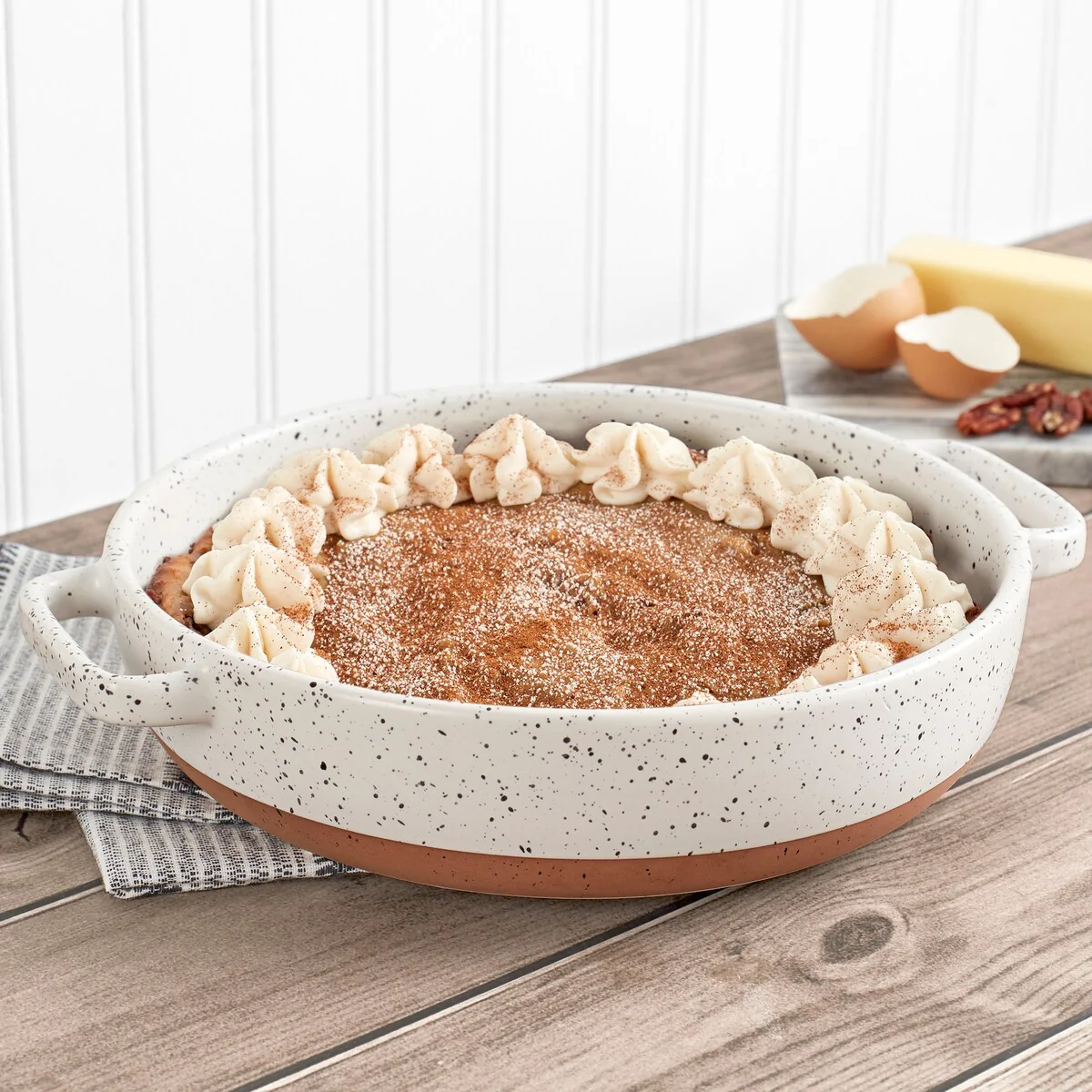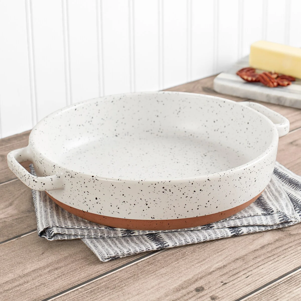 The Speckle Collection from Denmark Tools for Cooks blends modern simplicity with rustic elegance for your everyday kitchen. They have a unique, sleek speckle design, perfect for casual or formal occasions. These baking dishes, crafted from high-quality stoneware, offer excellent heat retention and even cooking, resulting in perfectly cooked dishes. The wide handles are comfortable and secure, providing balance and stability for easy maneuvering. The beautiful non-stick surface is non-porous, non-reactive, and scratch-resistant, with rounded corners to ensure your meals slide off the surface effortlessly with less time spent cleaning stubborn food residues and tedious scrubbing sessions. Perfect for savory casseroles or sweet cobblers, these versatile baking dishes have you covered. Don't miss out on the ultimate addition to your kitchen!