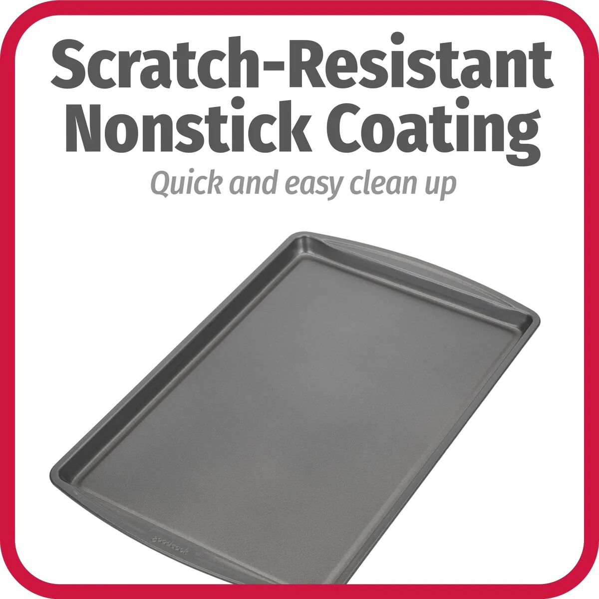 Use to bake cookies, roasting vegetables, heating up frozen pizza rolls, etc. Nonstick coating allows for food removal and easy cleaning. Designed to distribute heat evenly for thorough baking. Professional gauge steel construction protects against warping, staining, breaking or scratching. Metal spatula safe. Dishwasher Safe. Commercial weight.