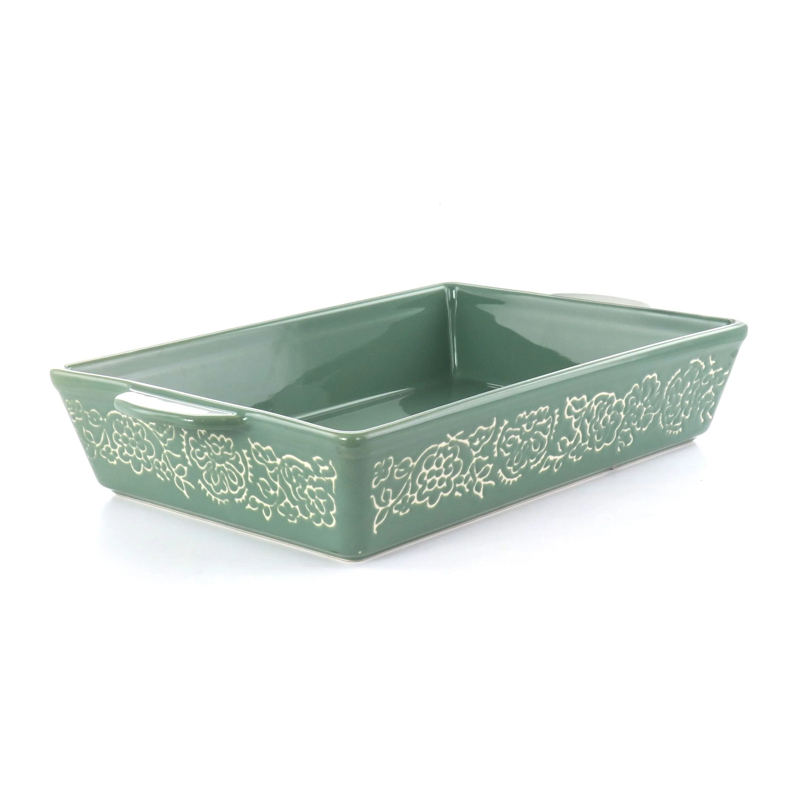 This Laurie Gates 2 Piece Wax Relief Stoneware Baker Set in Red and Mint brings a colorful pop of rustic and timeless beauty to any kitchen. This set includes one 15.75' baker in mint and one 13.75' baker in red, both with intricate hand decorated wax relief patterns making them unique. The tough stoneware construction and glossy coating means these are dishwasher, microwave, and oven safe to meet all your cooking and baking needs. Make your perfect pie or casserole, and then serve it to your guests all in the same pan!Set: 2 Piece Baker SetMaterial: StonewareFinish: GlossyShape: RectangleColor: Red and MintMicrowave SafeDishwasher SafeOven SafeSet Includes:One 15.75' Large BakerOne 13.75' Medium BakerPer Item Measurements:Large Baker: 15.75' length, 9.5' width, 2.75' height, 5.85lbs weightMedium Baker: 13.75' length, 8' width, 3' height, 4.60lbs weight
