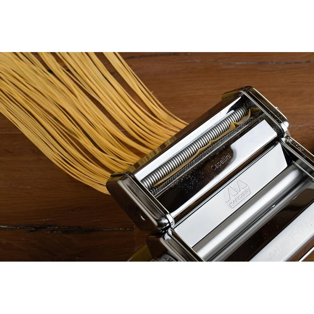 Marcato’s Capellini attachment for the 150 pasta machine cuts capellini noodles for making pasta at home. Made from chrome-plated steel with anodized aluminum rollers. Wipe clean or use a stiff brush