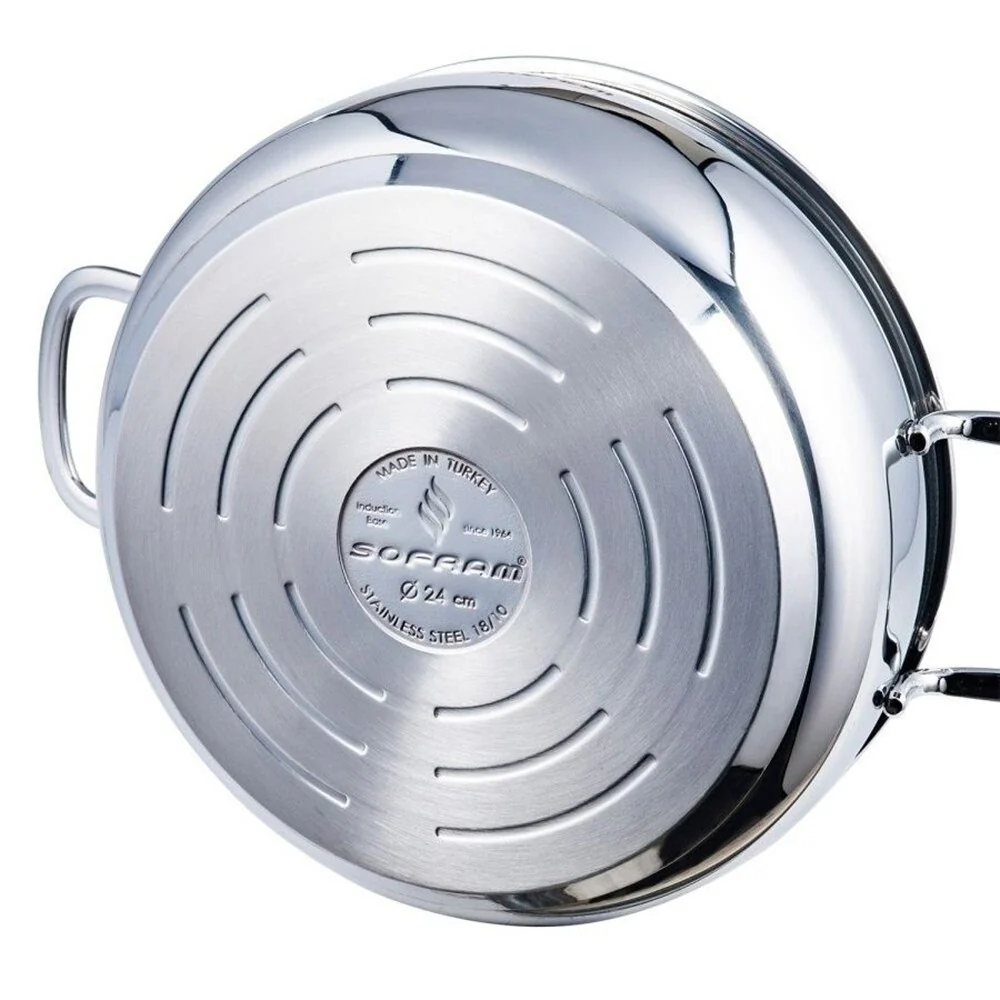 The low casserole is made of 18/10 stainless steel and has a robust 3-layer capsule base. The capsule base provides fast heating and even heat distribution. Products do not burn and retain their taste. Another essential advantage of the cookware with the multi–layered capsule base is that it has improved heat retention.