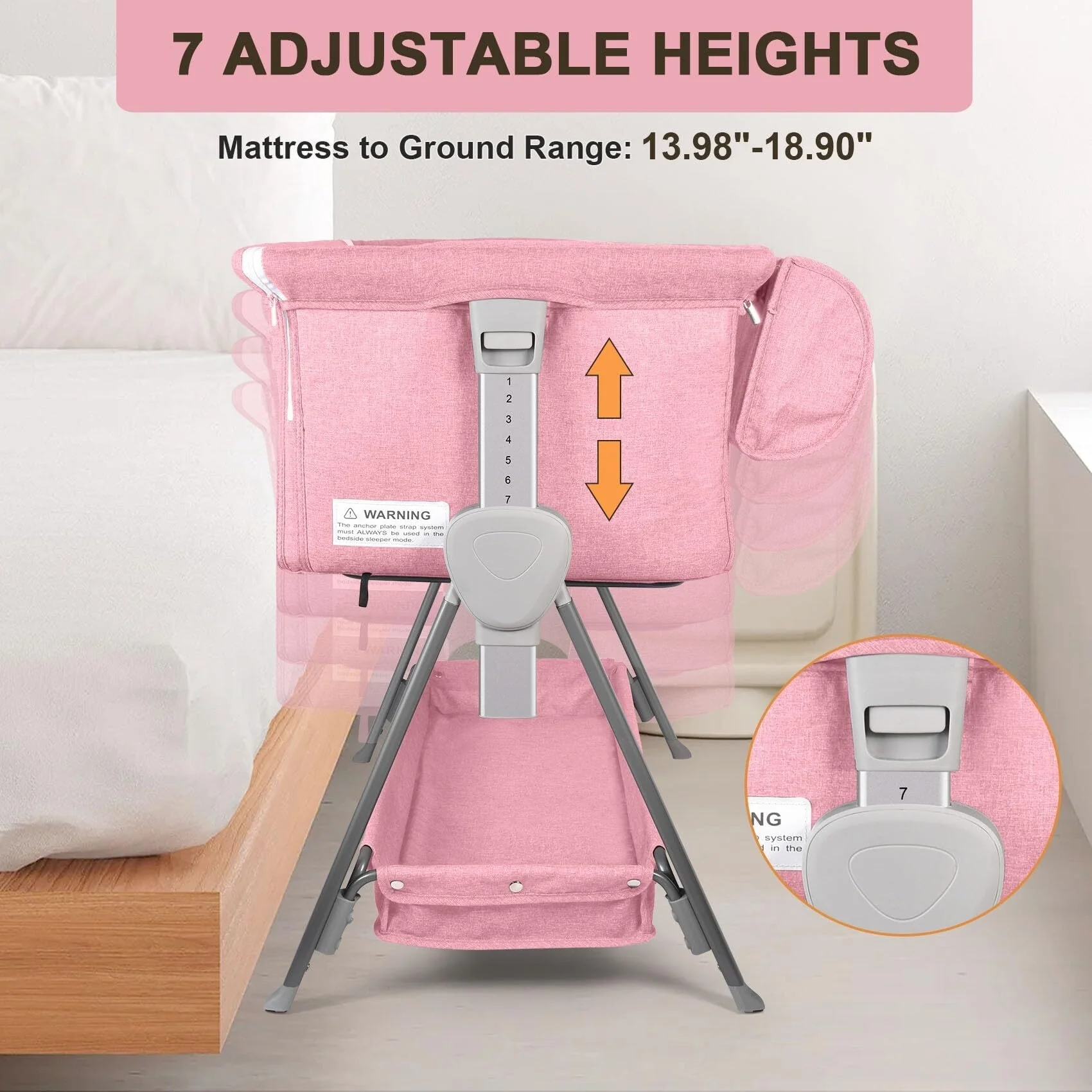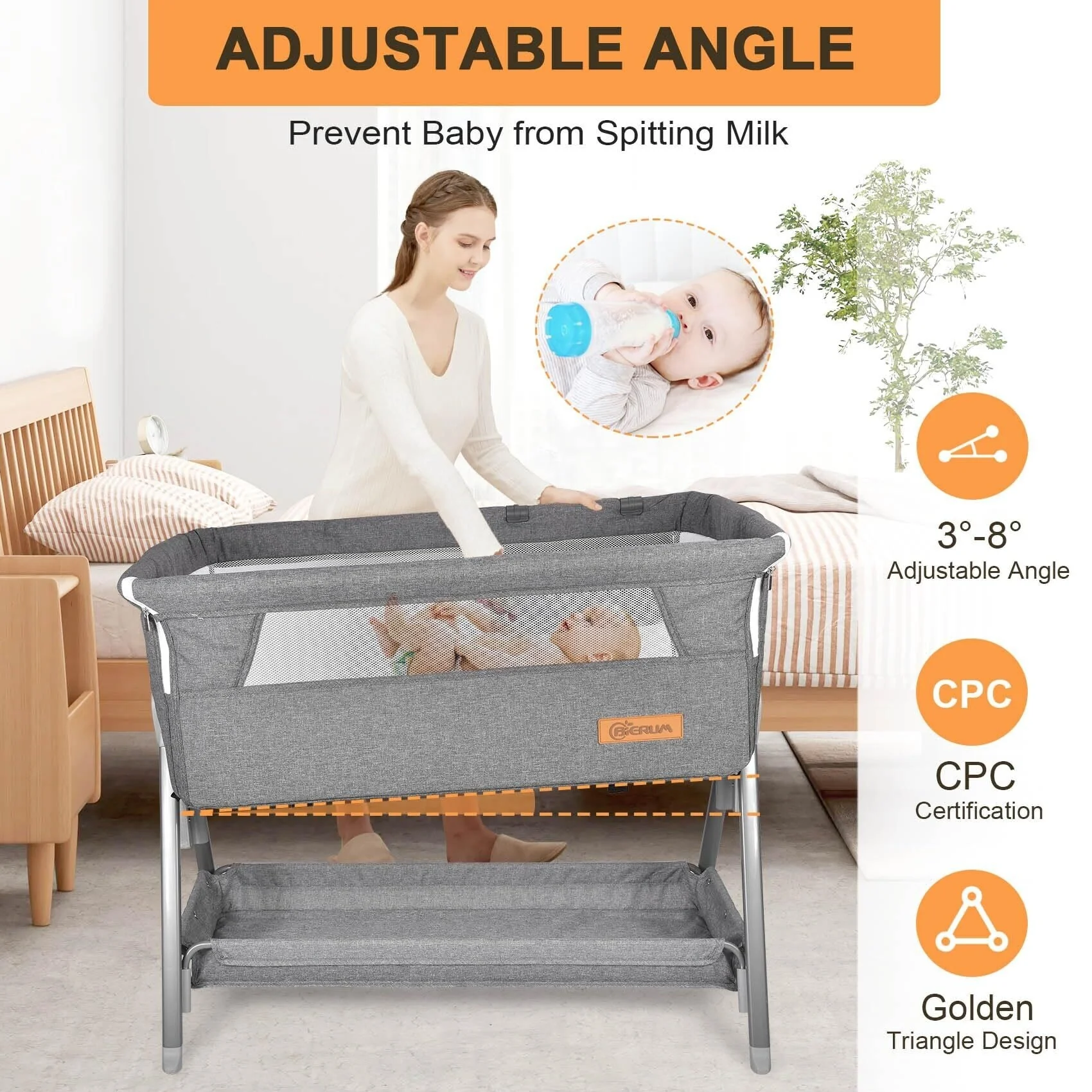 ?? 7 Adjustable Heights & Single-sided Angle: Bedside bassinet features scientific seven gear adjustment levels(14-18.9 inches from bassinet mattress to the ground). Not only limited to the bedside, but also suitable for all kinds of sofas, or other places. This will make it easier for you to care for your baby, even in the middle of the night. The newborn bedside crib also has a practical design. After feeding the baby, you can adjust the angle to prevent the baby from spitting milk.