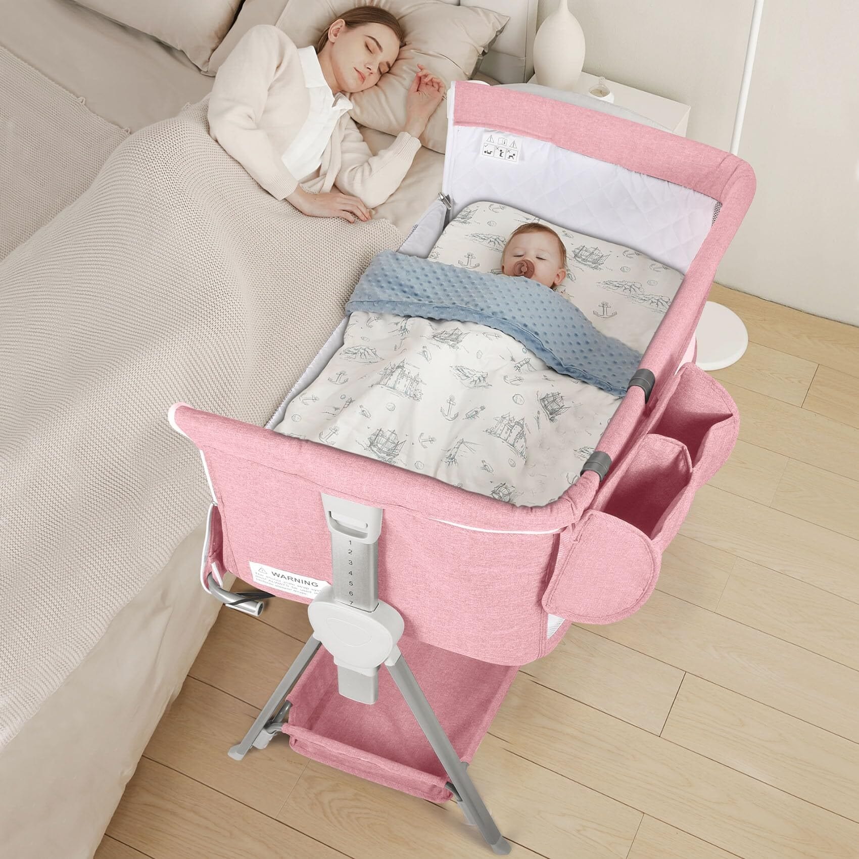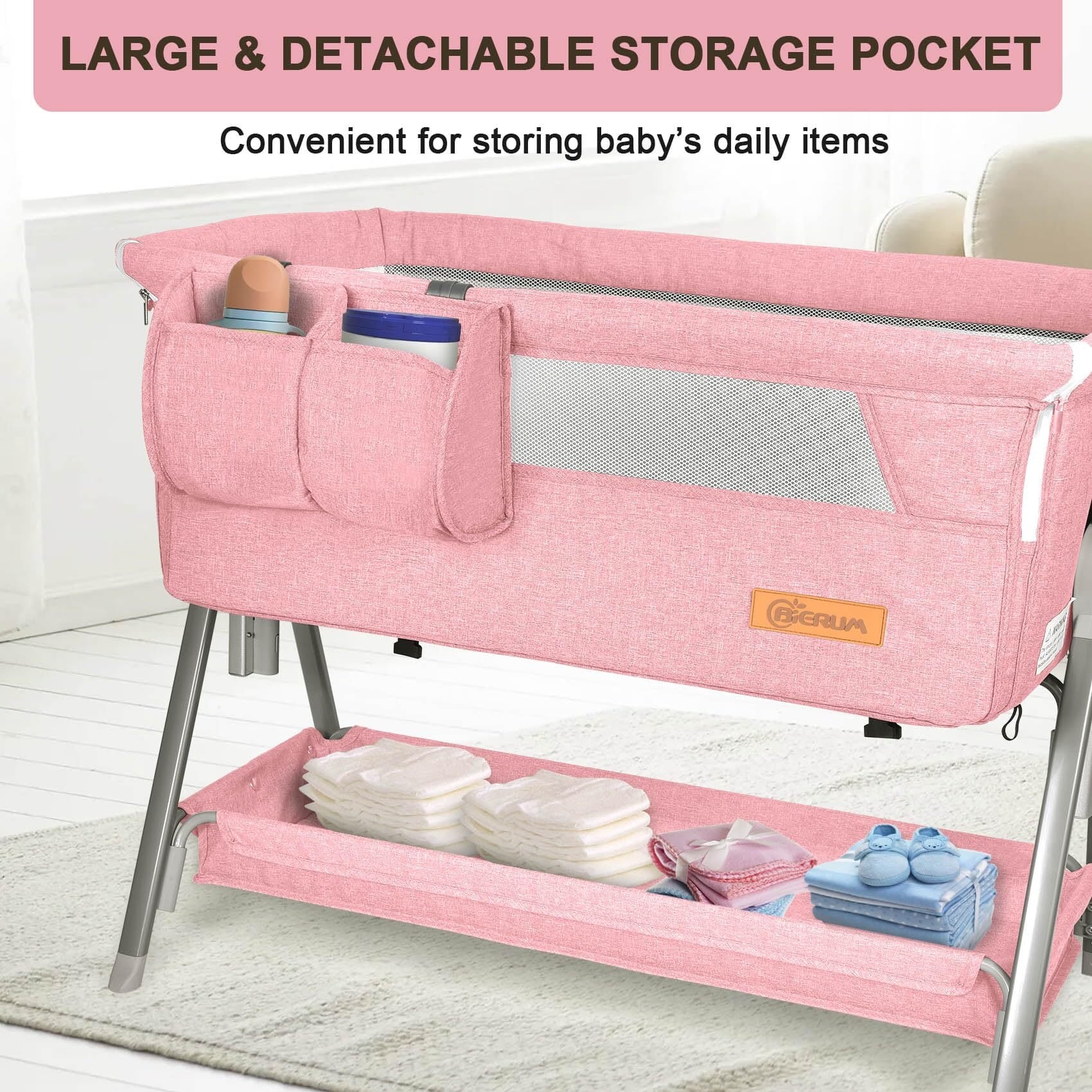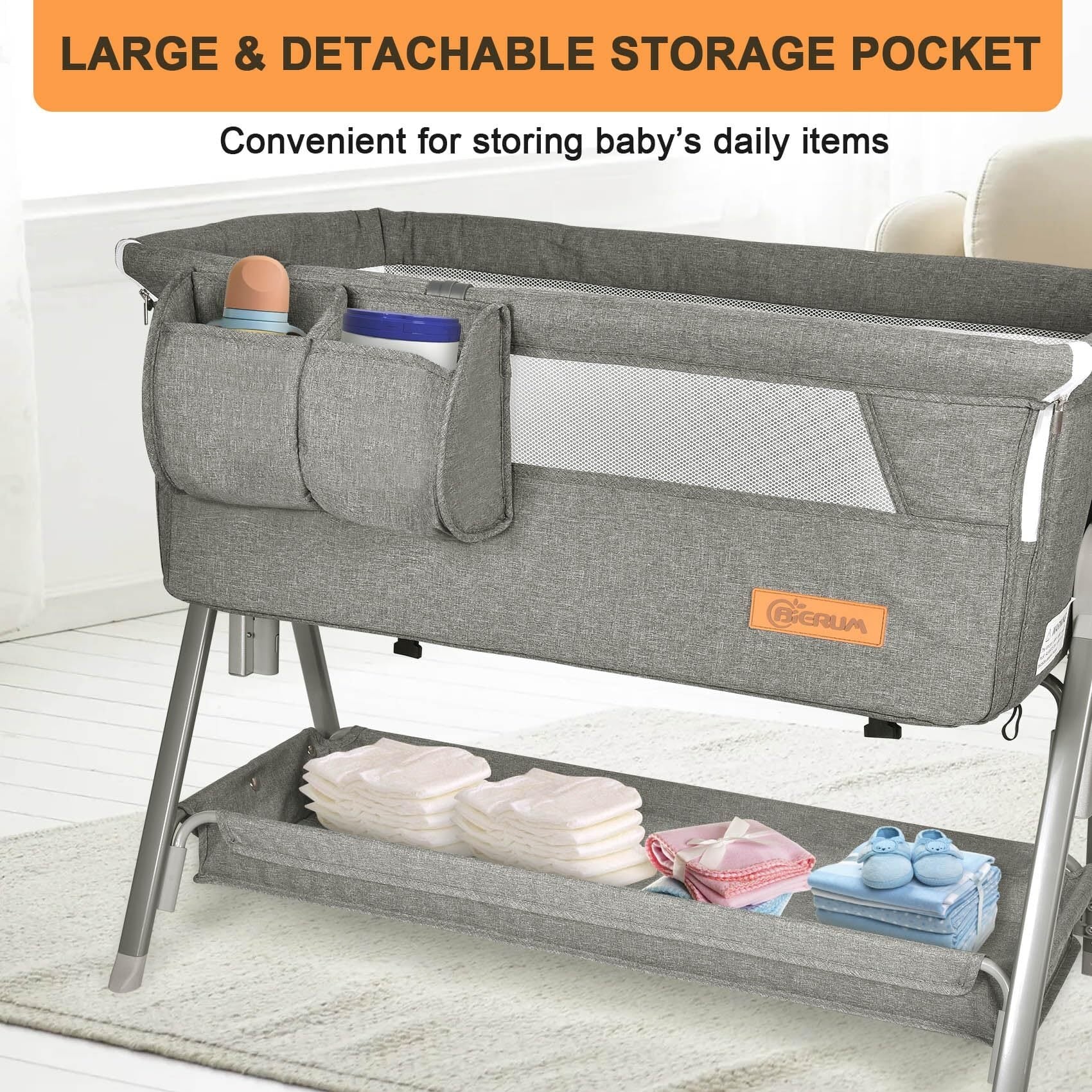 ?? Large Storage Space & Tool-free Assembly: Bassinet can be assembled and disassembled in 3 minutes, tool-free assembly. There is a large storage basket under this baby crib, you can put lots of baby stuff here and grab them for daily use. The bassinet also has a side pocket for parents to put milk bottles conveniently.