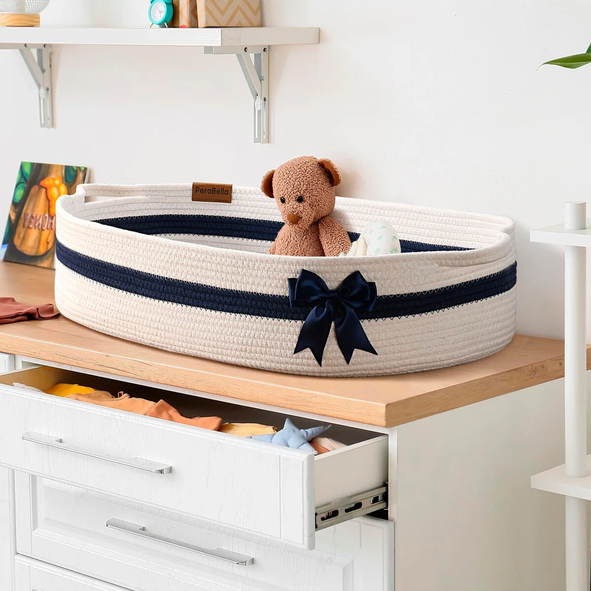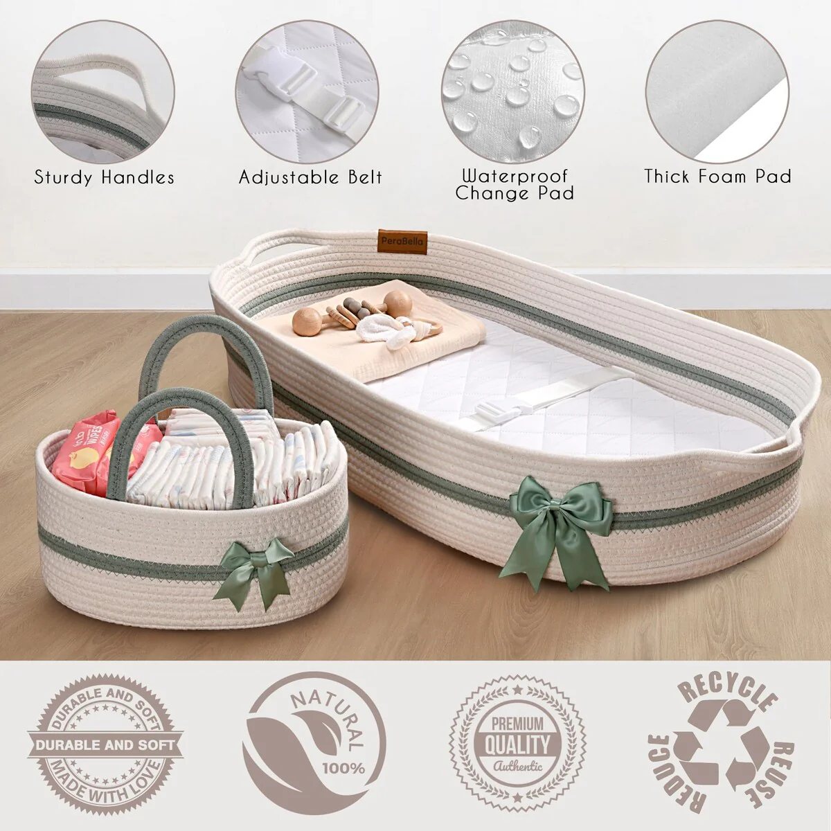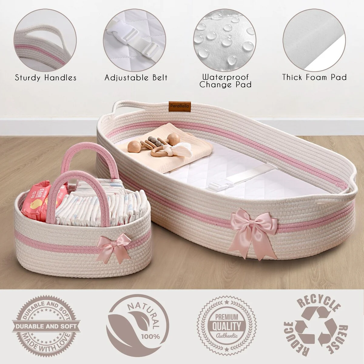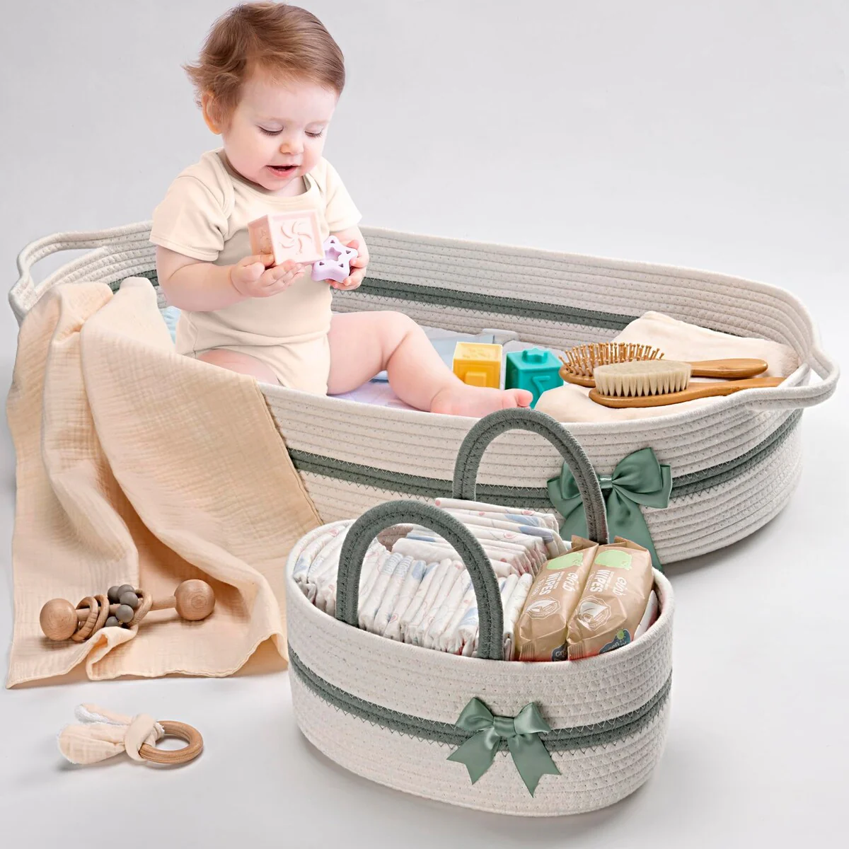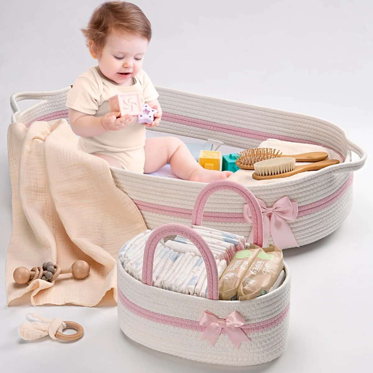 MULTI-FUNCTIONAL & EASY TO CARRY: Our diaper changing station features durable handles. It can be used on a baby changing table, dresser, bed, sofa, or car while traveling. As the baby grows, the basket can be used for toys or as a stylish storage option in any room of your home. Additionally, it can serve as photography props, laundry baskets, toys, or clothing storage organizer. See more product details