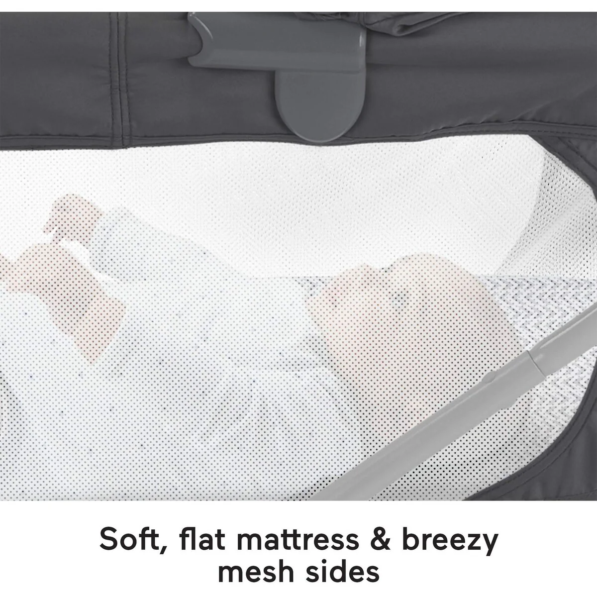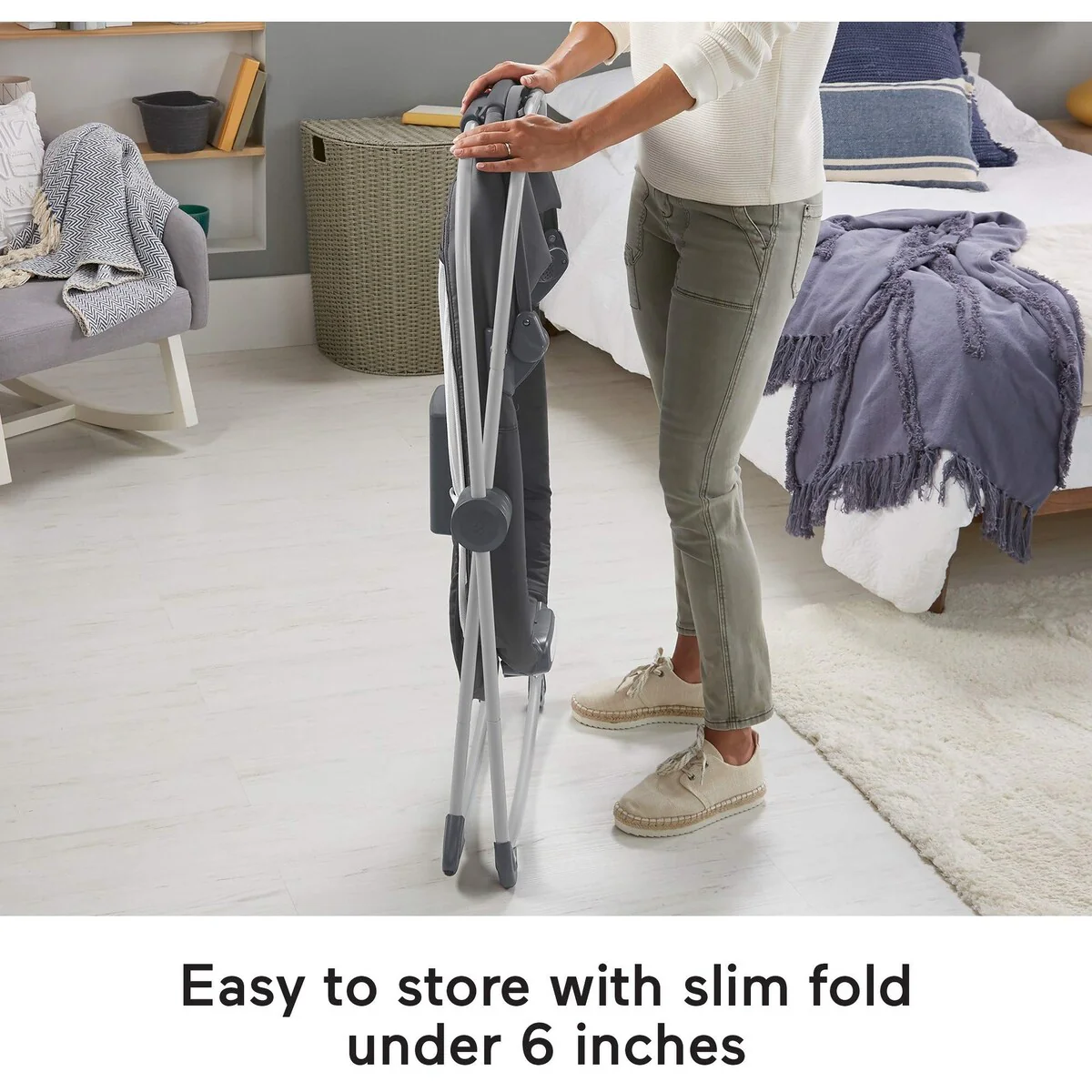 Bassinet has lightweight frame that locks for stationary mode and slim fold (under 6 inches) for travel or storage
