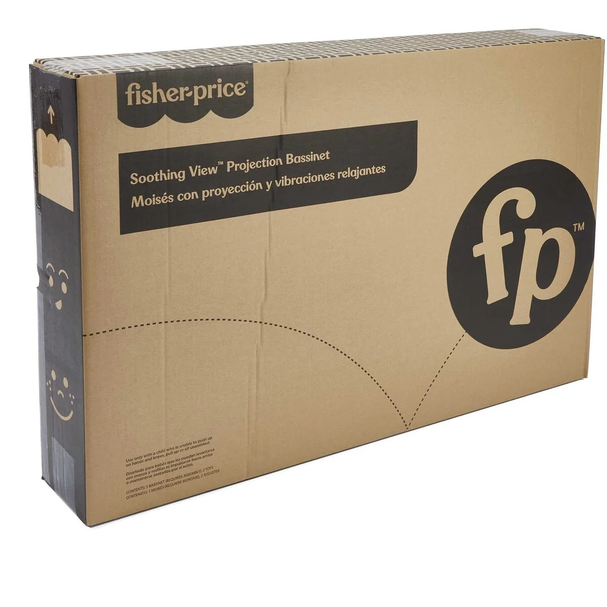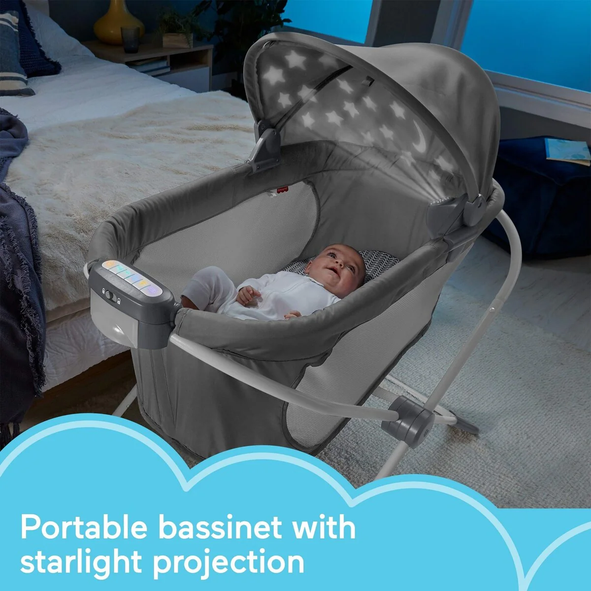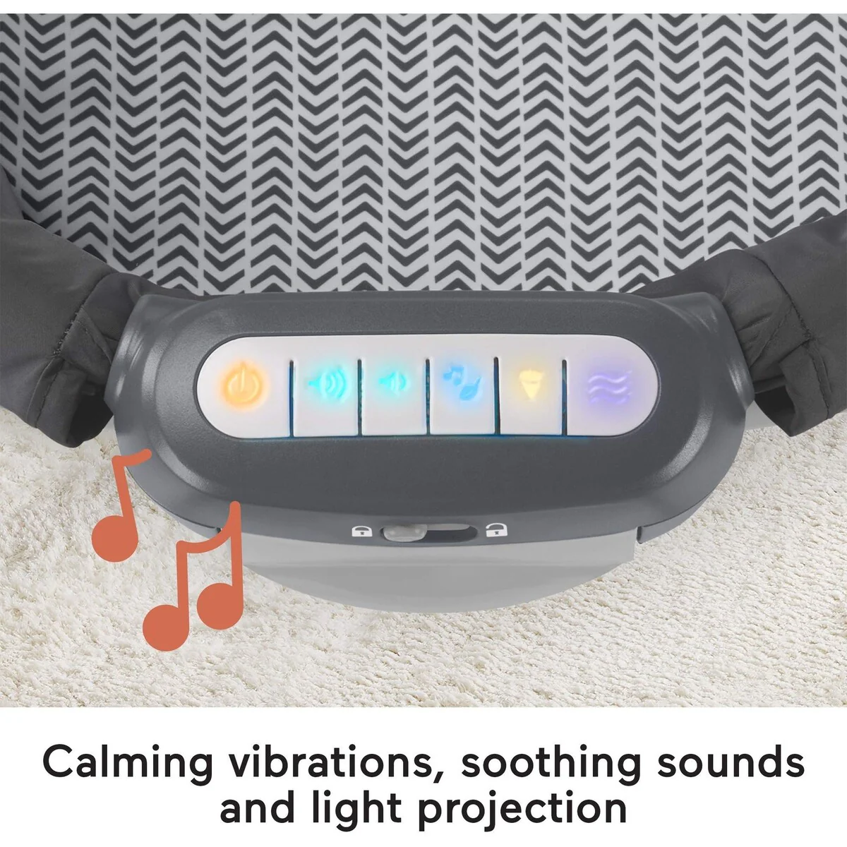 Retractable canopy for light projection, two linkable toys, calming vibrations, music, and sounds help soothe baby to sleep
