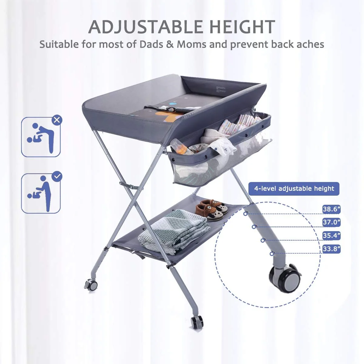 ❀[PORTABLE & FOLDABLE DESIGN] - The COMPACT PORTABLE baby diaper station is equipped with 4 heavy duty lockable mute universal wheels that can move on rough ground and plush carpet extremely easily and silently. Easily FOLD the diaper changing station to save space when finish baby's tasks. Nevertheless, the uniquely designed support plate allows you fold directly without pulling it out time by time
