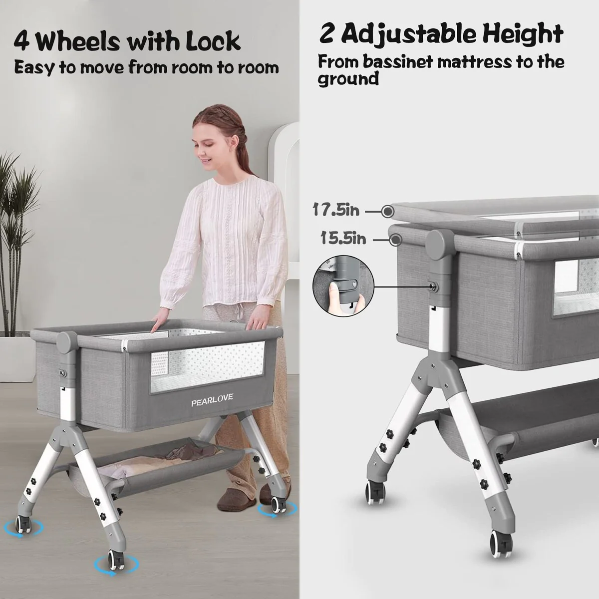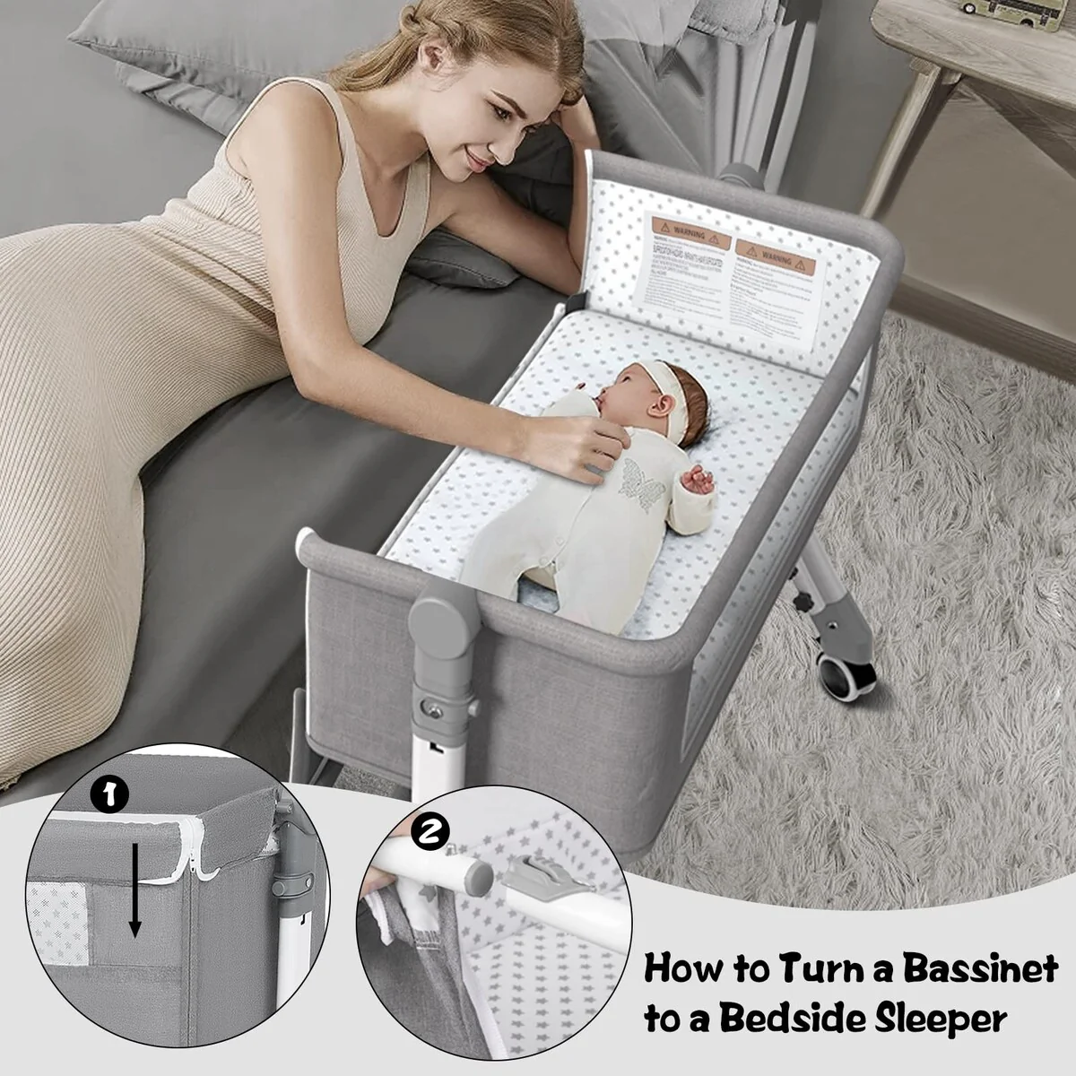 🤱 Easy Nighttime Feedings & Diaper Changes: One side of the baby bassinet bedside sleeper can be zipped down for diaper changes and feedings, it's convenient for you to use and easy to access your baby during night-time feeding. Visible mesh on both sides of the bedside bassinet ensures airflow, allowing your little one to sleep comfortably. Besides, baby bassinets come with safety straps, tie the bassinet to the adult bed to ensure it cannot move when you fall asleep.