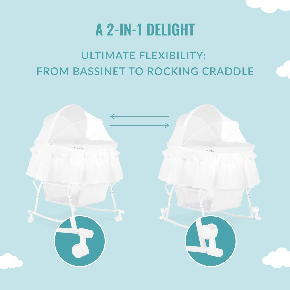 DUAL USE: Spacious and roomy, the Lacy is the ideal bassinet for your new born. And when LO needs soothing, rotate its wheels upwards to convert the Lacy into a rocking cradle. Use from birth till 25 lbs/until baby can push-up/roll over unassisted