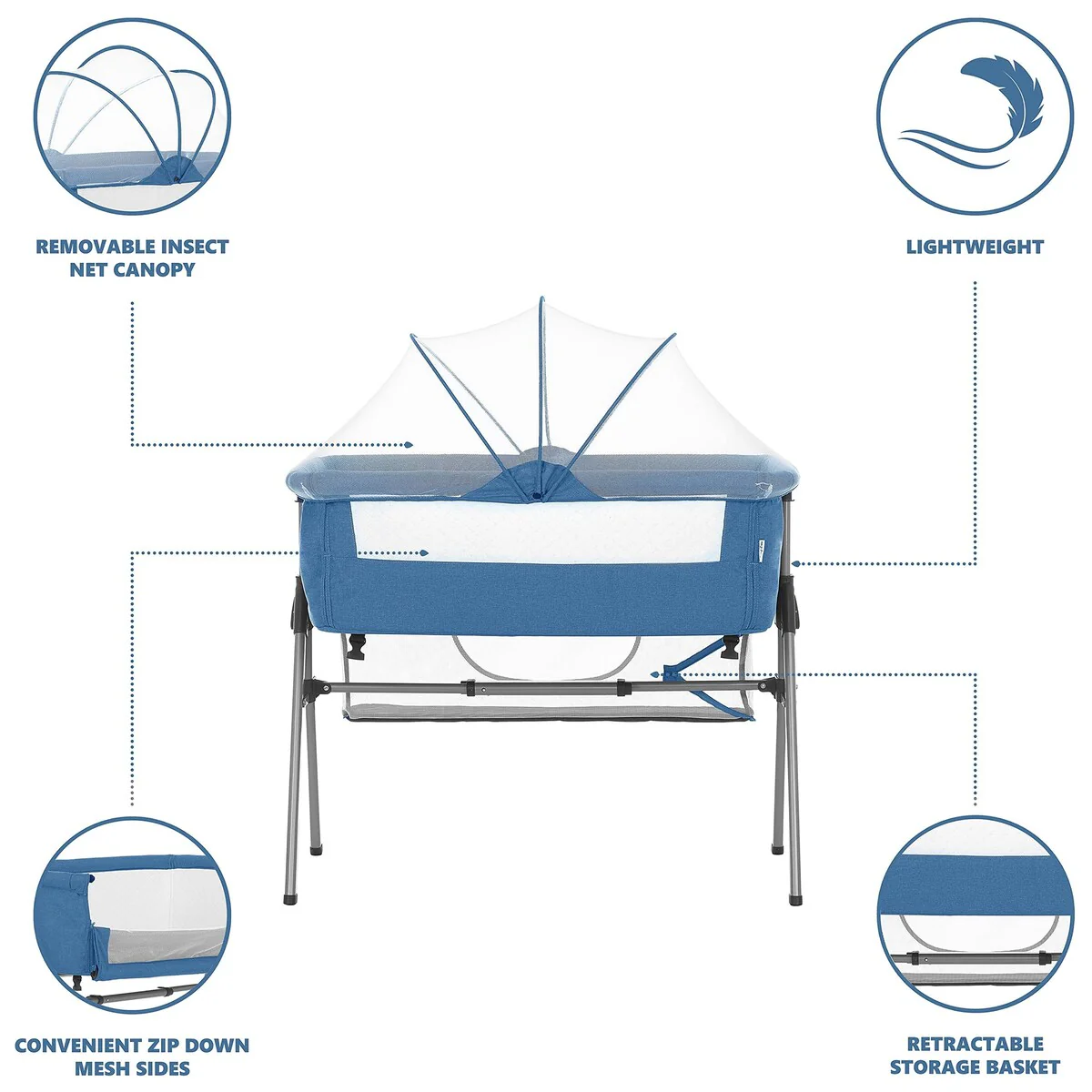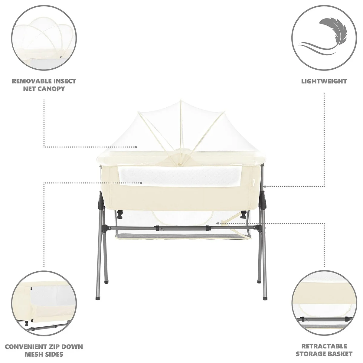 AMPLE VENTILATION - The Lotus is constructed with mesh panels on both sides that allow for smooth airflow and also provides parents an easy view of the baby. An optional mosquito net canopy comes handy while using the Lotus outdoors