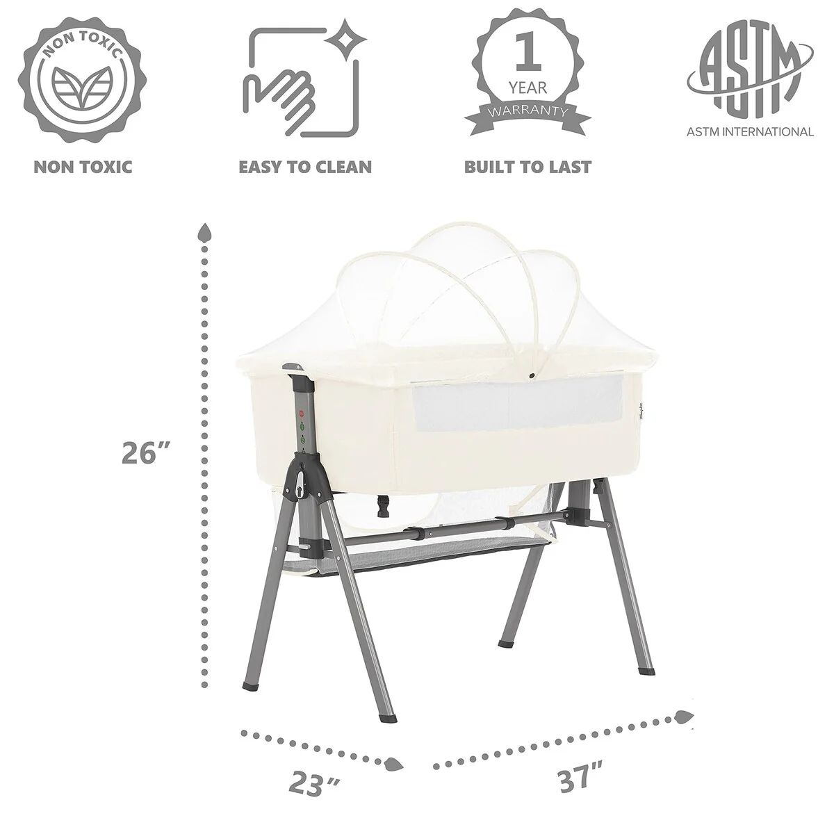 DIMENSIONS - 37L x 22.5W x 26H inches, Mattress pad dimensions: 32.5x 21x 1.Canopy height: 13 Carry bag dimensions: 37 x 22.5 x 3″ JPMA certified to meet or exceed all safety standards set by the CPSC and ASTM See more product details