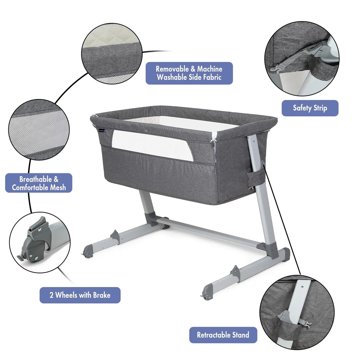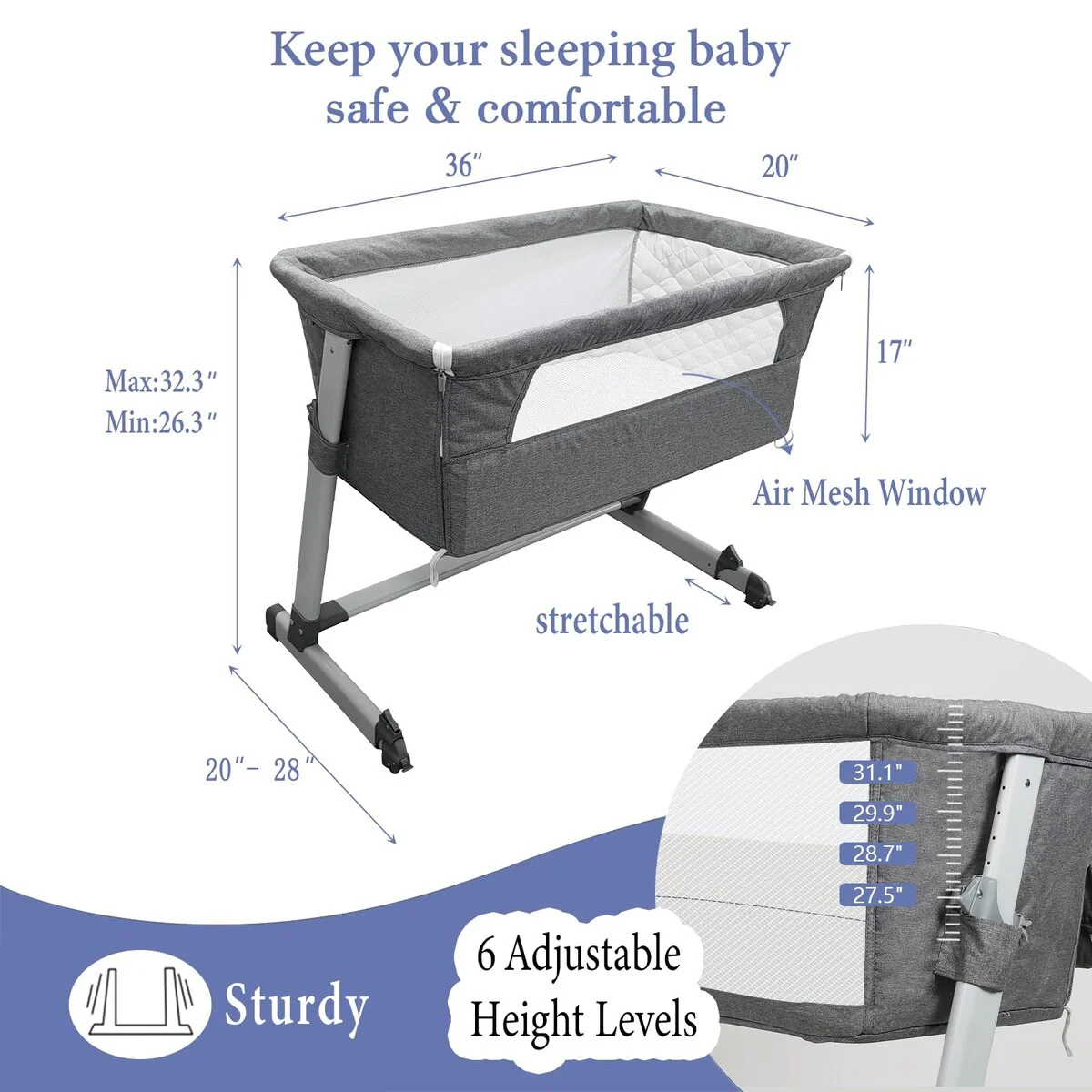 👪 6 Adjustable Height: Our baby bedside bassinet has 6 adjustable height positions (26.3'-32.3') Fits most adult beds and sofa. Adjustable feet can be retracted close to the bed, which can keep your baby closer to you.