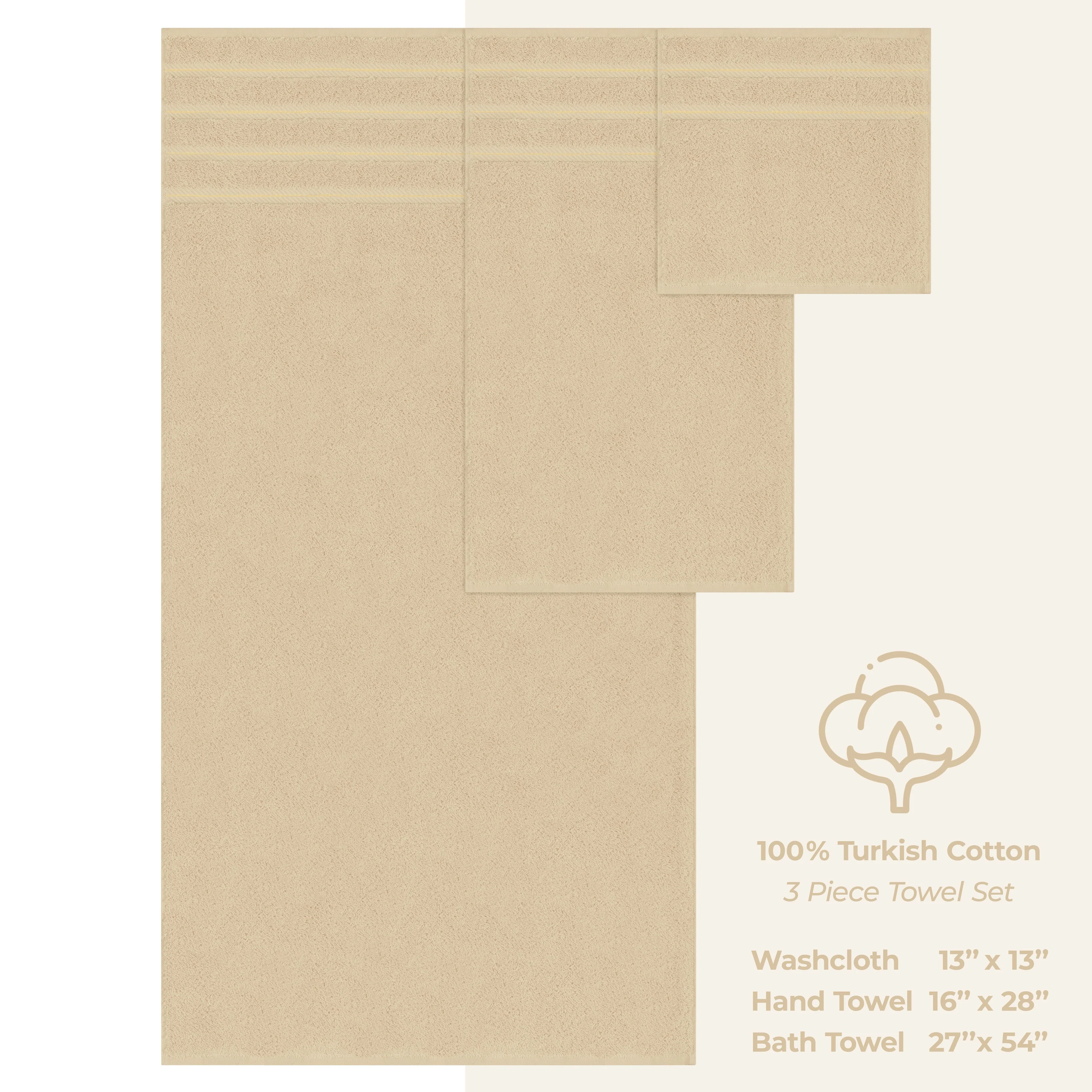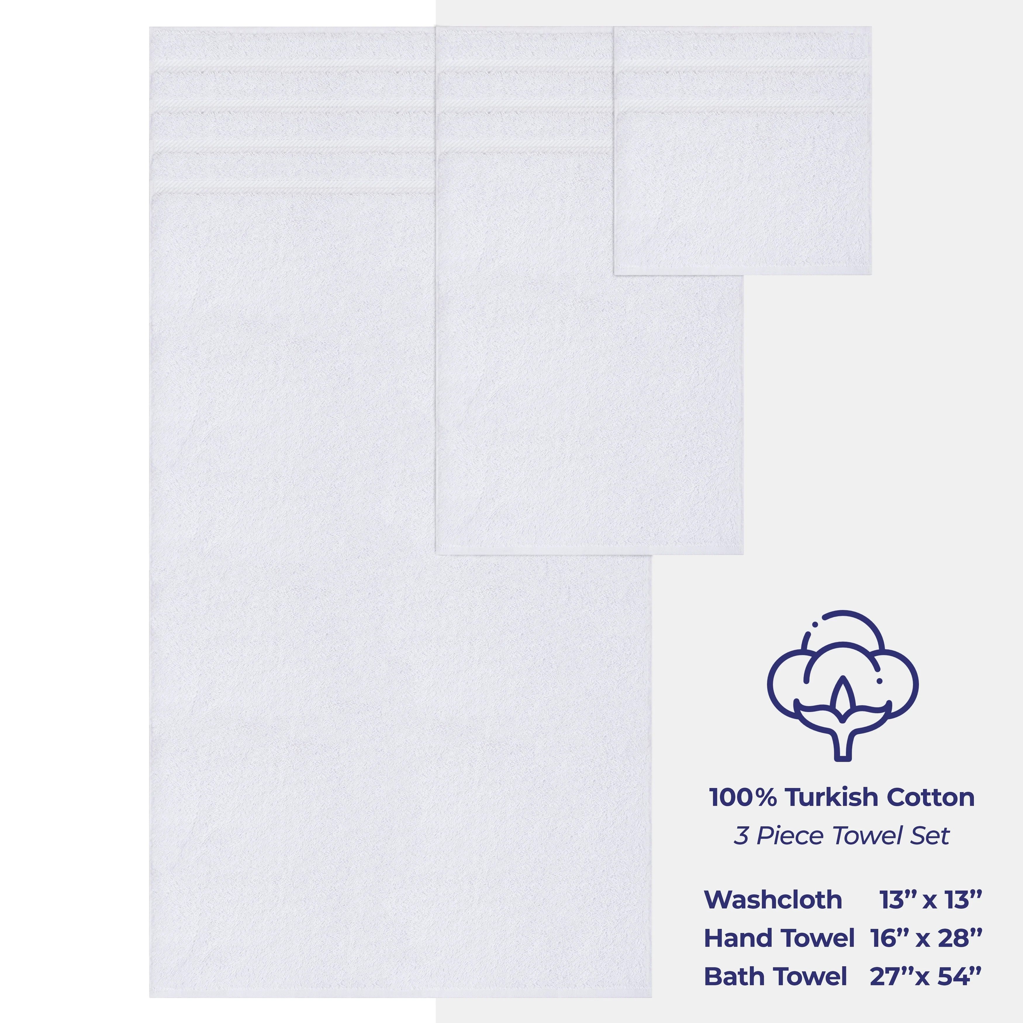American Soft Linen 3 Piece Bath Towel Set includes 1 Bath Towel of 27'x54', 1 Hand Towel of 16'x28' and 1 Washcloth of 13'x13'.