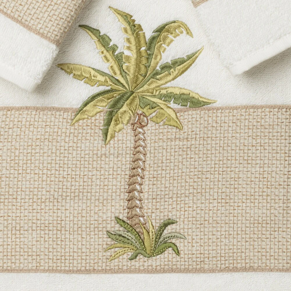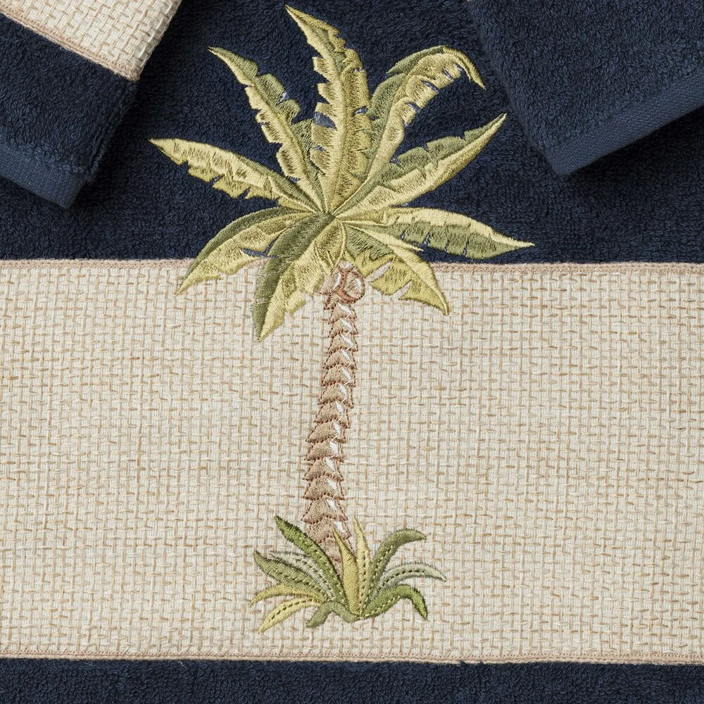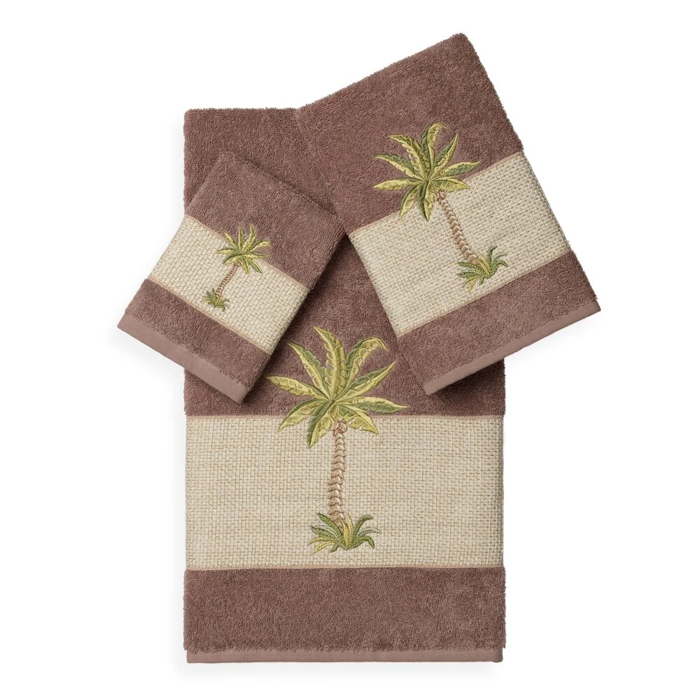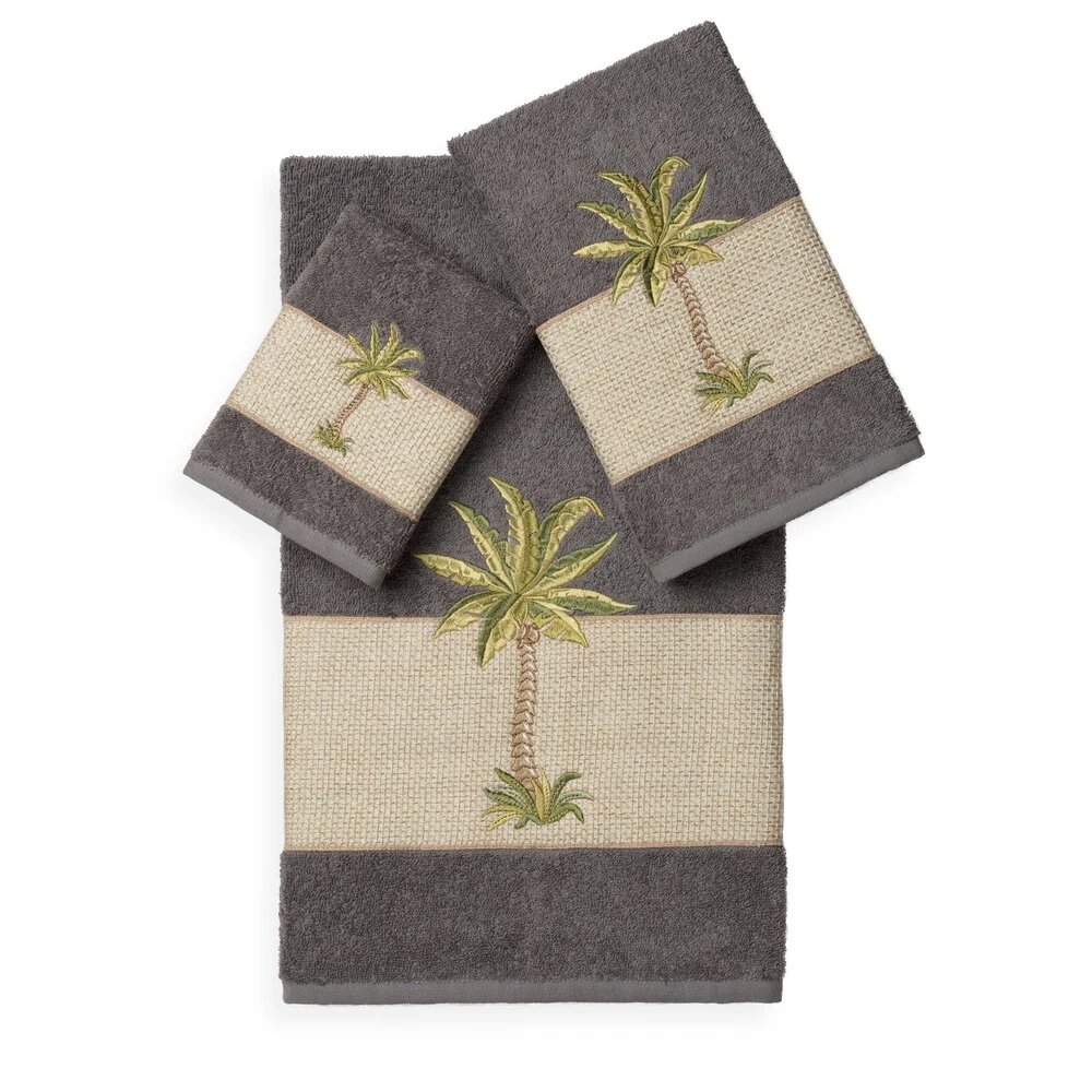 This authentic hotel and spa 3-piece towel set is made from plush, high end Turkish cotton for supreme absorbency and durability. These beautiful towels are embellished with a palm tree applique and embroidery design with a textured woven border to add that special touch to your bathroom.