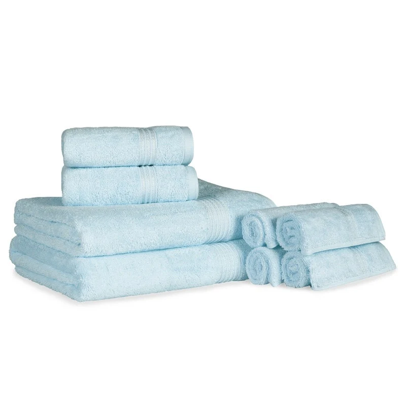Indulge in the luxury of the Blue Nile Mills Ibiza 8 Piece Towel Set. Crafted from premium Egyptian cotton, each towel is designed to be soft, plush, and highly absorbent, ensuring you dry off quickly and comfortably. The solid pattern and elegant rope-style trim add a touch of sophistication, seamlessly complementing both traditional and modern bathroom styles. This set brings a refreshing modern touch to any master bath, powder room, or guest bathroom, offering both style and functionality for your space.
