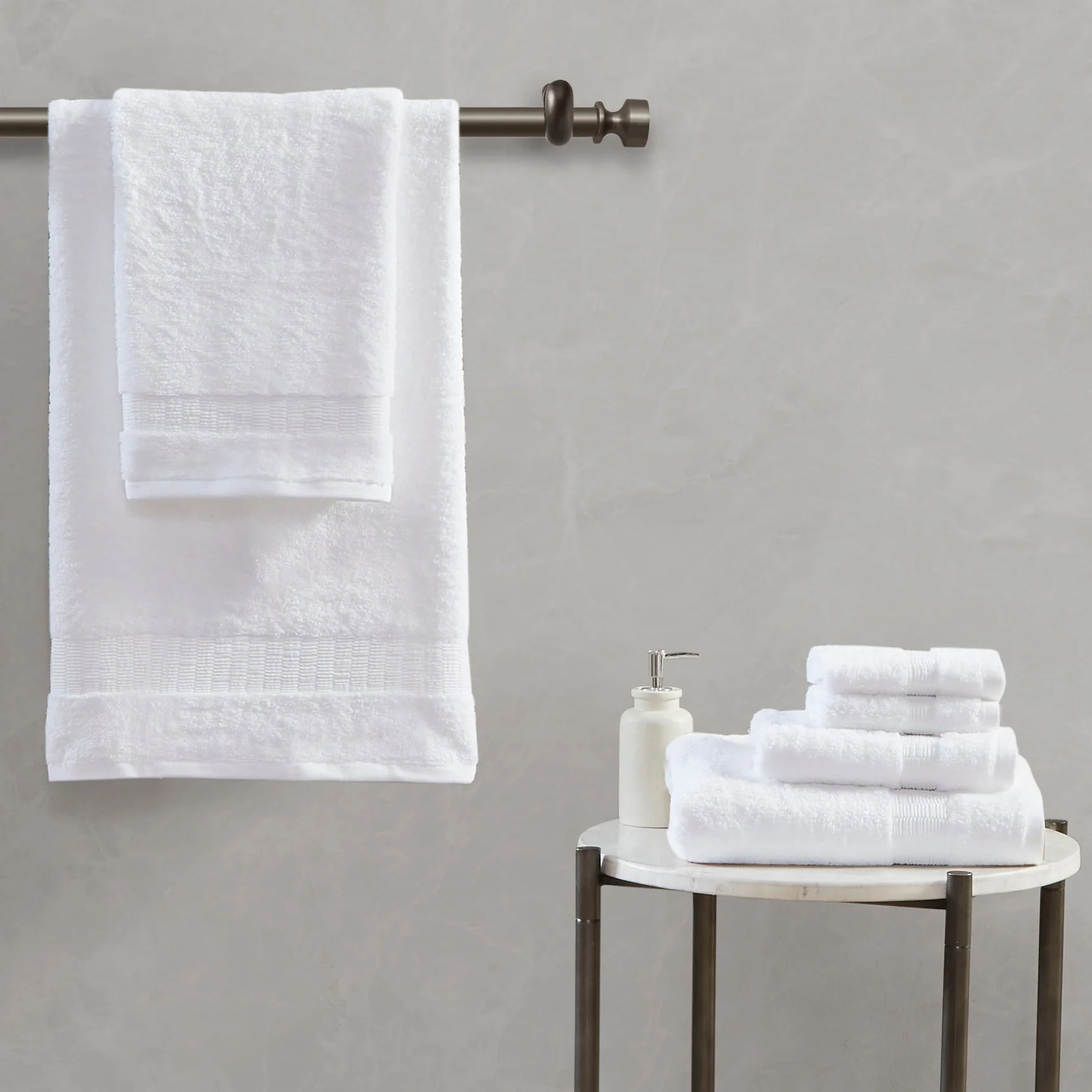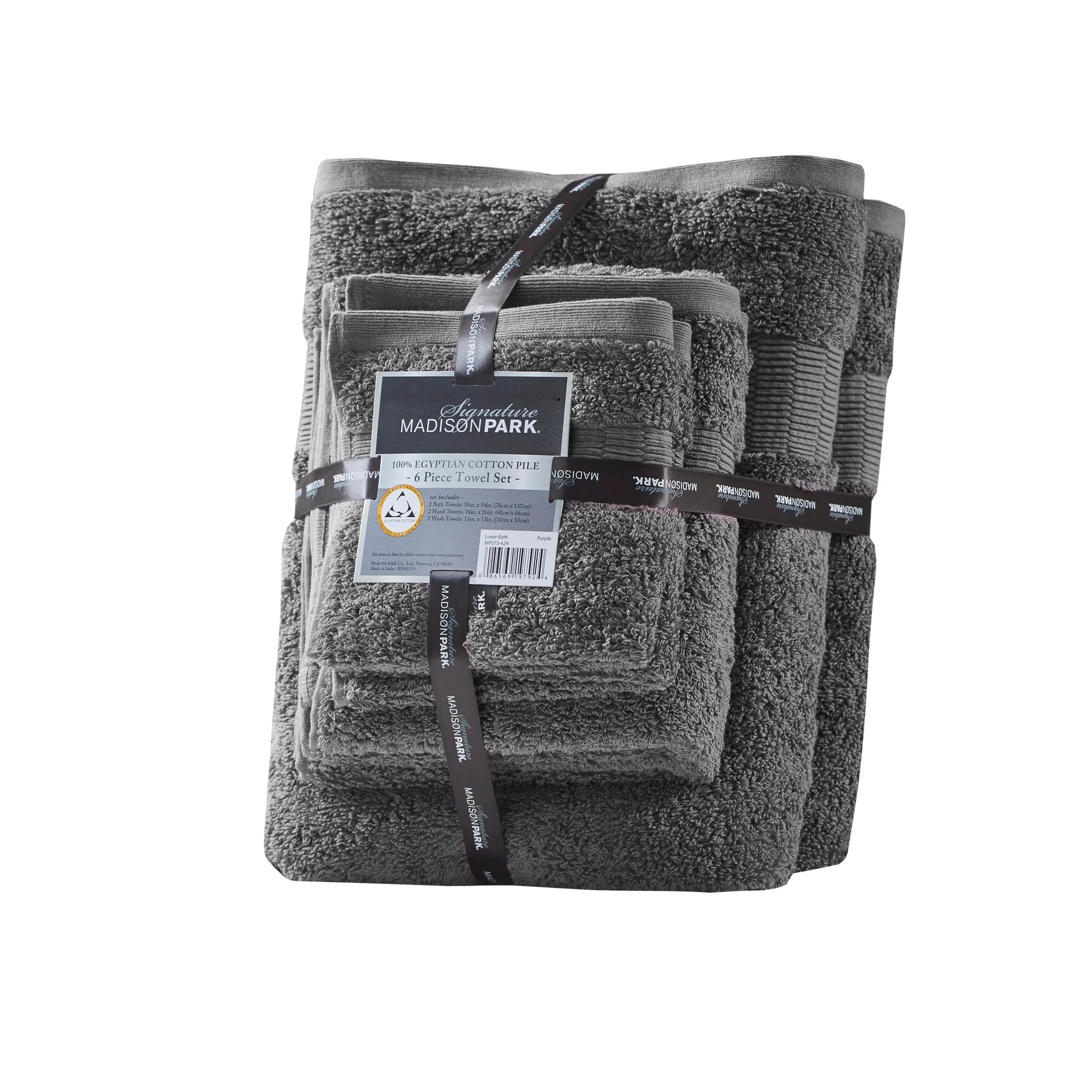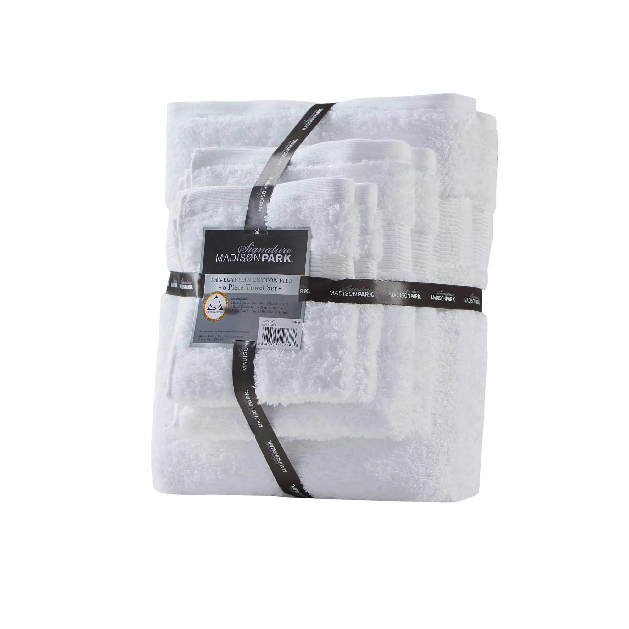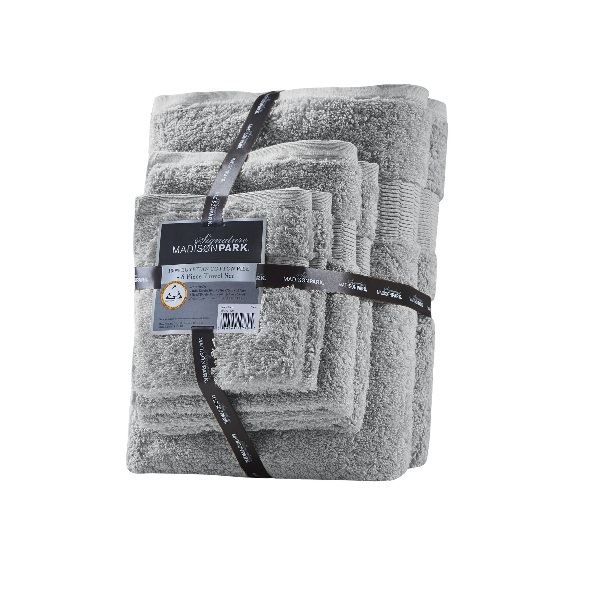 Treat yourself with the luxurious comfort of our Madison Park Signature Luce 100% Egyptian Cotton 6 Piece Towel Set. The long staple cotton yarn creates a rich plush softness, for a glamorous look and silk-like feel. Made from gold seal certified 100% Egyptian cotton, this towel set features 650gsm construction that ensures a premium quality and heavy weight for pure comfort. In addition, these towels are also Made in Green by OEKO-TEX certified, meaning they do not contain any harmful substances or chemicals while also using sustainable processes and socially responsible working conditions, ensuring the best in quality and wellness. With its incredibly soft touch, this 6 piece bath towel set is machine washable for easy care and offers the perfect lavish update to your bathroom decor. Set includes: 2 large 30x54' bath towels, 2 standard 16x26' hand towels, and 2 standard 13x13' wash towels.