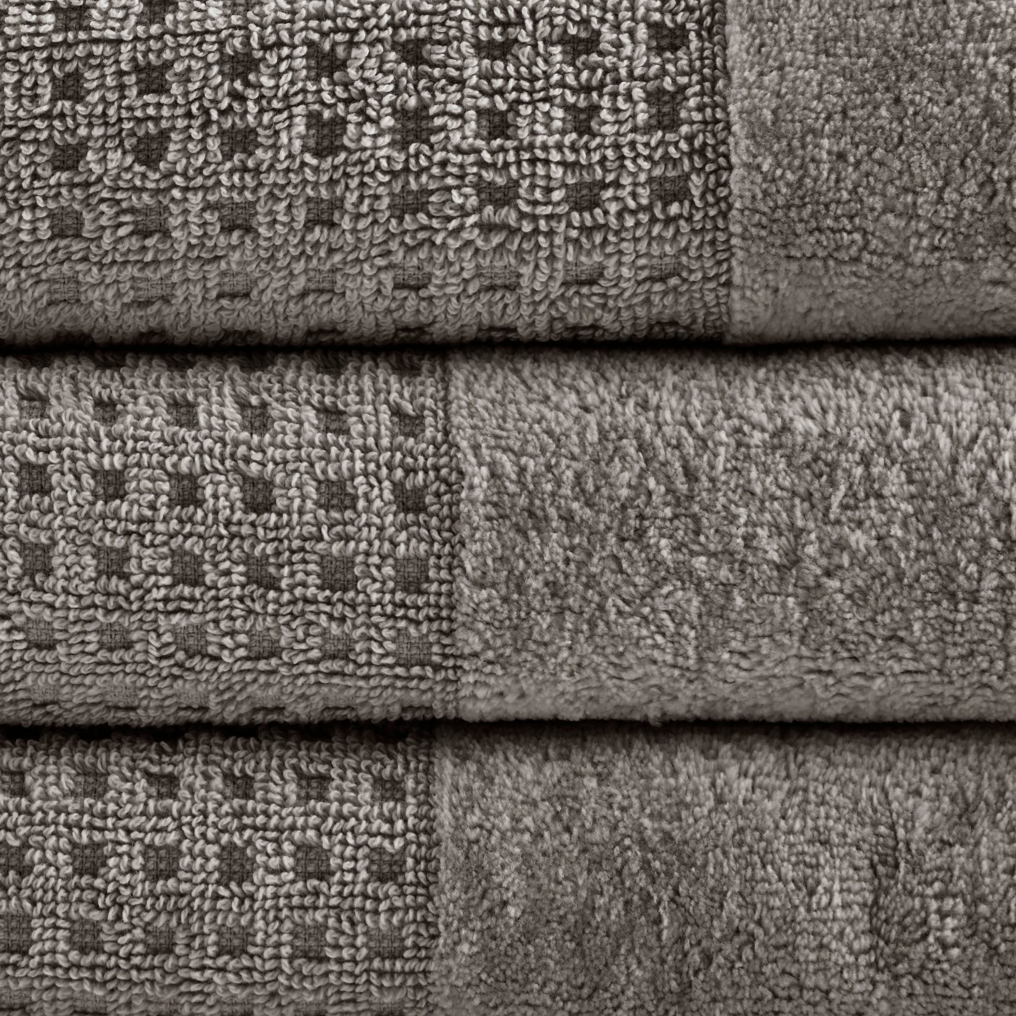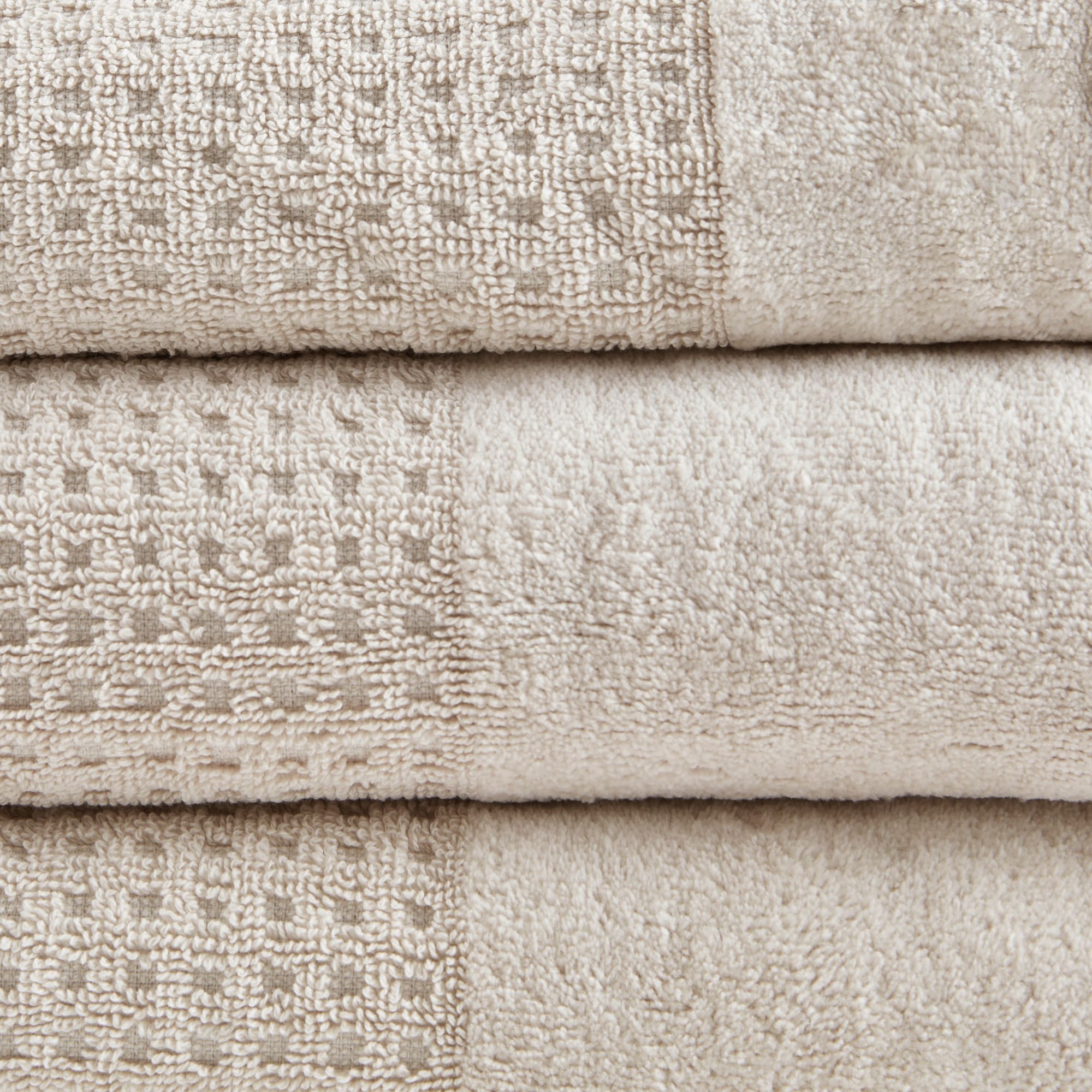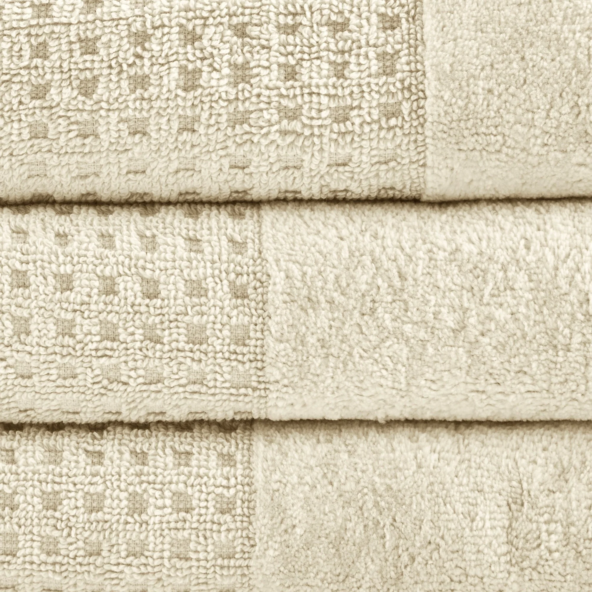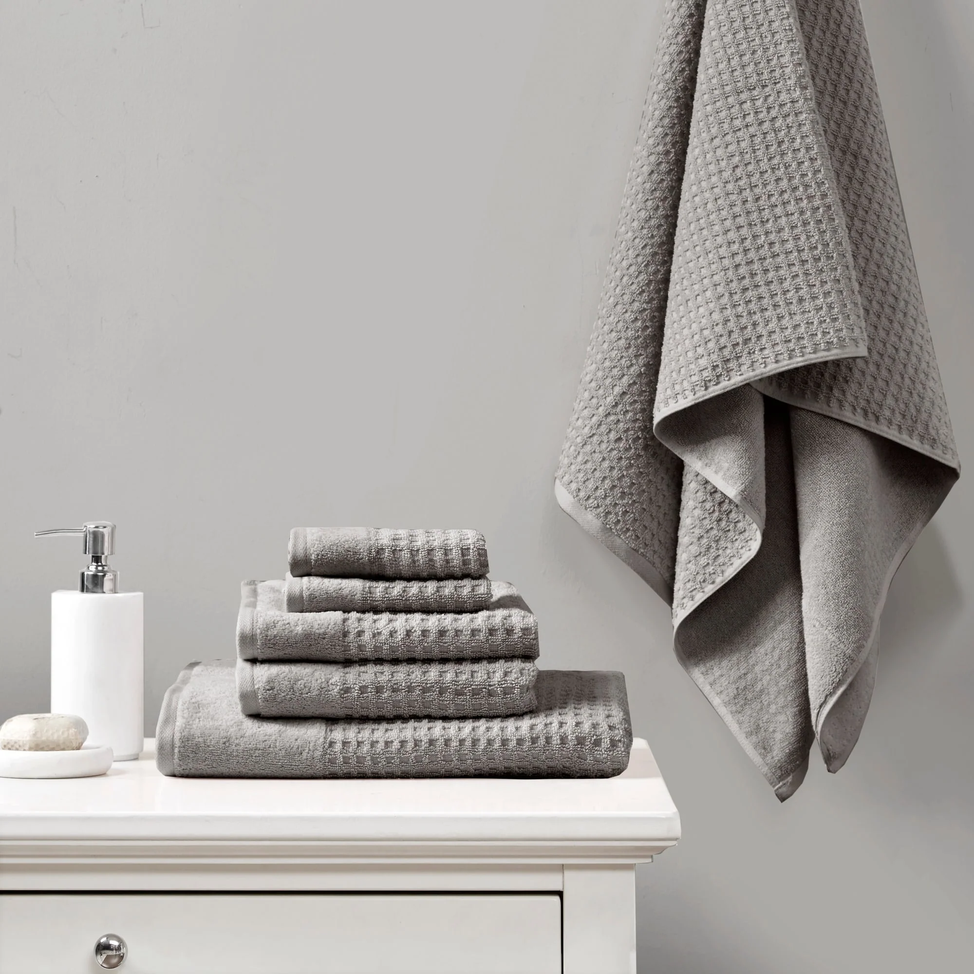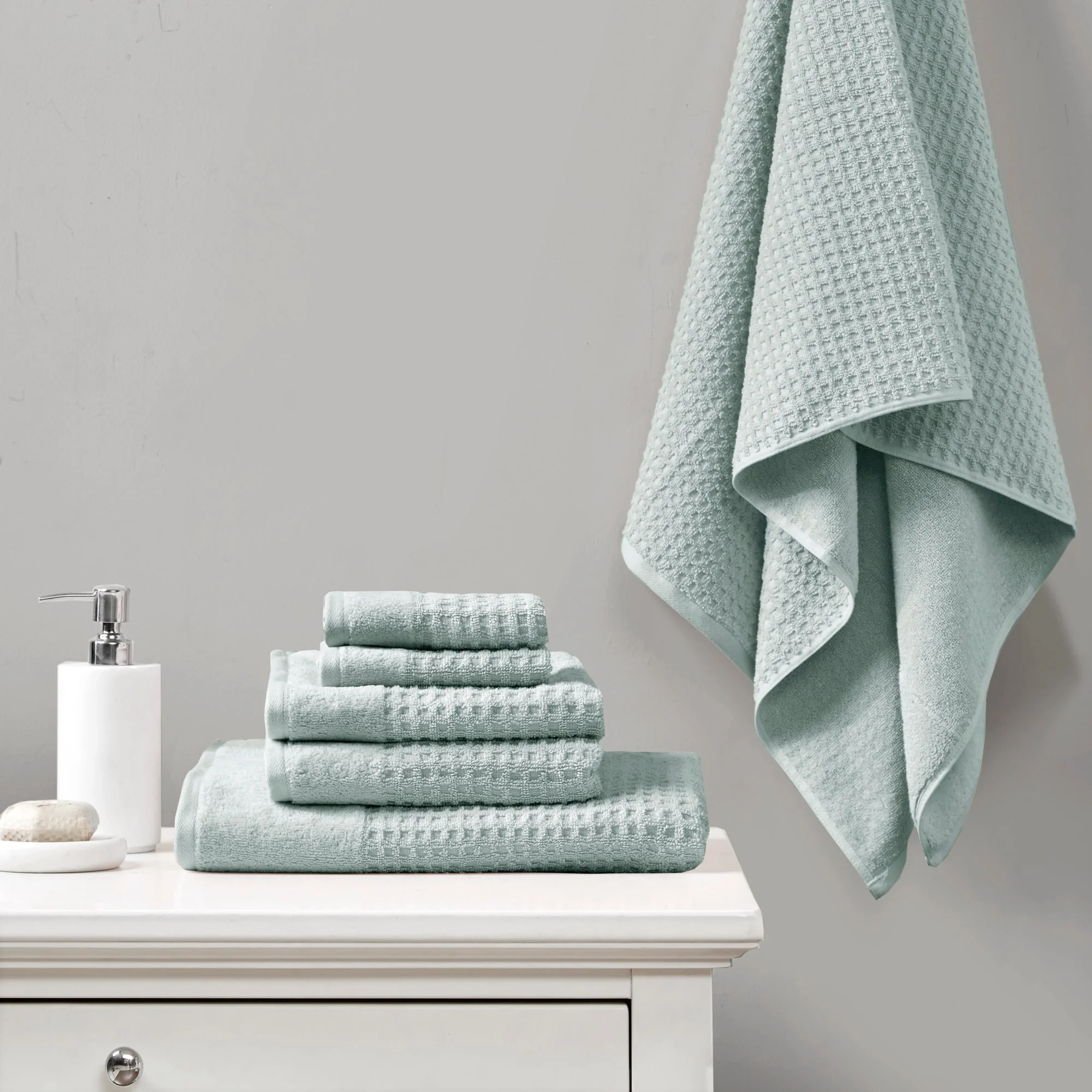 Our Madison Park Spa Waffle Cotton Towel 6 Piece Set provides the perfect textured update to your bathroom decor. This 100% cotton towel set features an all-over waffle combed jacquard design for a rich texture, while the velour dobby cuff adds a stylish contrast touch for an updated look and feel. The 600gsm weight makes each towel soft yet also lightweight and quick-drying, so it does not get weighed down from moisture throughout the day. These towels are also finished with a SILVADUR™ antimicrobial treatment providing built in freshness protection, inhibiting growth of odor causing bacteria, and keeping linen newer, longer. Active for multiple washes, this treatment delivers long-lasting durable odor protection performance. In addition, this towel set is also Made in Green by OEKO-TEX certified, meaning they do not include any harmful substances or chemicals while also using sustainable processes and socially responsible working conditions, for the best in quality comfort and wellness. Complete the look with coordinating Spa Rug and Spa Waffle Shower Curtains, available and sold separately. Set includes: 2 standard 28x54' bath towels, 2 standard 16x26' hand towels, and 2 standard 12x12' wash towels.