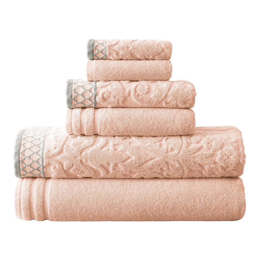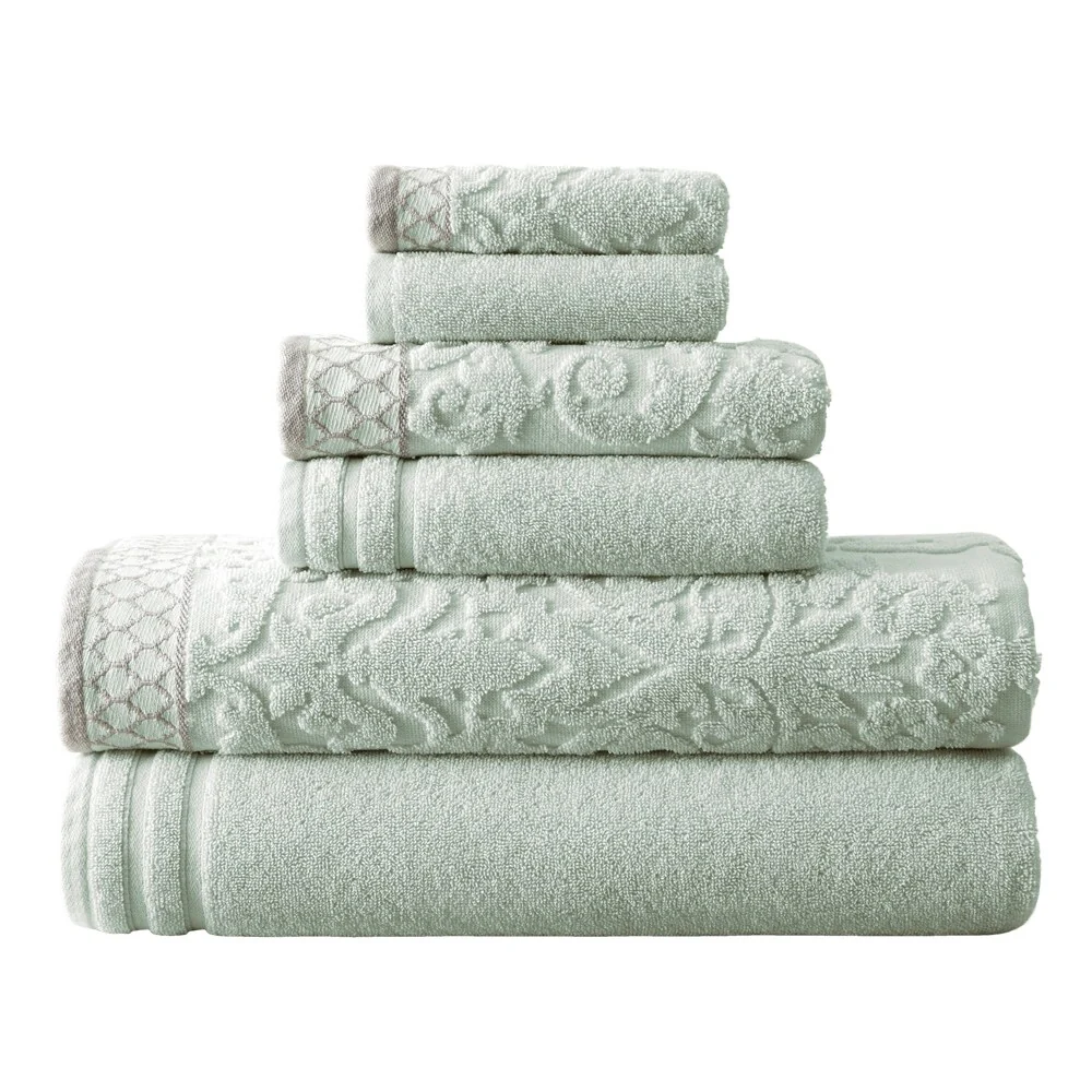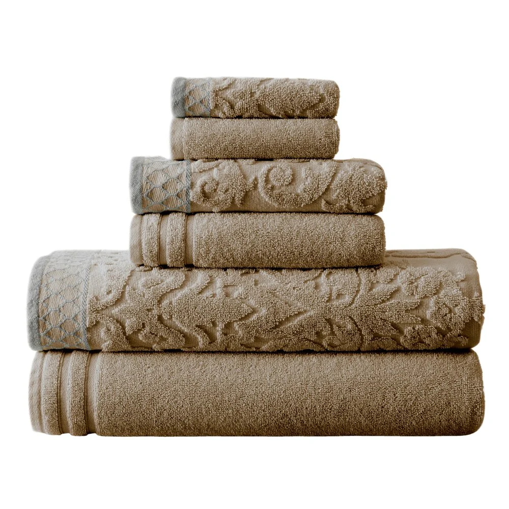 Indulge in luxurious comfort with the Modern Threads Damask Jacquard 6-piece Embellished Border Towel Set. Made of combed cotton, these towels are soft, absorbent, and perfect for any bathroom. The embroidered border adds a touch of elegance to the solid towels, while the damask jacquard pattern on some of the towels provides texture and detail for a stunning display.