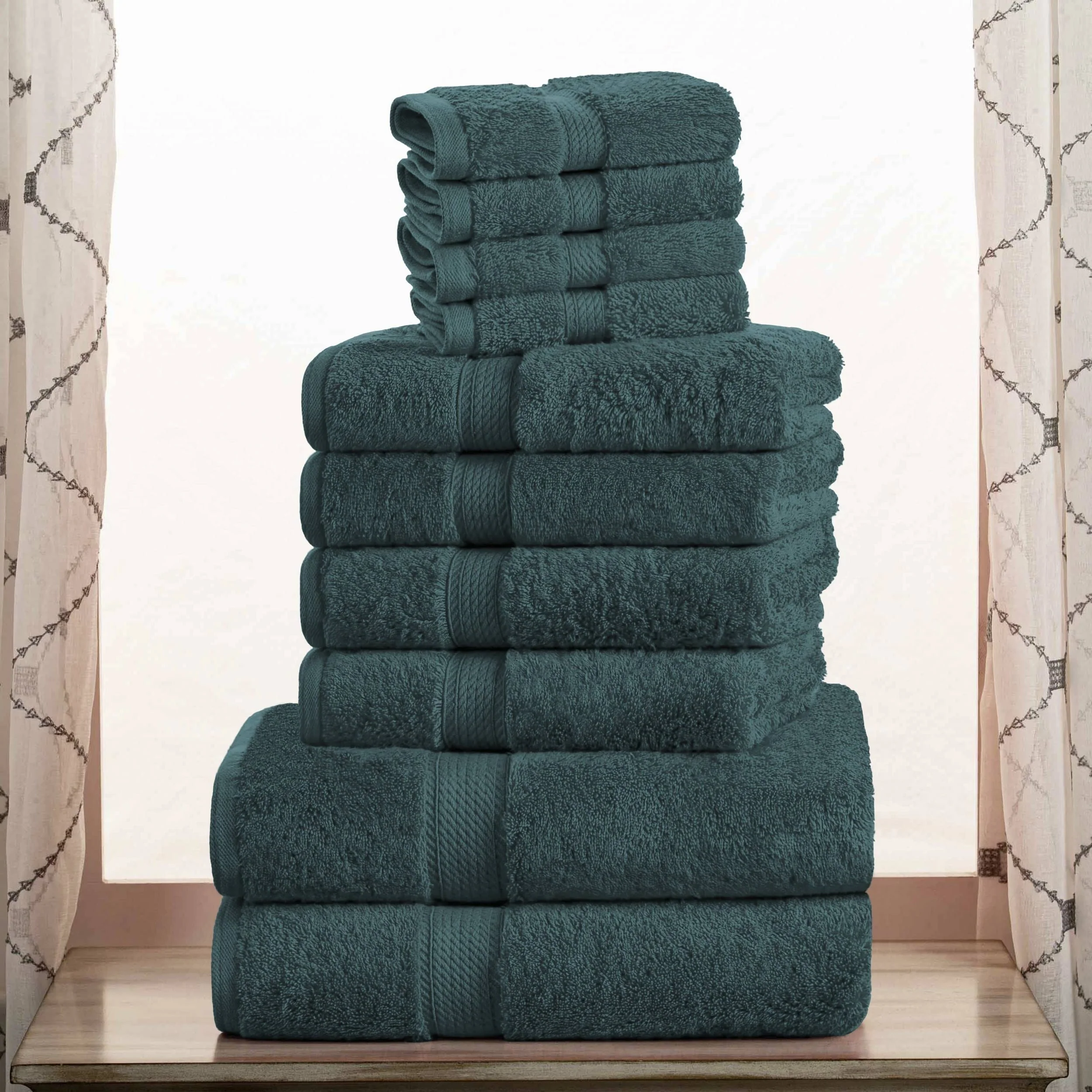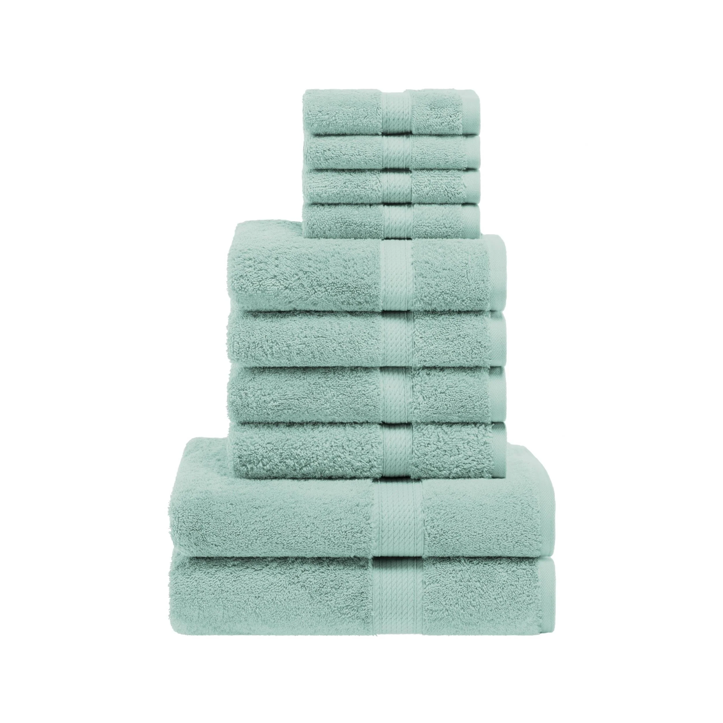 Create a resort-inspired bathroom with the Superior Egyptian Cotton Pile 10-Piece Towel Set. Our most luxurious Egyptian Cotton Pile bathing essentials feature a heavyweight thickness to keep you warm and dry quickly. Each piece in this plush and fluffy set absorbs moisture effortlessly, keeping you cozy as soon as you step out of the shower or bath. Pamper yourself, or reserve this set for guests, while adding a modern flourish to any master bath, powder room, or guest bath. The attached hanging loop allows you to easily hang your towel for quick drying and utmost convenience.