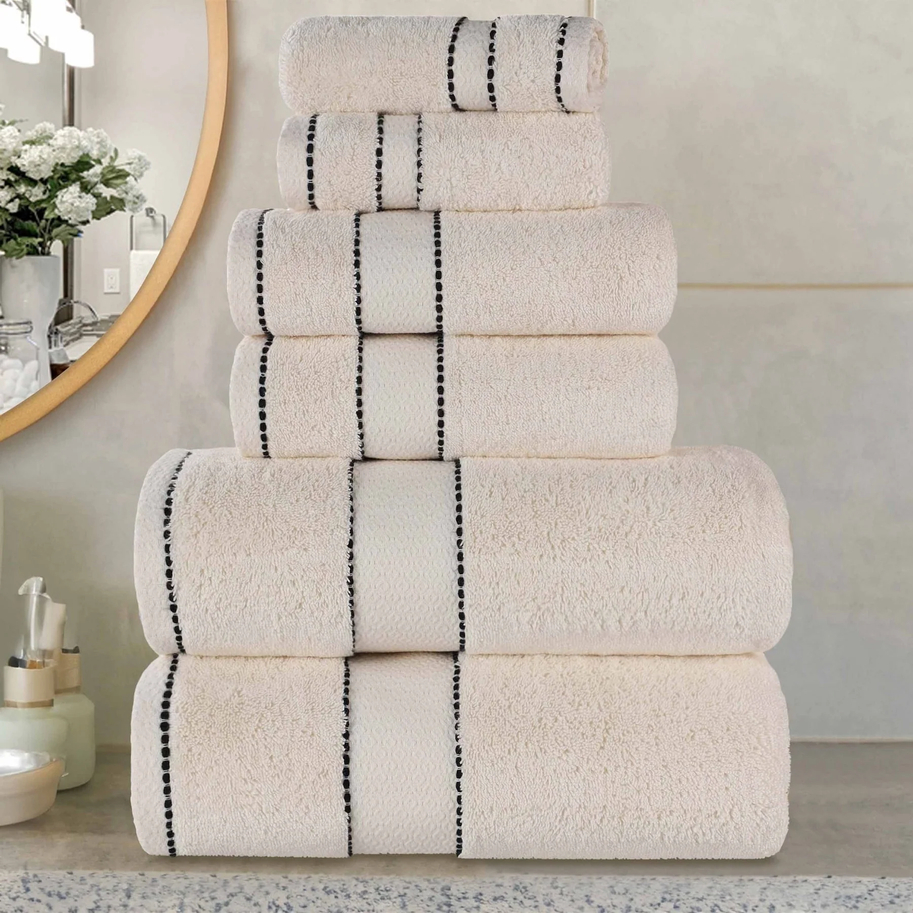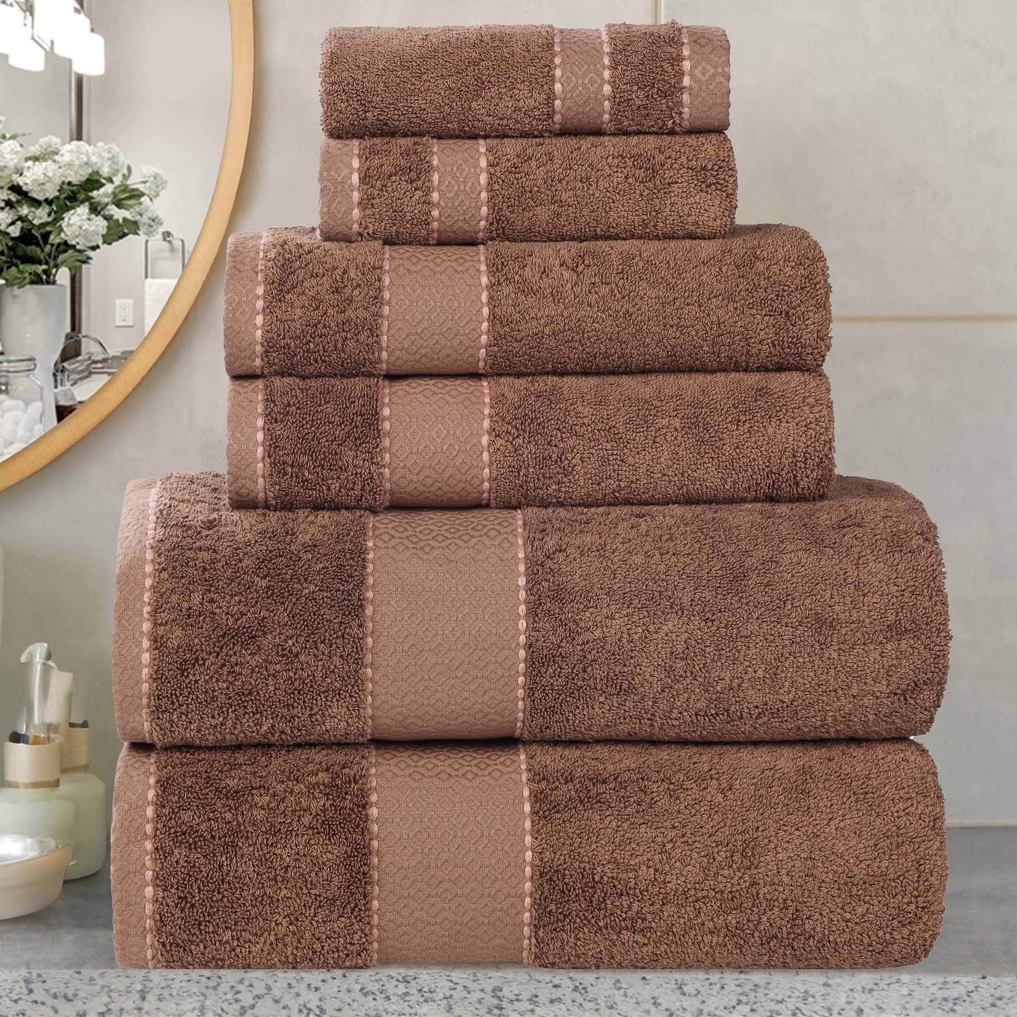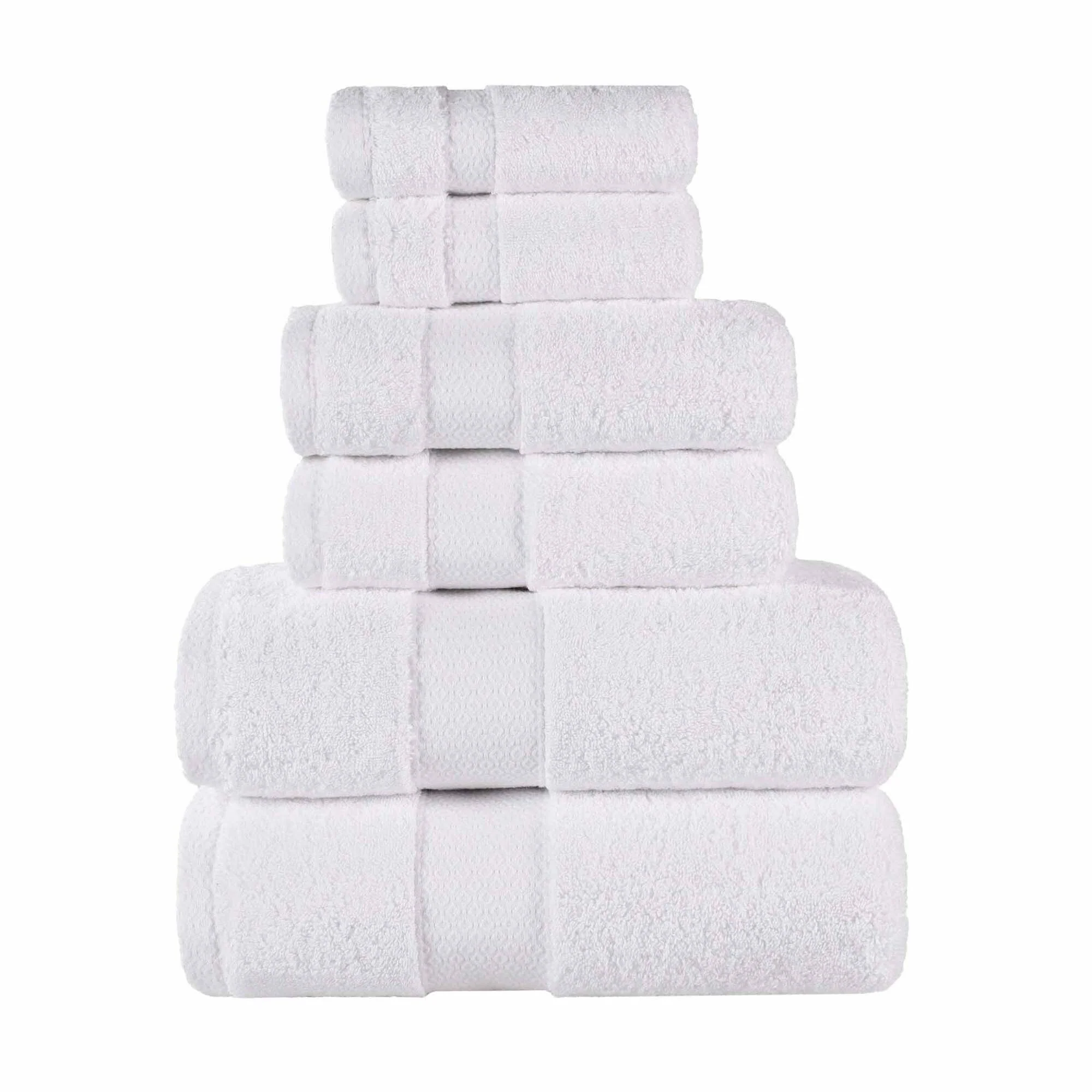 Upgrade your bathroom towel collection with the Superior Niles Cotton 6 Piece Towel Set. Our Egypt produced Giza Cotton towels feature impressive absorbency, a smooth texture, and silky feel for a luxury spa-like experience at home. The heavyweight thickness of each towel is durable and perfect for the bath, poolside, or at the beach. For a refined finish, each piece in this bundle features an elegant diamond dobby border and a hanging loop for effortless drying. These towels are available in Navy Blue, Charcoal, Chocolate, White/Black, White, Ivory, Platinum, Gold, and Forest Green color options to match your bathroom decor style. This set includes 2 face towel/ washcloths, 2 hand towels, and 2 bath towels to complete your bathroom essentials.