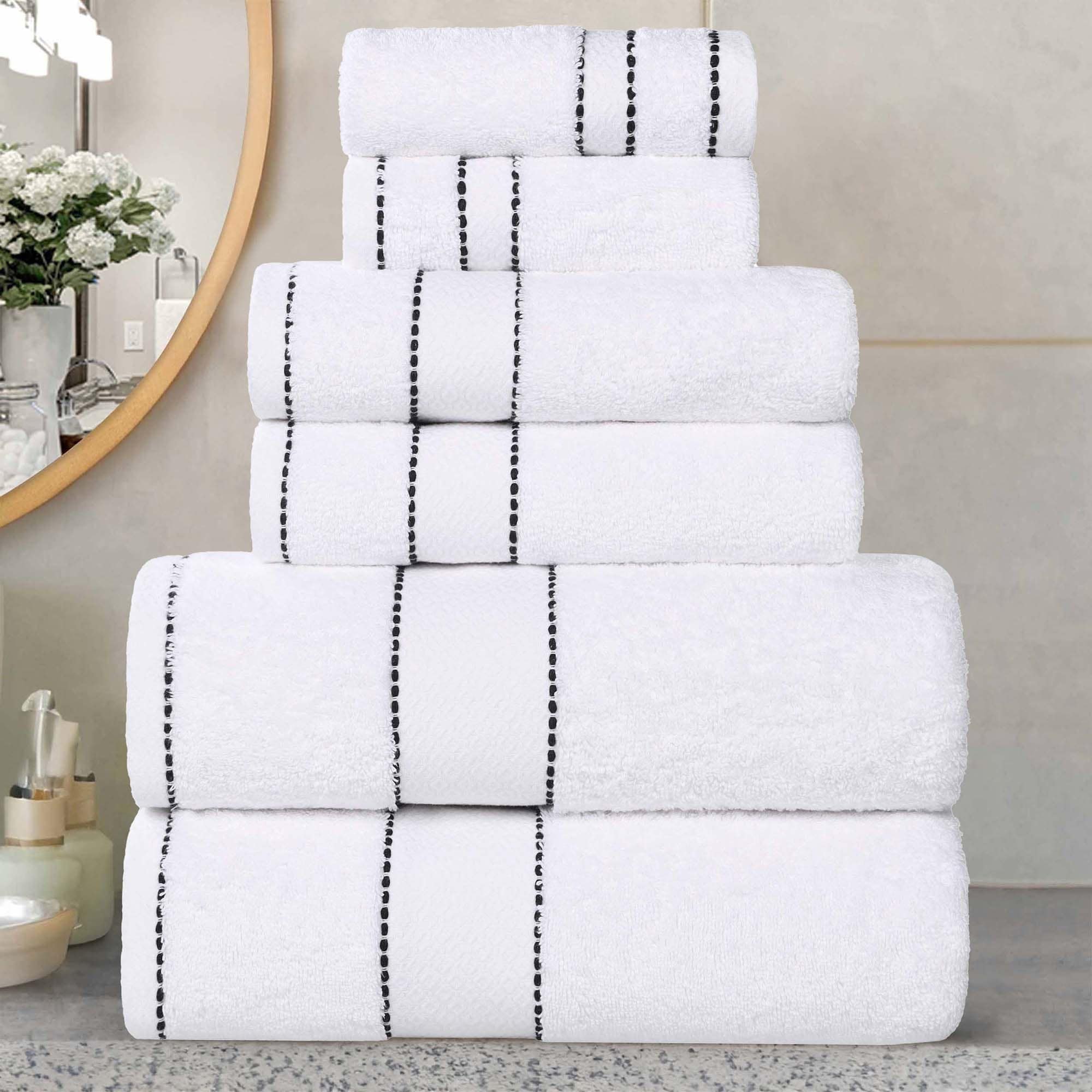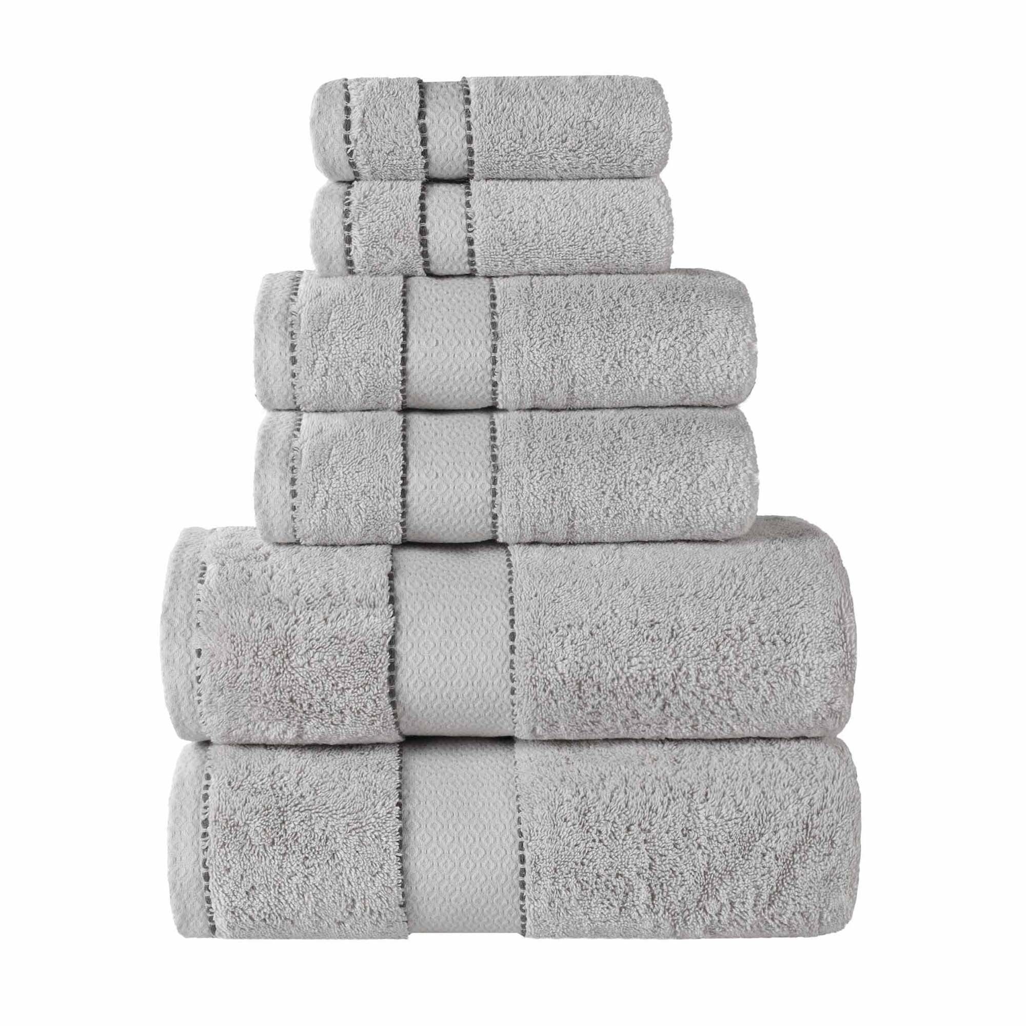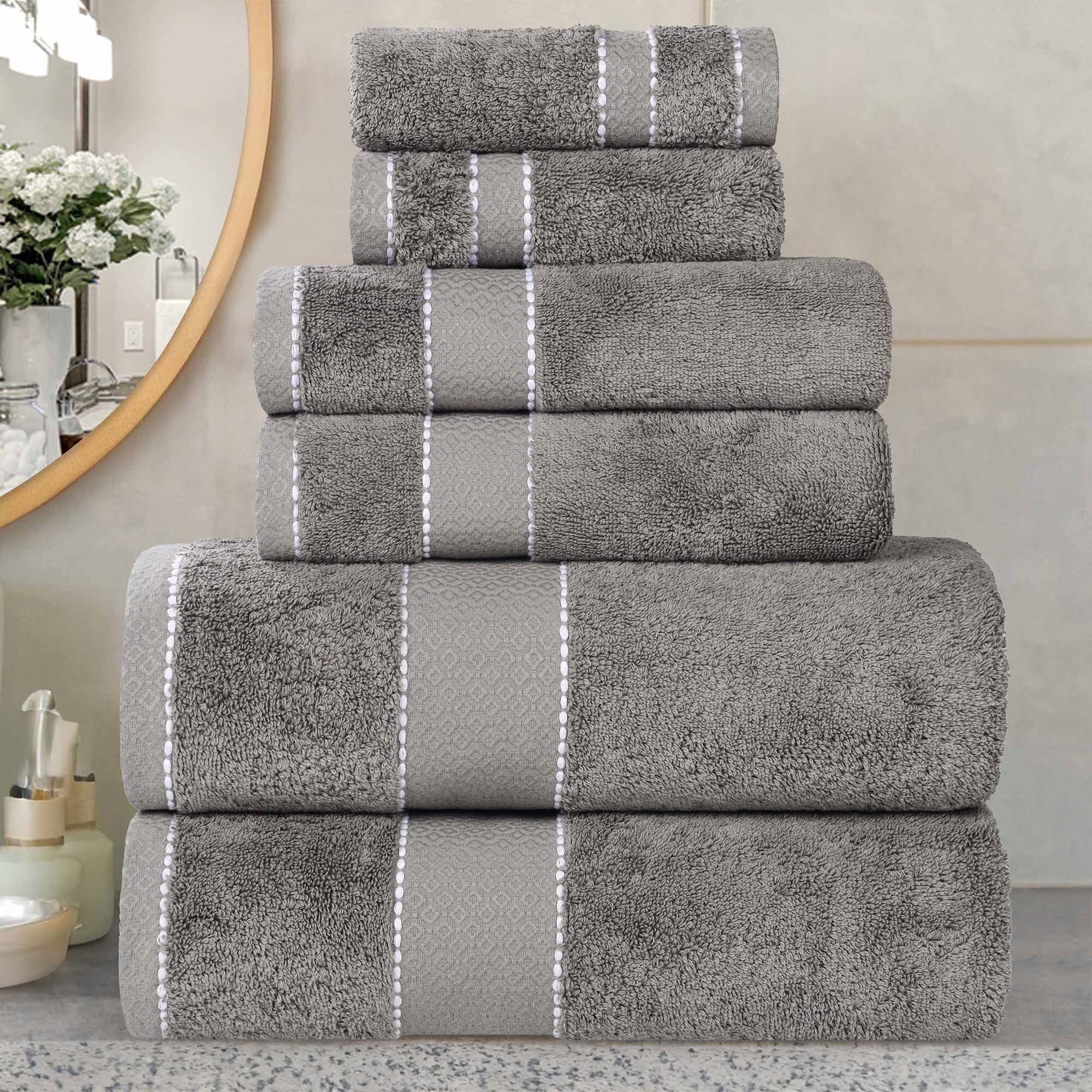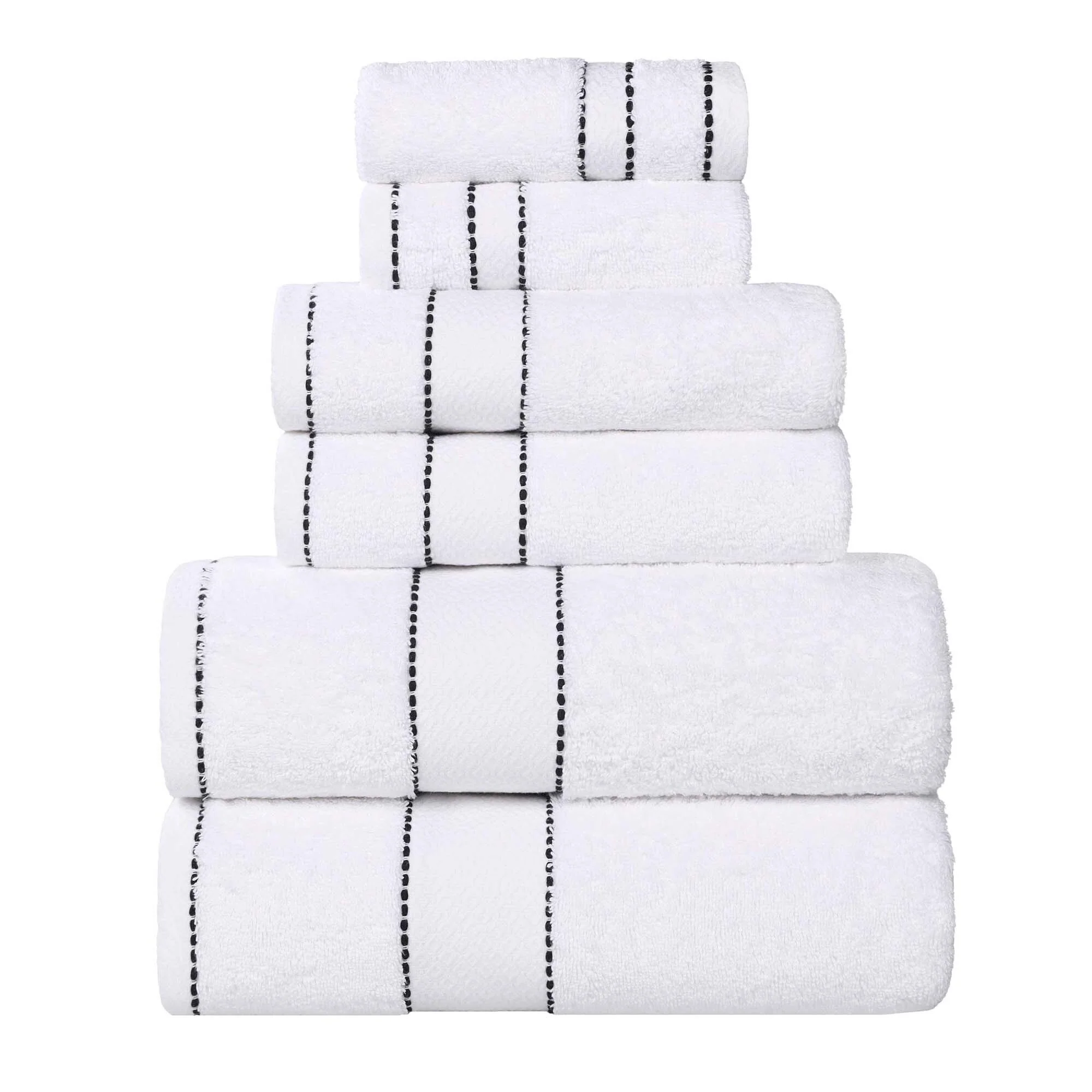 Upgrade your bathroom towel collection with the Superior Niles Cotton 6 Piece Towel Set. Our Egypt produced Giza Cotton towels feature impressive absorbency, a smooth texture, and silky feel for a luxury spa-like experience at home. The heavyweight thickness of each towel is durable and perfect for the bath, poolside, or at the beach. For a refined finish, each piece in this bundle features an elegant diamond dobby border and a hanging loop for effortless drying. These towels are available in Navy Blue, Charcoal, Chocolate, White/Black, White, Ivory, Platinum, Gold, and Forest Green color options to match your bathroom decor style. This set includes 2 face towel/ washcloths, 2 hand towels, and 2 bath towels to complete your bathroom essentials.