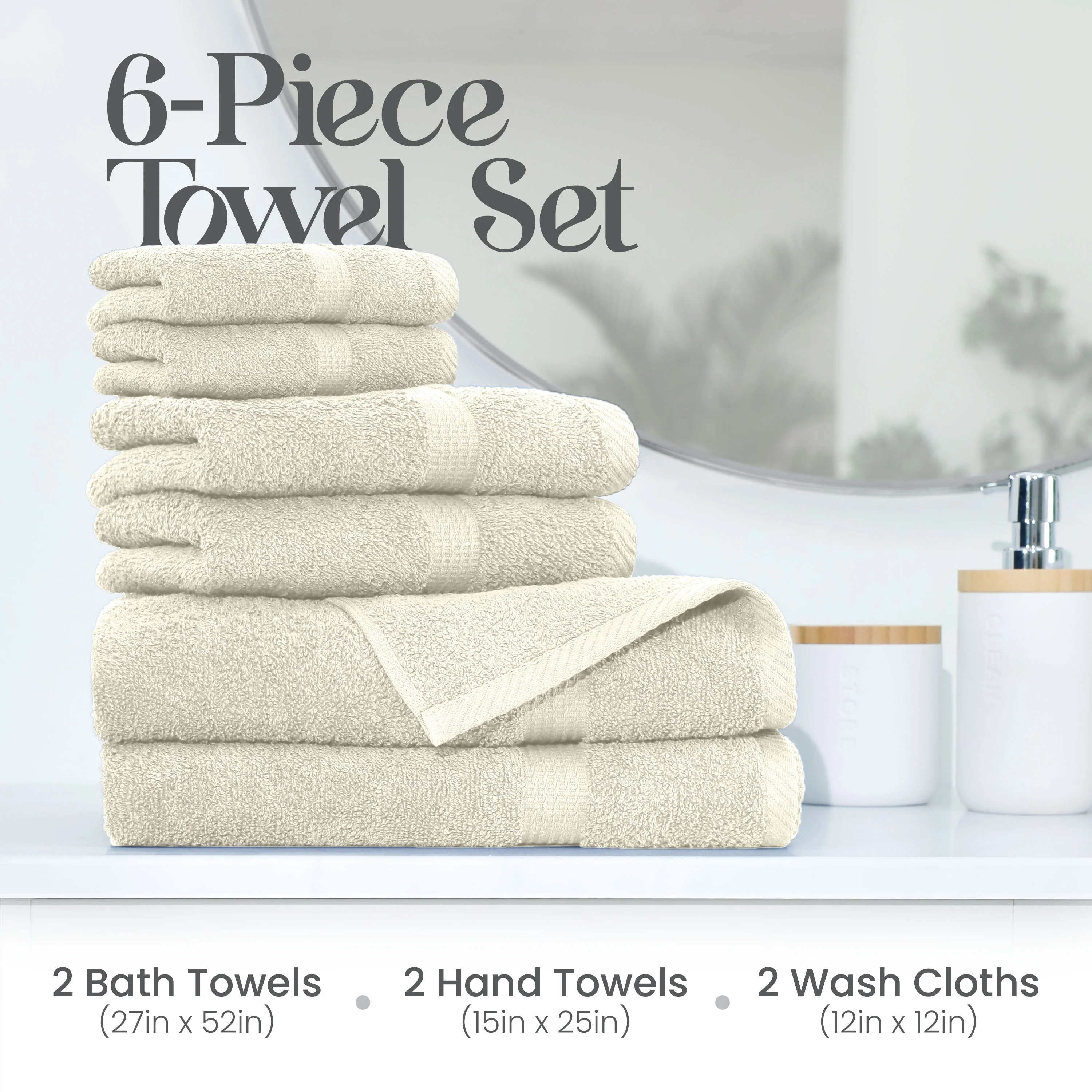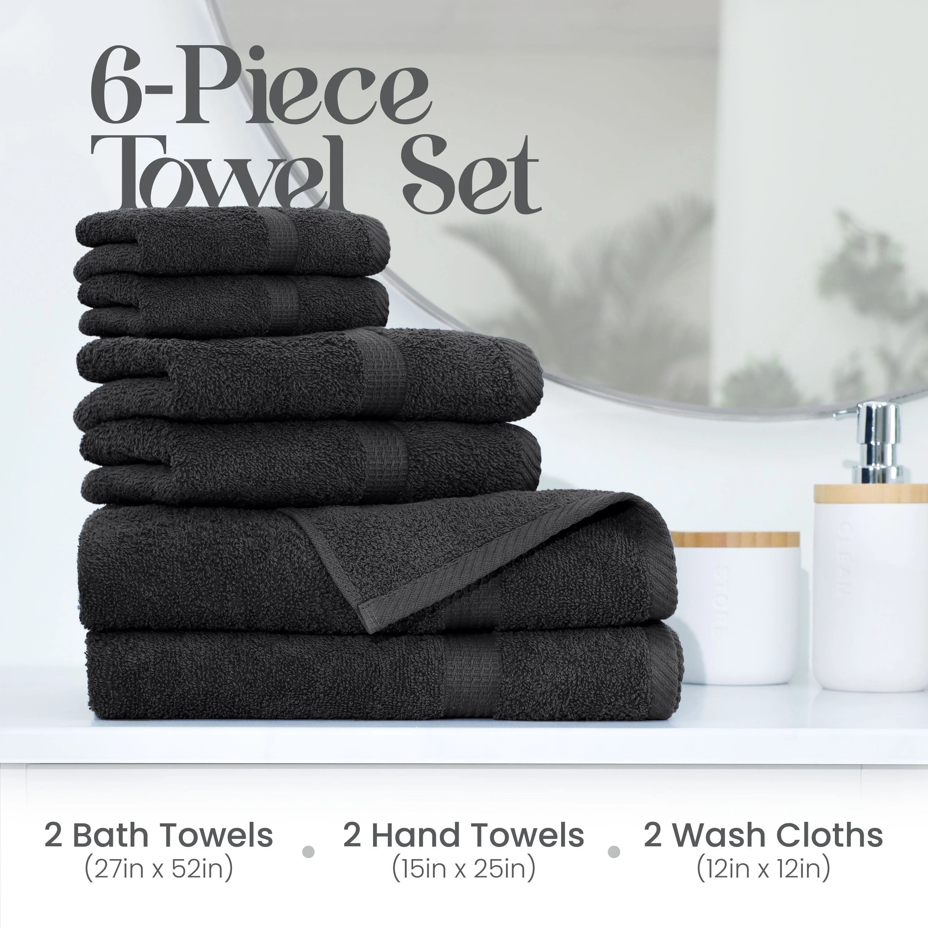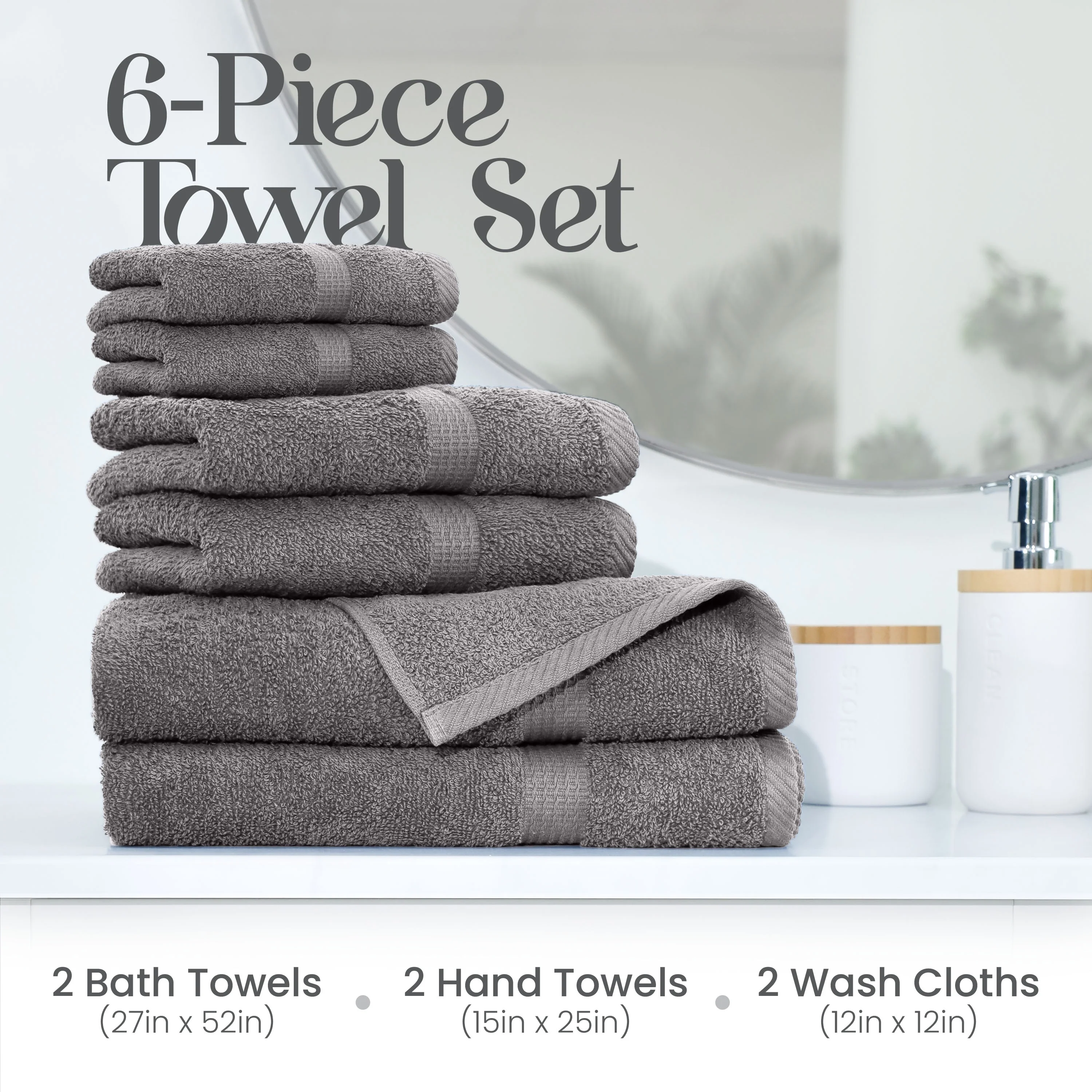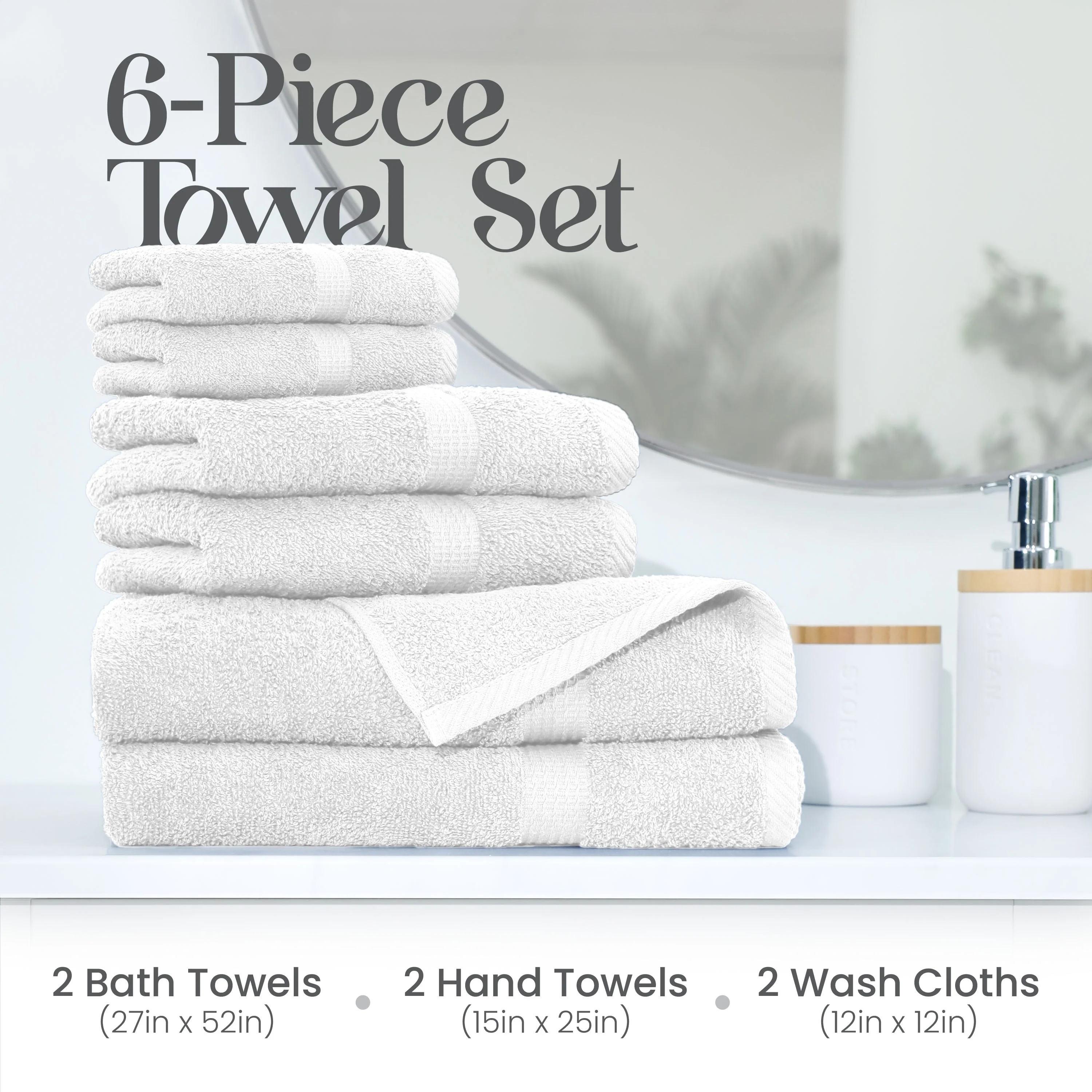 - 6-Piece set includes: (2) bath towels, (2) hand towels, and (2) wash cloths