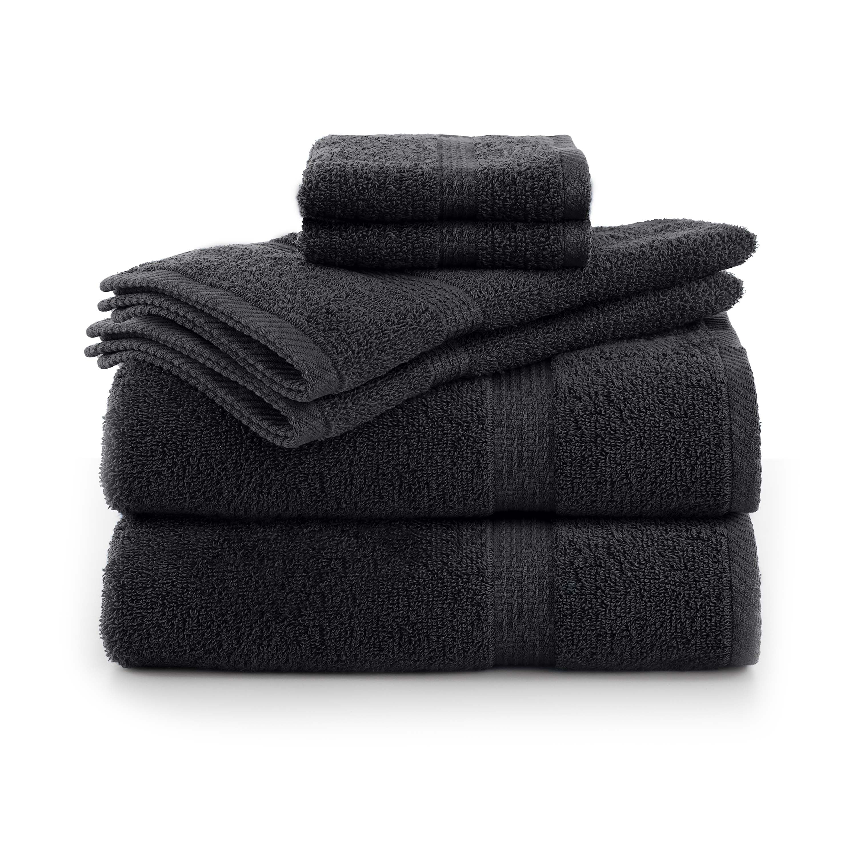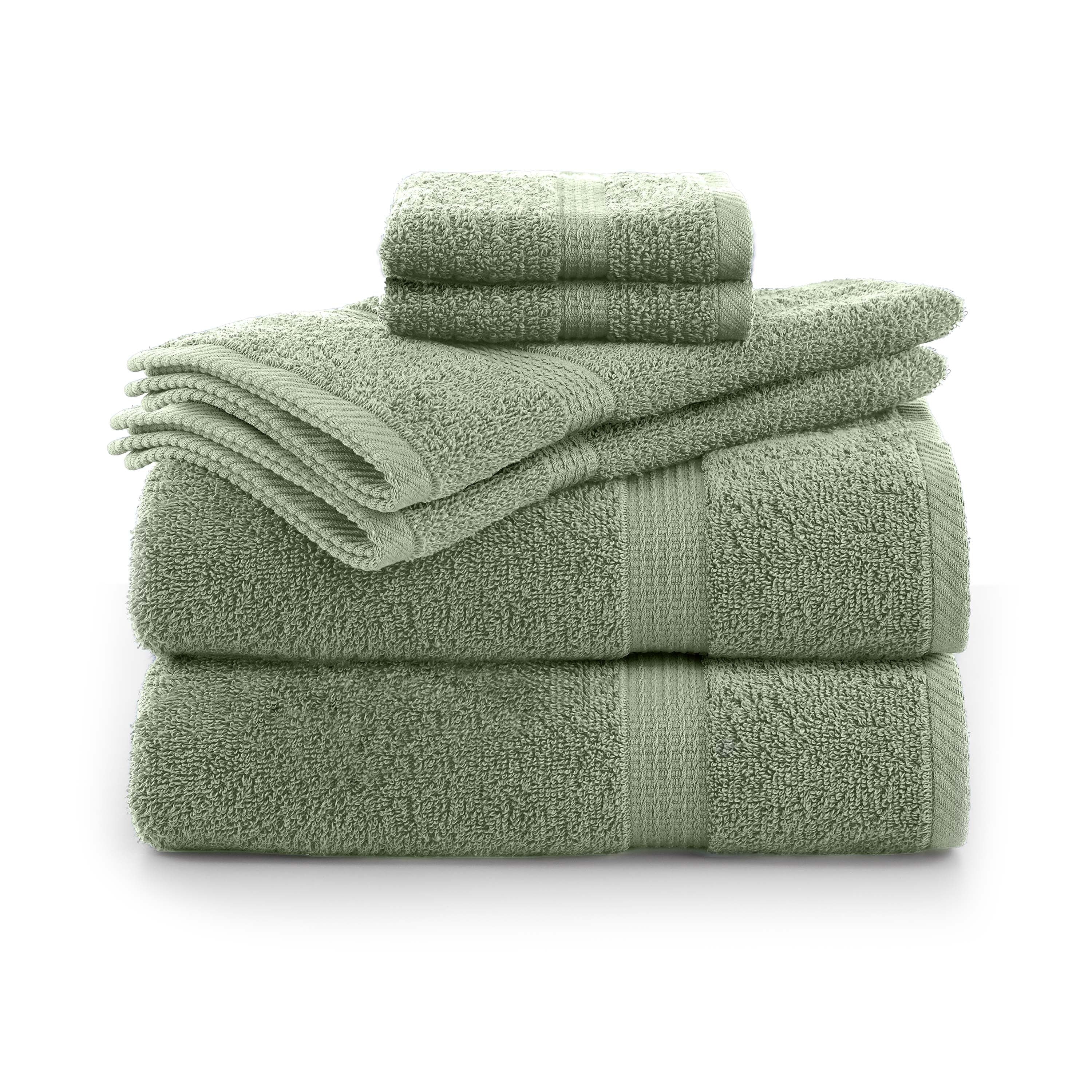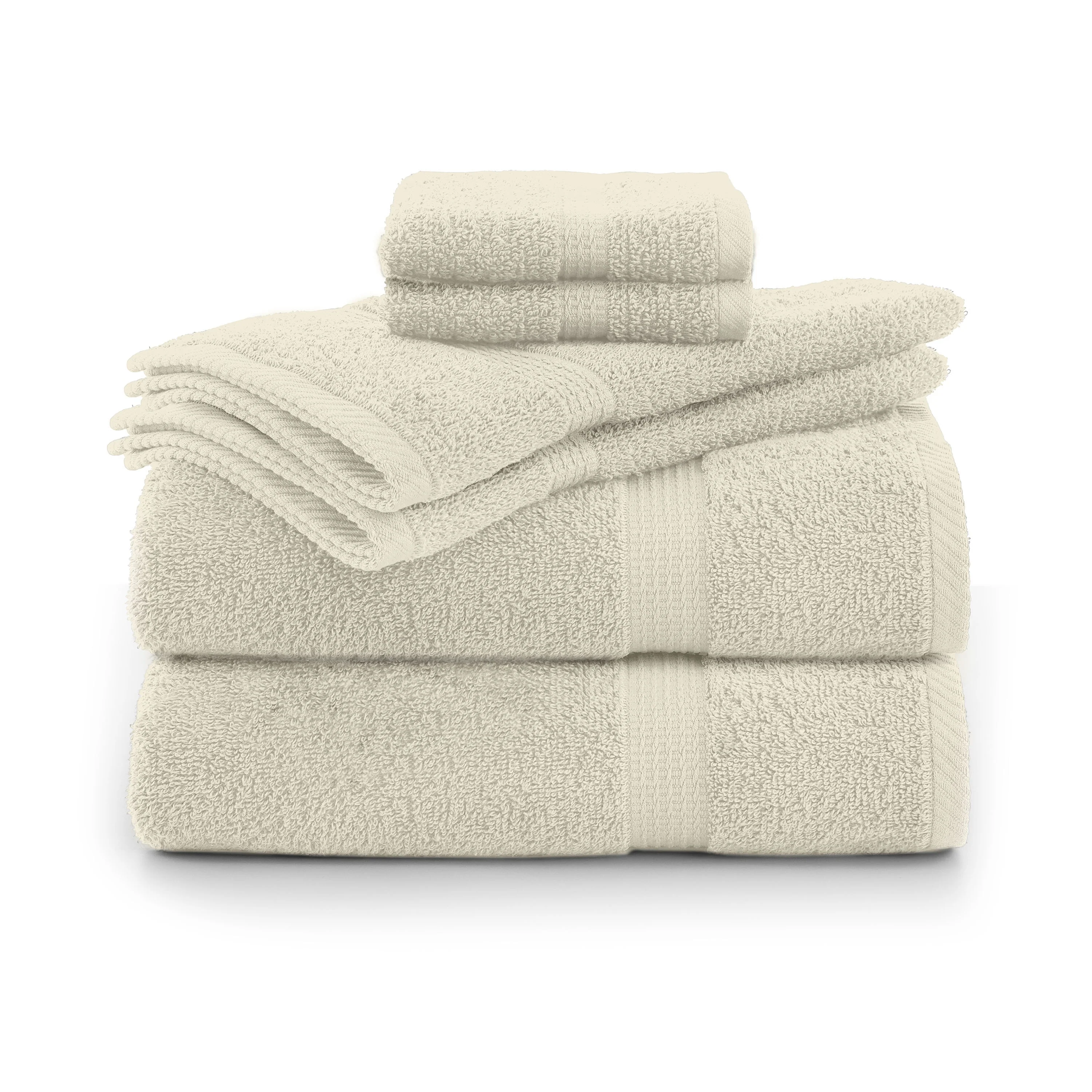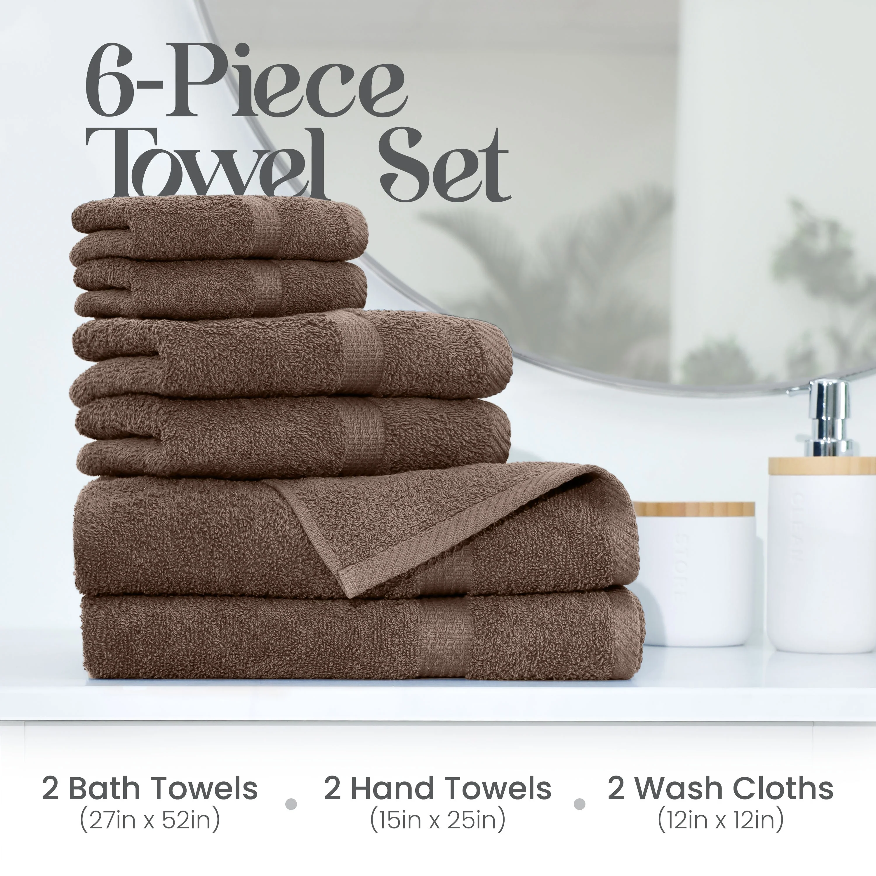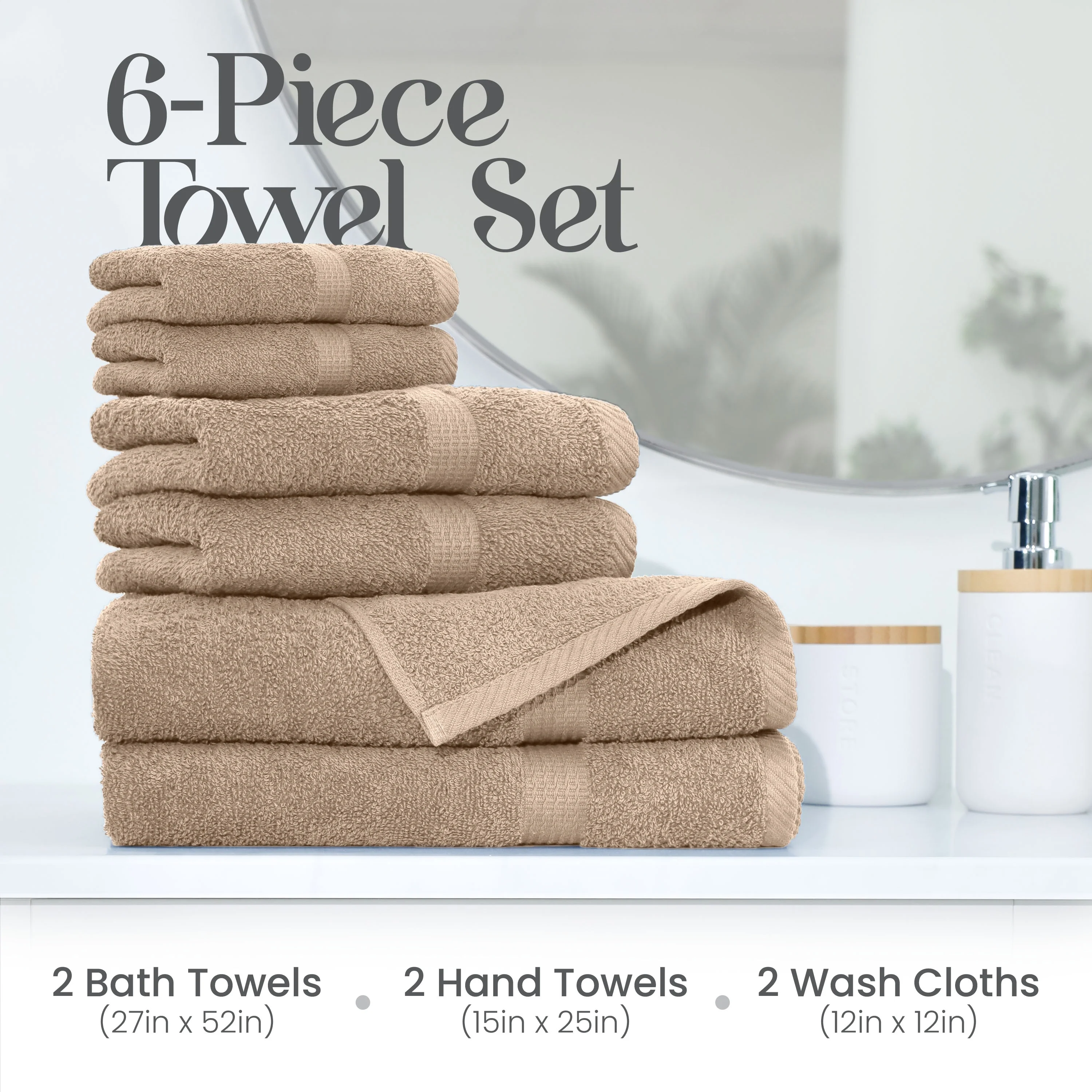 - 6-Piece set includes: (2) bath towels, (2) hand towels, and (2) wash cloths