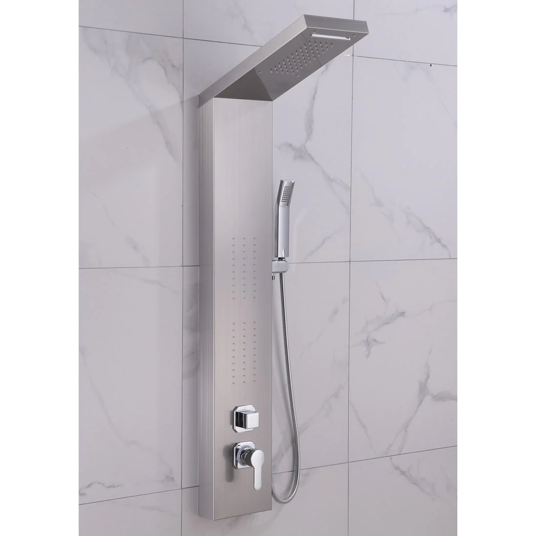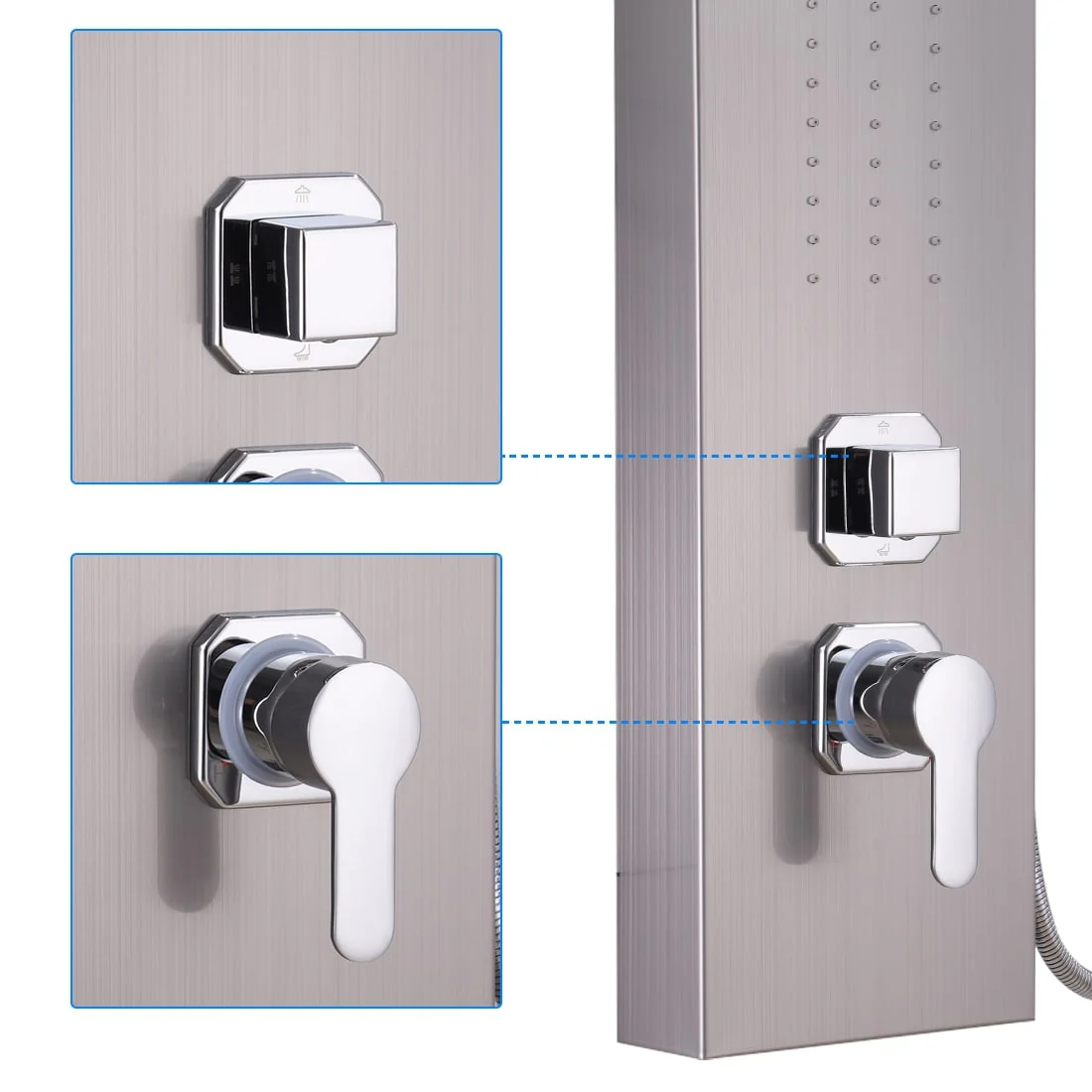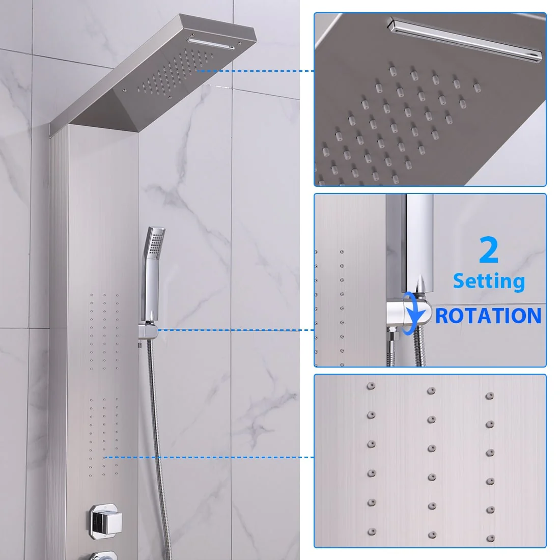 Premium multi-function shower massage panel with LED shower head for home and commercial use. Panel's body is made of 304 stainless steel, cool 5 functions: rainfall, mist, massage jets, tub spout, 3-setting handheld shower. The system has hot and cold integrated mixing valve controls and diverter to redirect water from one function to another. Paired with the fact that it is pre-plumbed for easy installation, makes easy to love for years to come. This excellent shower tower will provide you a comfortable experience, drive away fatigue, relax your mind and body after showering. Luxury color, easy to match modern room decorations.