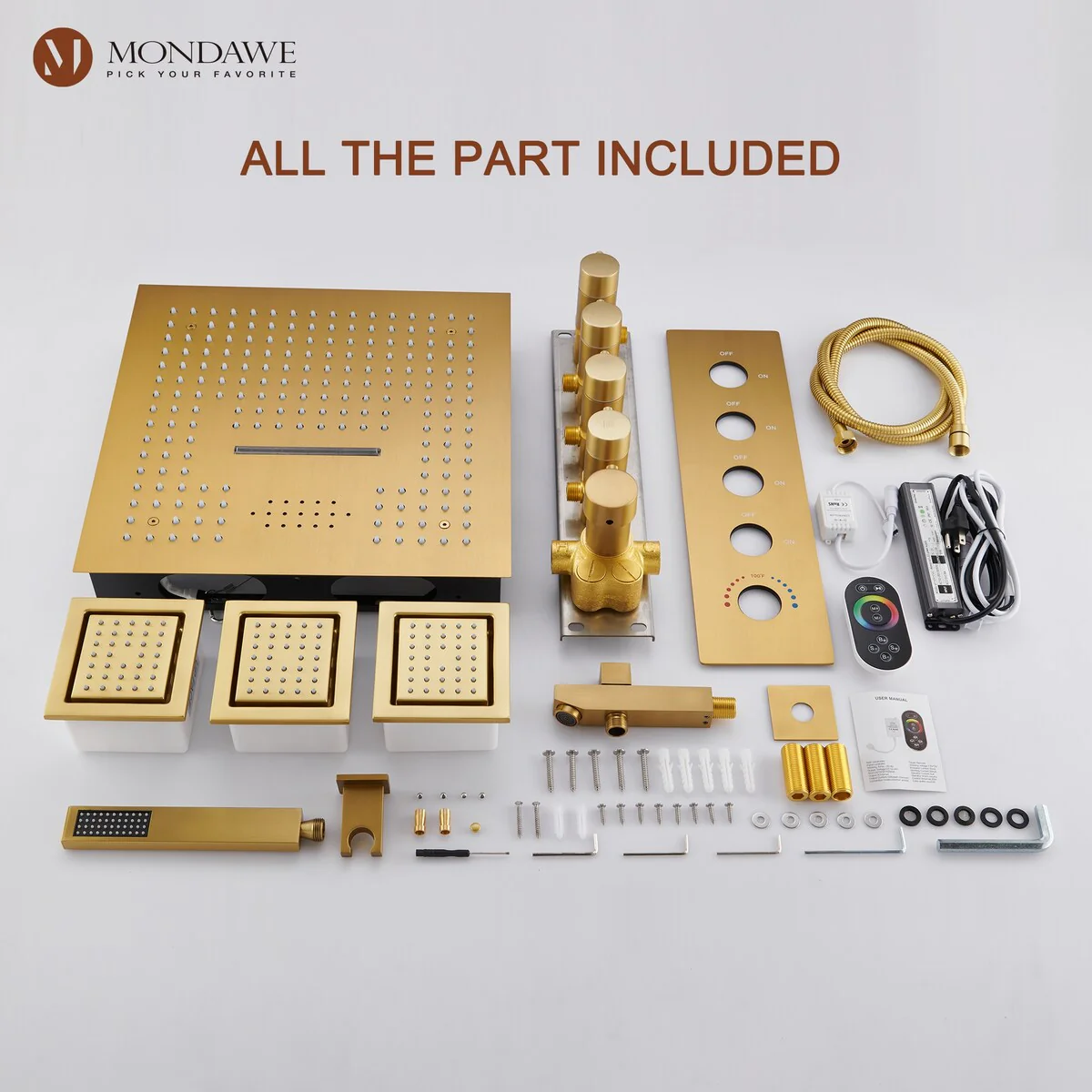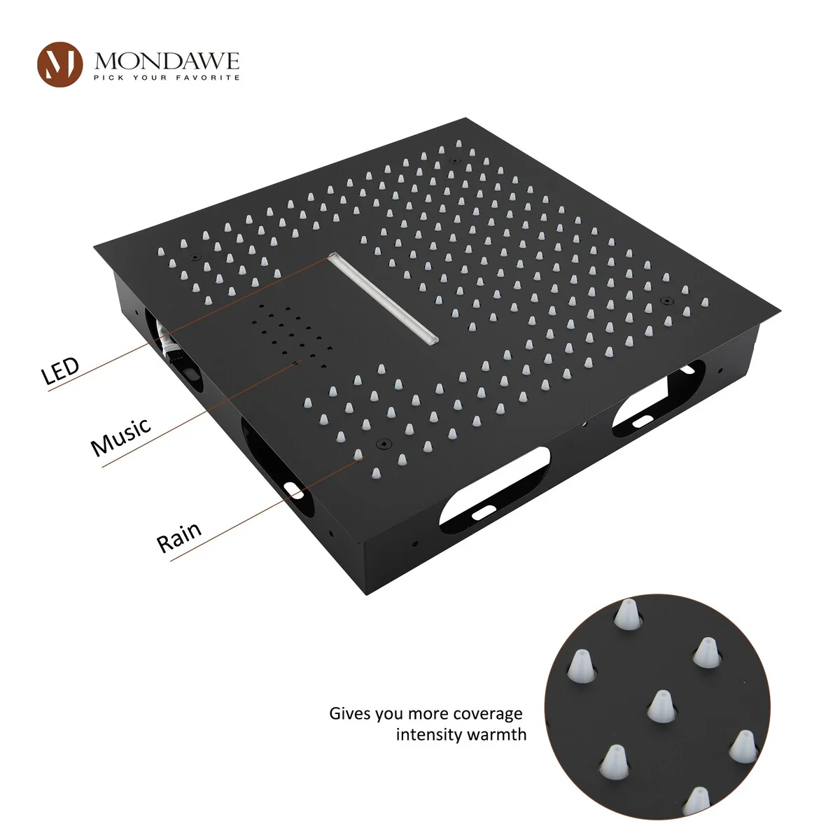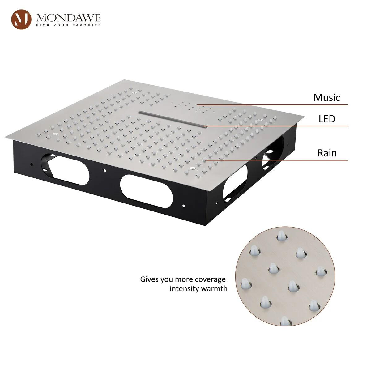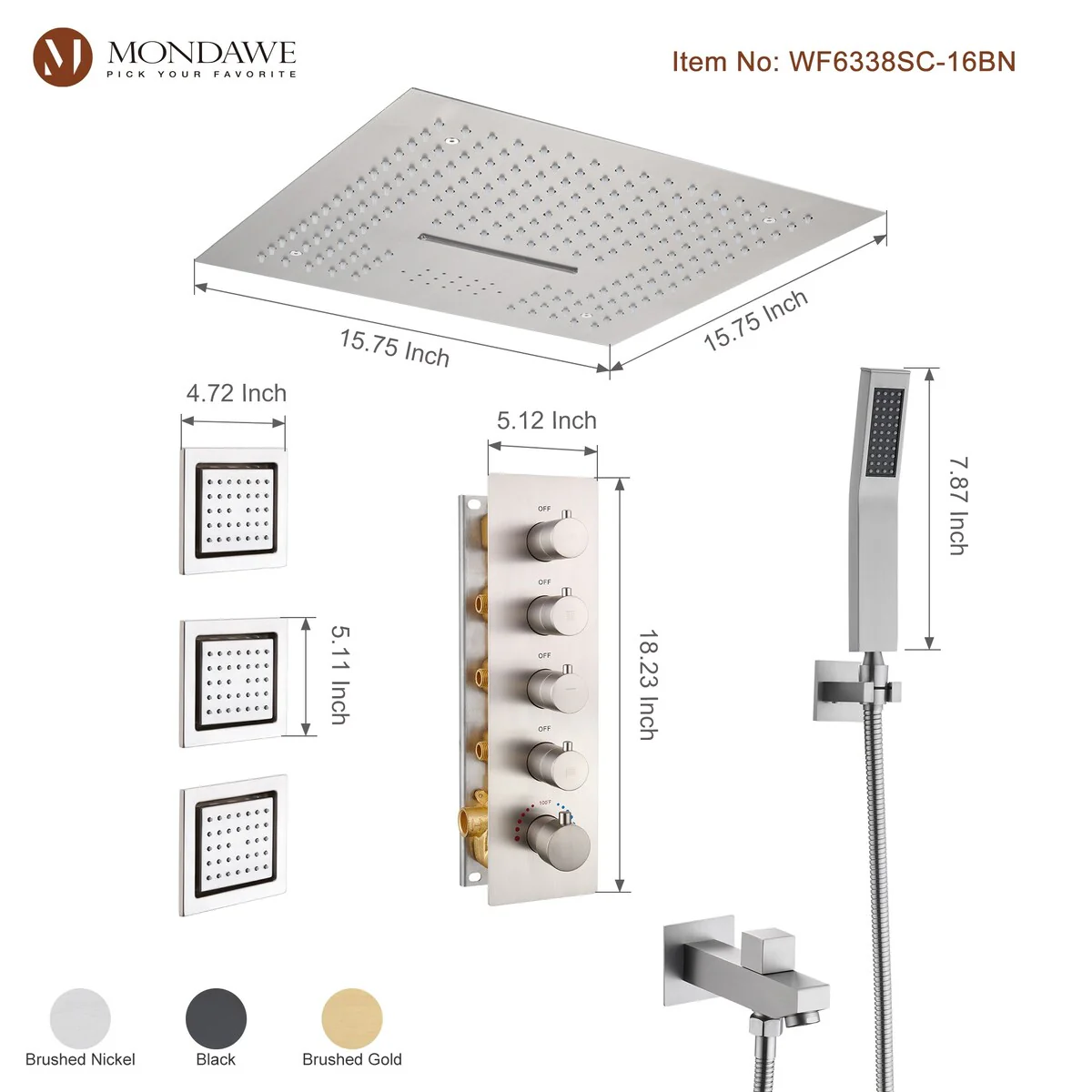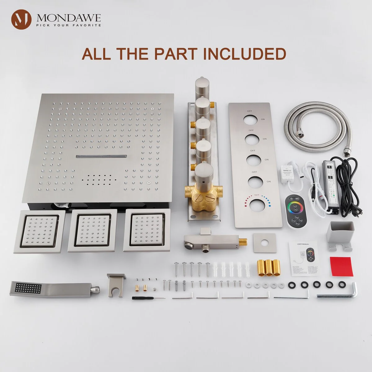 Wash the day away with our Three-In-One Shower Faucet! Use the waterfall shower, hand shower, and 3 body jets together or separately to get water where you need it most. Music player function and LED light will add more relax to your shower time!An anti-scald thermostatic valve with five handles is used for temperature control and water flow control which also adds convenience. Our shower faucet system always gives an amazing spray of water and adds the perfect touch to complete the look of your bathroom. If you are looking for elegance and performance, don't hesitate to choose our product.1.INCLUDES: waterfall shower main body, 16 inch square waterfall shower head, hand shower head, 30 * 30 * 200 mm shower arm, 59.06 in. length shower hose ,water control valve( copper ), 3 body jets.2.4-Way Function: Waterfall/rainfall shower, 3 packs of body jet, and hand shower. You could use faucets together or separately to get water where you need it most.3.Ceiling Mounting 2 Function Shower: shower head made of stainless steel, main body made of brass. Waterfall and rainfall mode, always gives an amazing spray of water.4.Wall Mounting Hand Shower: shower head, shower arm, and hose made of stainless steel, shower pedestal made of brass. Gives spray of water within its reach.5.Surface Mounting 360 ° Adjustable 3 Body Jets: body jets made of brass. Provide a luxury spa experience in your bathroom.6.Anti-scald thermostatic valve with five handles is used for temperature control and water flow control which also adds convenience.