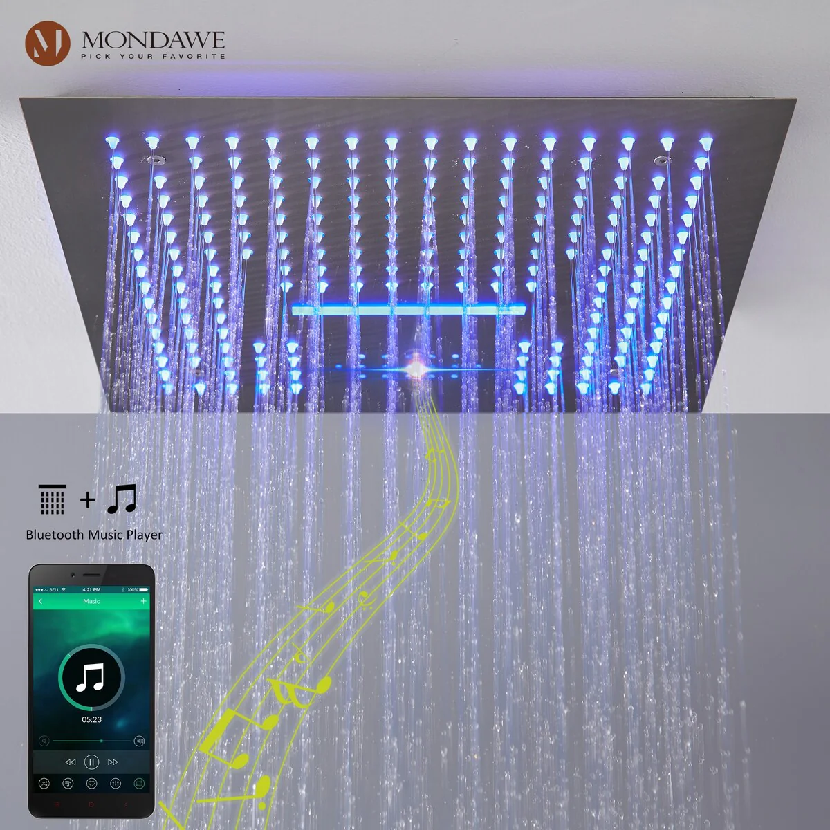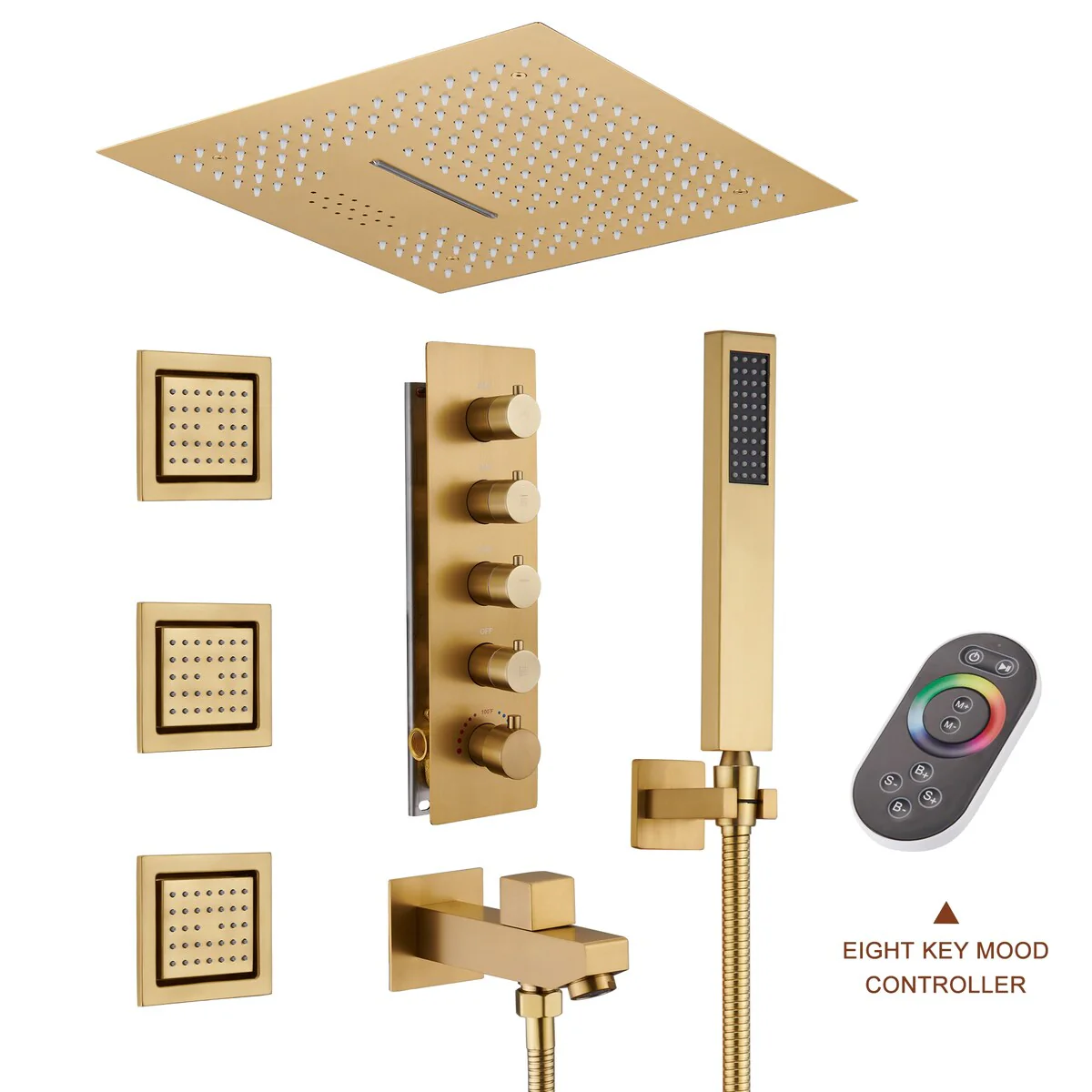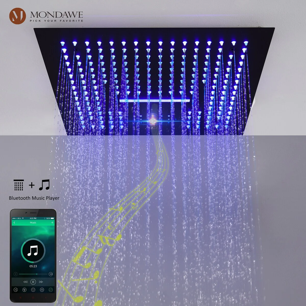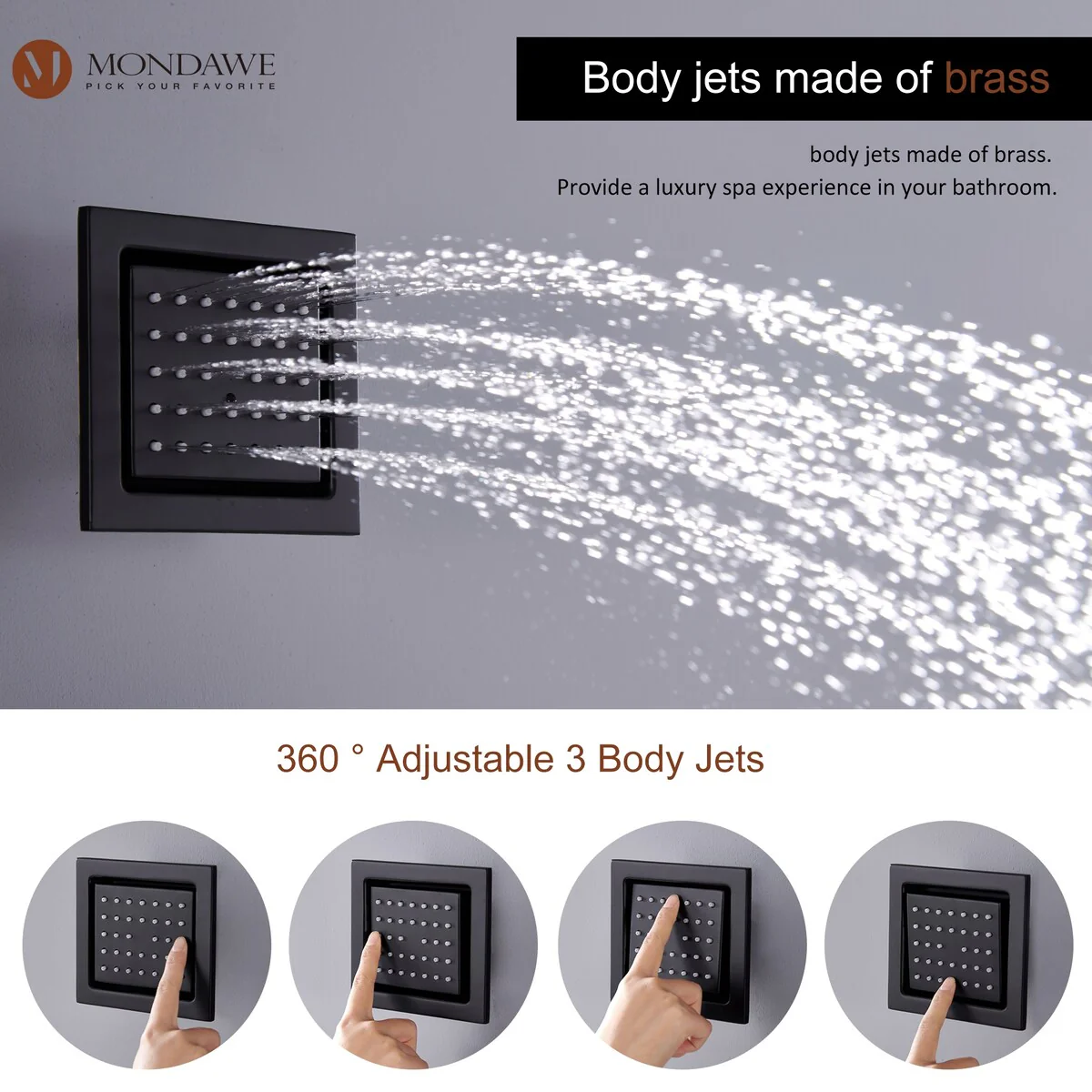 Wash the day away with our Three-In-One Shower Faucet! Use the waterfall shower, hand shower, and 3 body jets together or separately to get water where you need it most. Music player function and LED light will add more relax to your shower time!An anti-scald thermostatic valve with five handles is used for temperature control and water flow control which also adds convenience. Our shower faucet system always gives an amazing spray of water and adds the perfect touch to complete the look of your bathroom. If you are looking for elegance and performance, don't hesitate to choose our product.1.INCLUDES: waterfall shower main body, 16 inch square waterfall shower head, hand shower head, 30 * 30 * 200 mm shower arm, 59.06 in. length shower hose ,water control valve( copper ), 3 body jets.2.4-Way Function: Waterfall/rainfall shower, 3 packs of body jet, and hand shower. You could use faucets together or separately to get water where you need it most.3.Ceiling Mounting 2 Function Shower: shower head made of stainless steel, main body made of brass. Waterfall and rainfall mode, always gives an amazing spray of water.4.Wall Mounting Hand Shower: shower head, shower arm, and hose made of stainless steel, shower pedestal made of brass. Gives spray of water within its reach.5.Surface Mounting 360 ° Adjustable 3 Body Jets: body jets made of brass. Provide a luxury spa experience in your bathroom.6.Anti-scald thermostatic valve with five handles is used for temperature control and water flow control which also adds convenience.