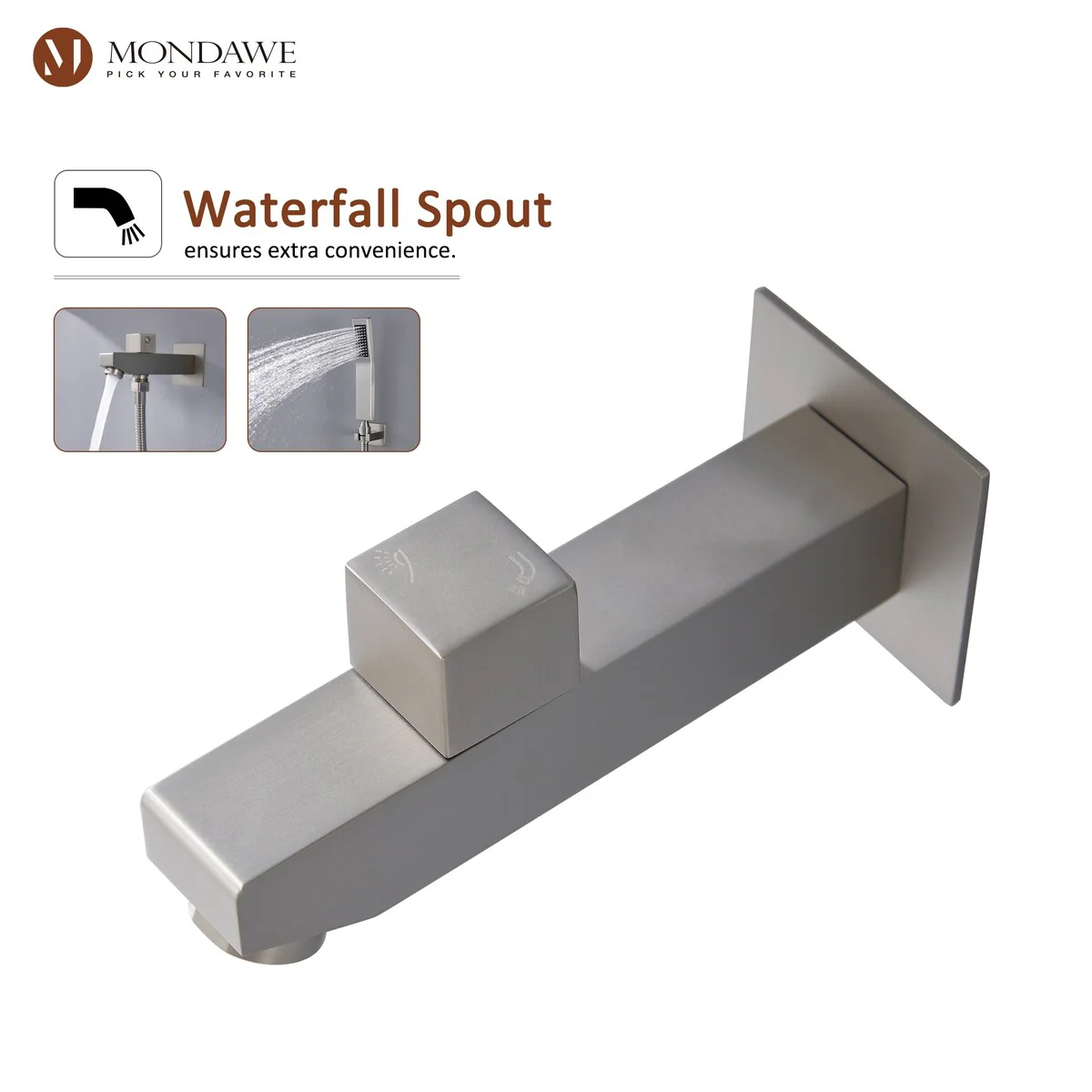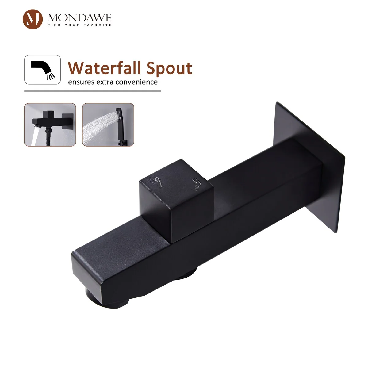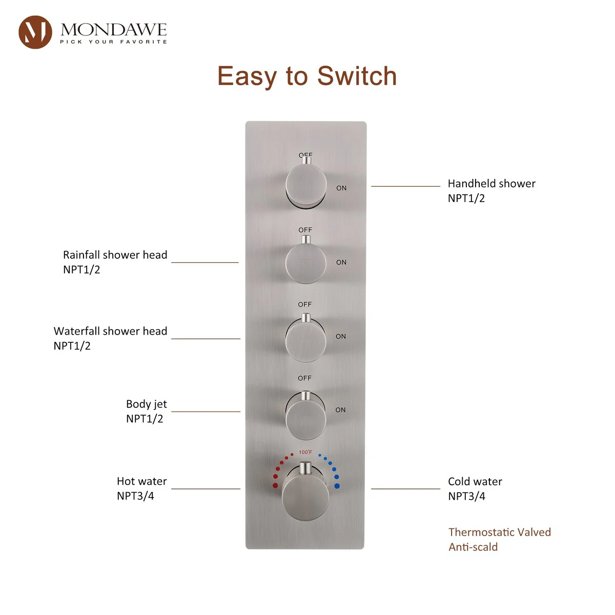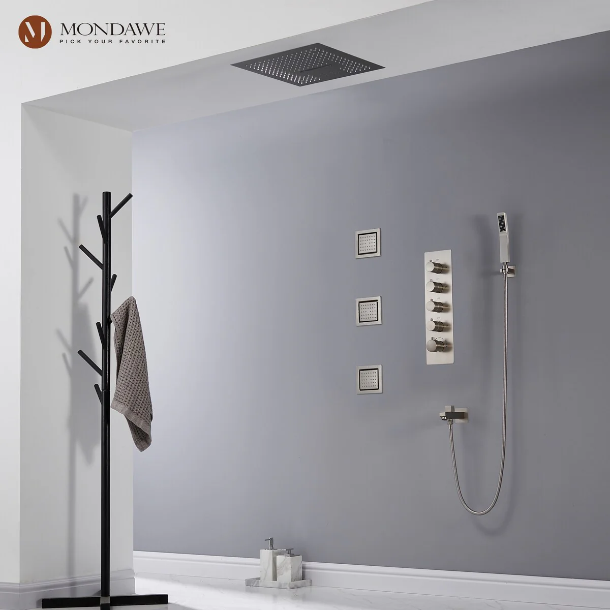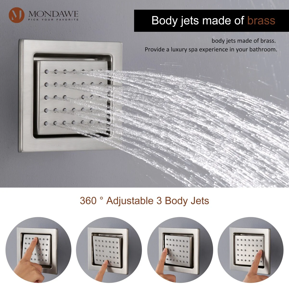 Wash the day away with our Three-In-One Shower Faucet! Use the waterfall shower, hand shower, and 3 body jets together or separately to get water where you need it most. Music player function and LED light will add more relax to your shower time!An anti-scald thermostatic valve with five handles is used for temperature control and water flow control which also adds convenience. Our shower faucet system always gives an amazing spray of water and adds the perfect touch to complete the look of your bathroom. If you are looking for elegance and performance, don't hesitate to choose our product.1.INCLUDES: waterfall shower main body, 16 inch square waterfall shower head, hand shower head, 30 * 30 * 200 mm shower arm, 59.06 in. length shower hose ,water control valve( copper ), 3 body jets.2.4-Way Function: Waterfall/rainfall shower, 3 packs of body jet, and hand shower. You could use faucets together or separately to get water where you need it most.3.Ceiling Mounting 2 Function Shower: shower head made of stainless steel, main body made of brass. Waterfall and rainfall mode, always gives an amazing spray of water.4.Wall Mounting Hand Shower: shower head, shower arm, and hose made of stainless steel, shower pedestal made of brass. Gives spray of water within its reach.5.Surface Mounting 360 ° Adjustable 3 Body Jets: body jets made of brass. Provide a luxury spa experience in your bathroom.6.Anti-scald thermostatic valve with five handles is used for temperature control and water flow control which also adds convenience.