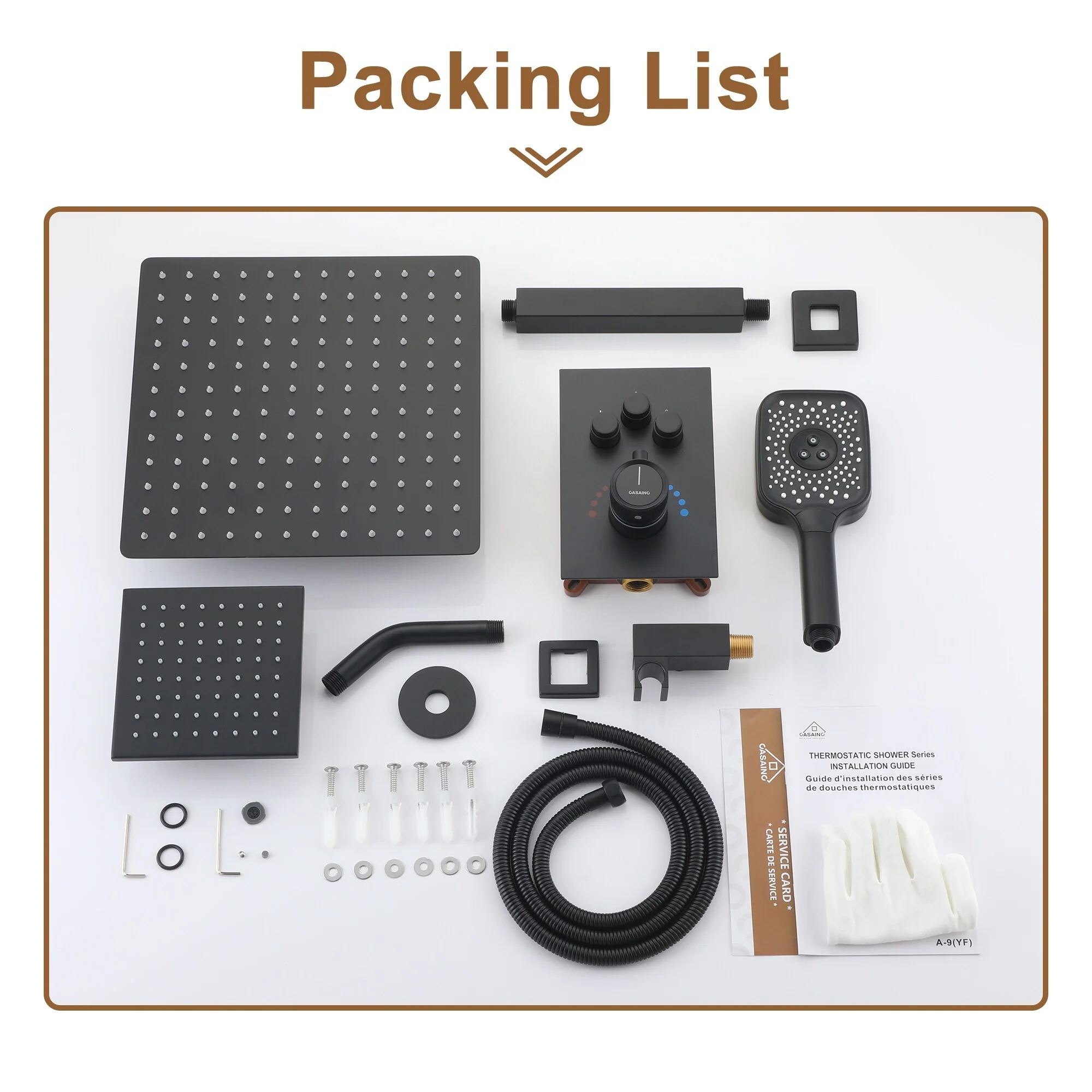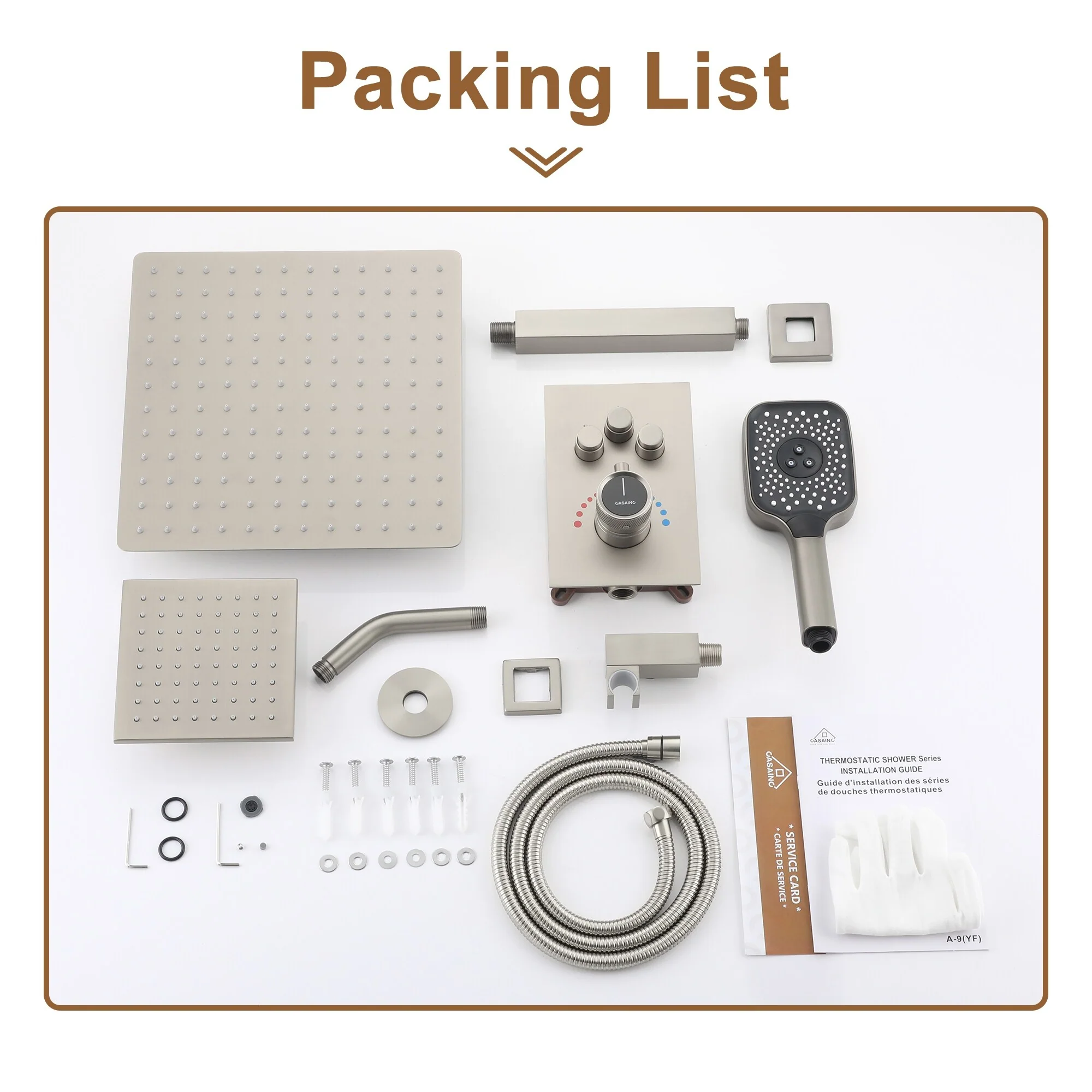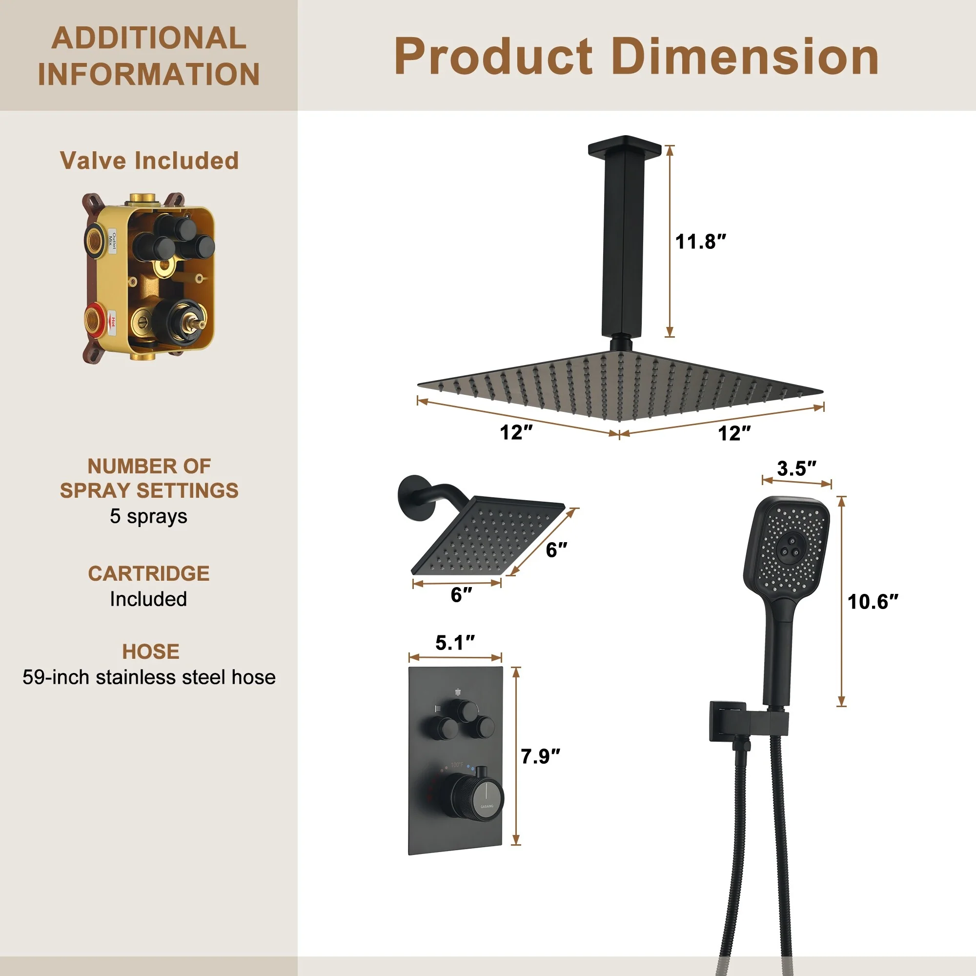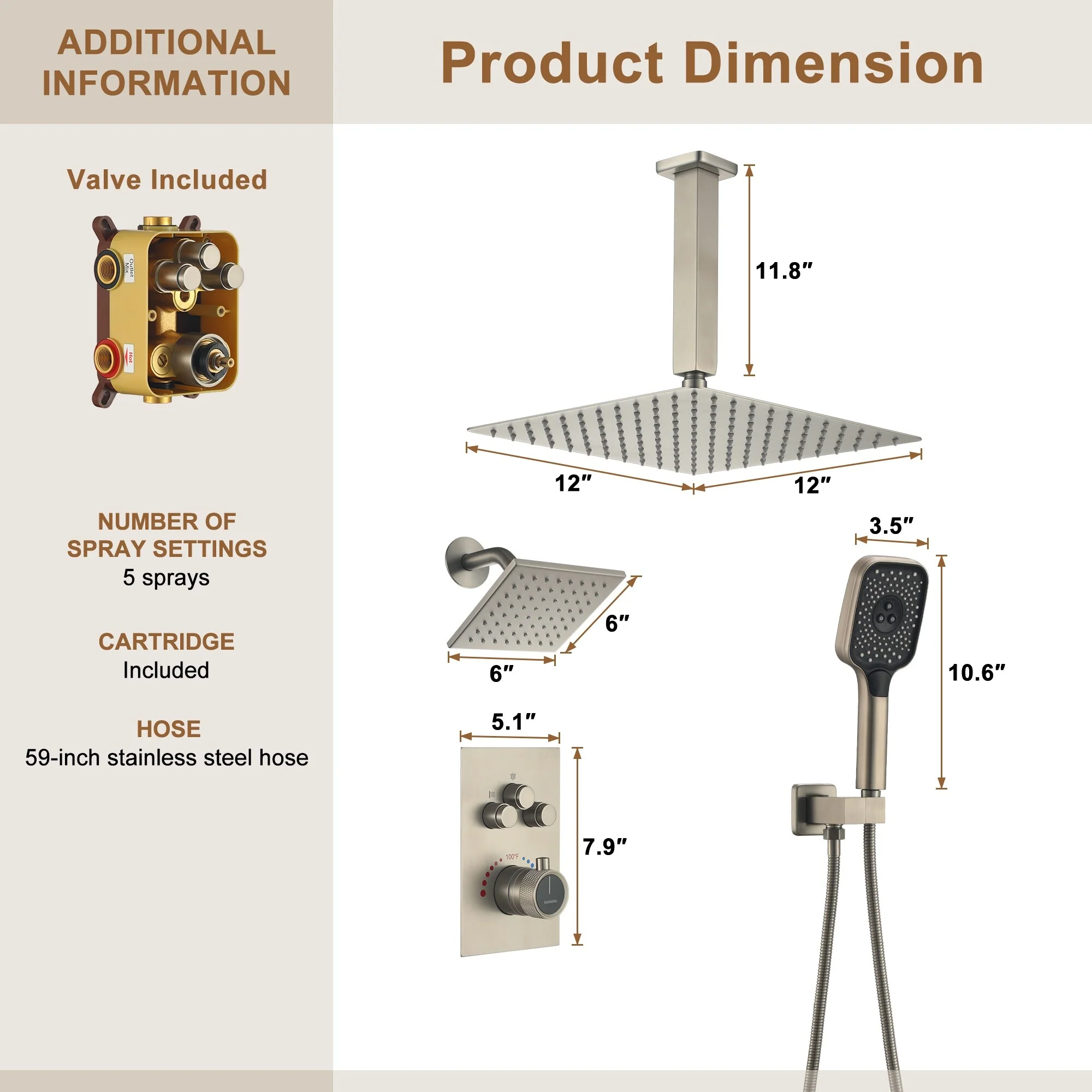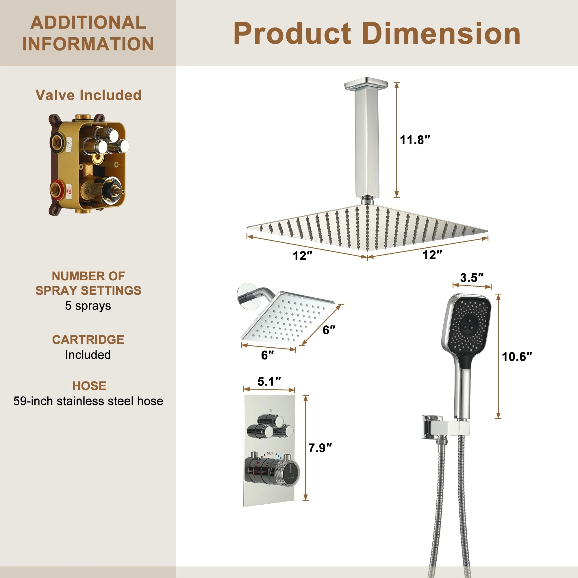 - 12 in. square rain shower head 304 stainless steel, handheld shower head, 6 body jets, handheld shower holder, 59 in. shower hose 304 stainless steel, thermostatic shower valve and trim kit included