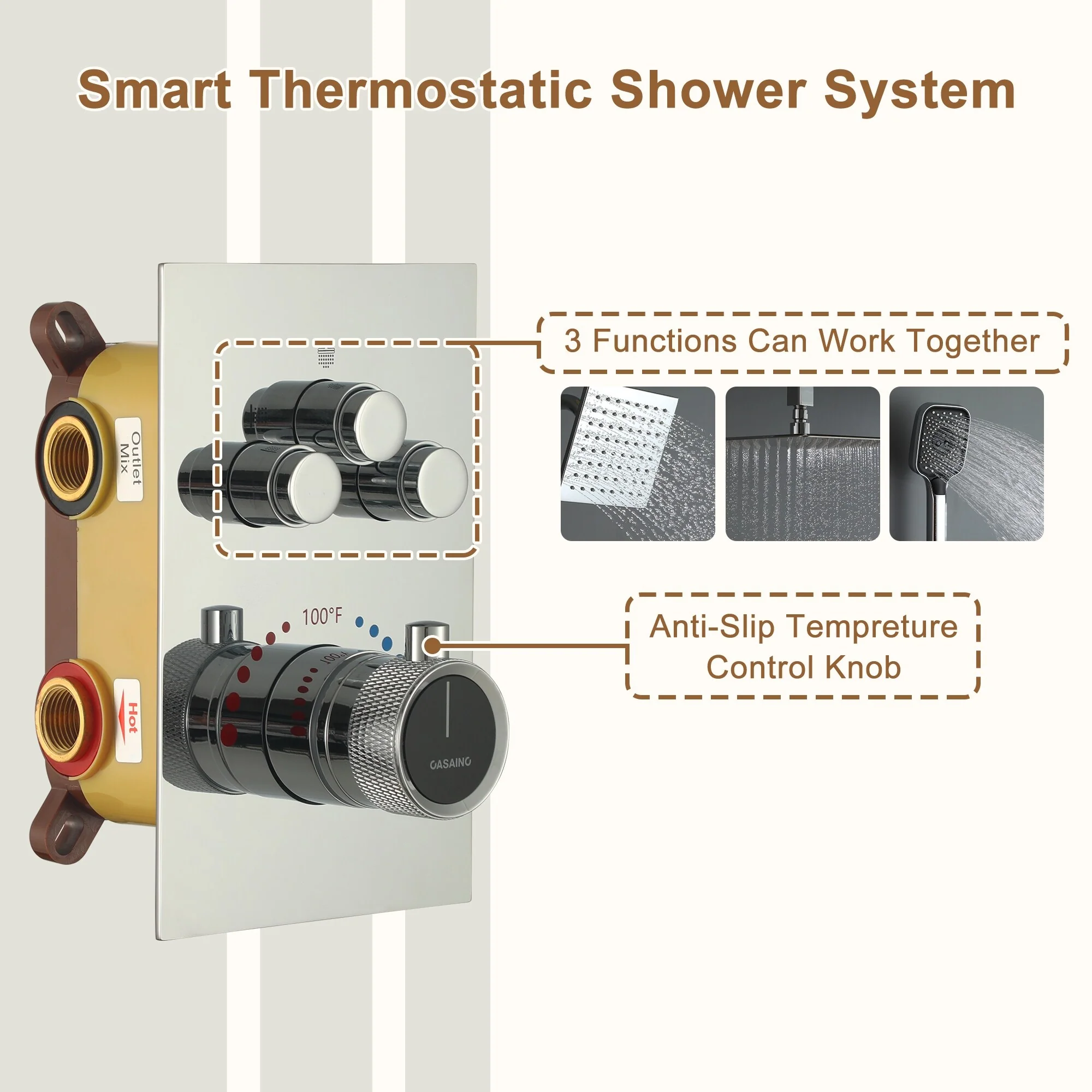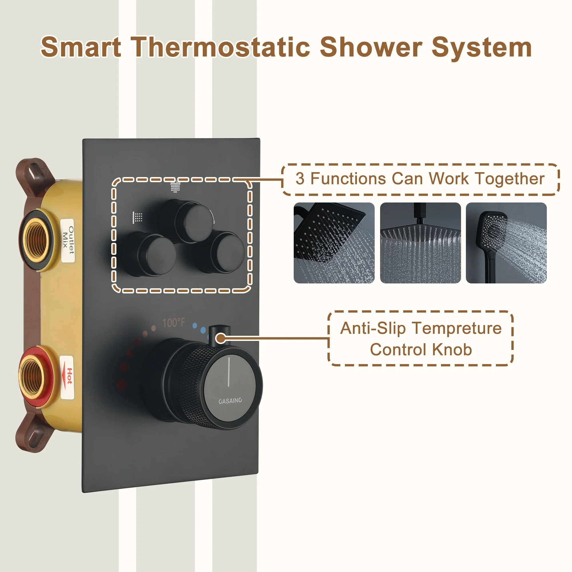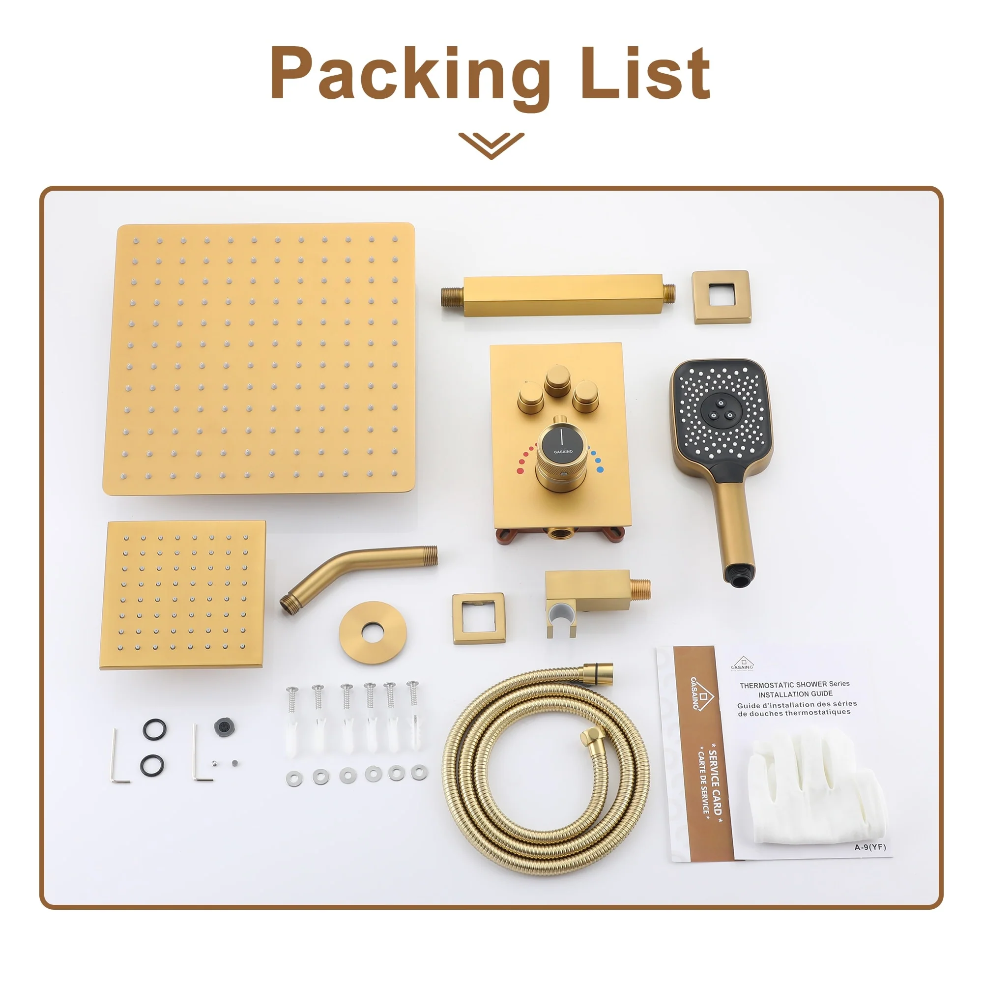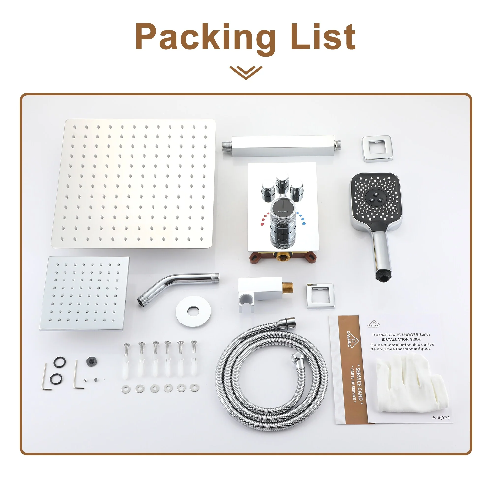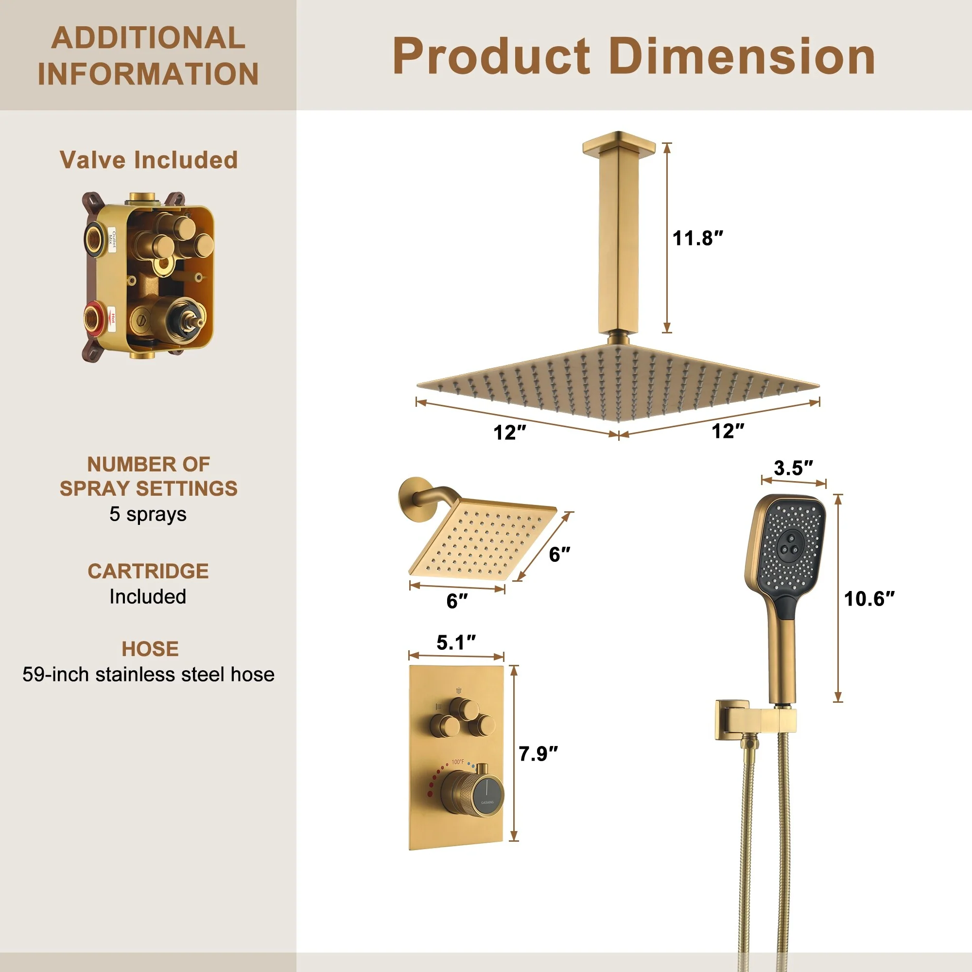 - 12 in. square rain shower head 304 stainless steel, handheld shower head, 6 body jets, handheld shower holder, 59 in. shower hose 304 stainless steel, thermostatic shower valve and trim kit included