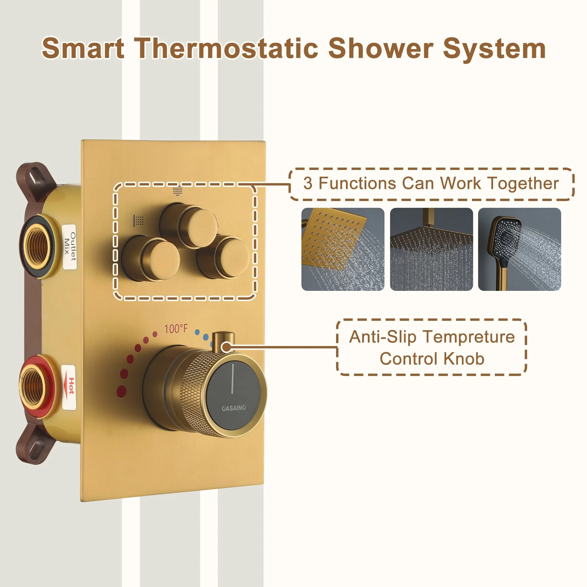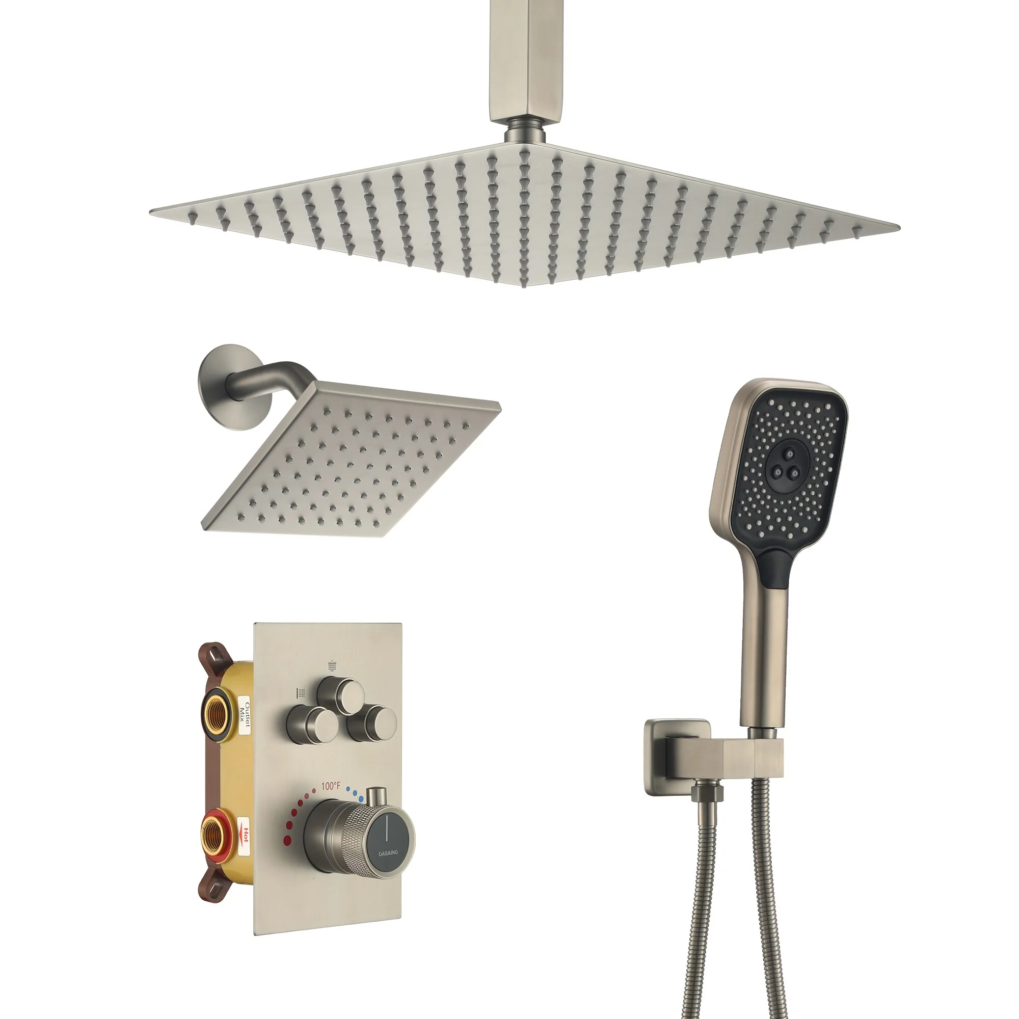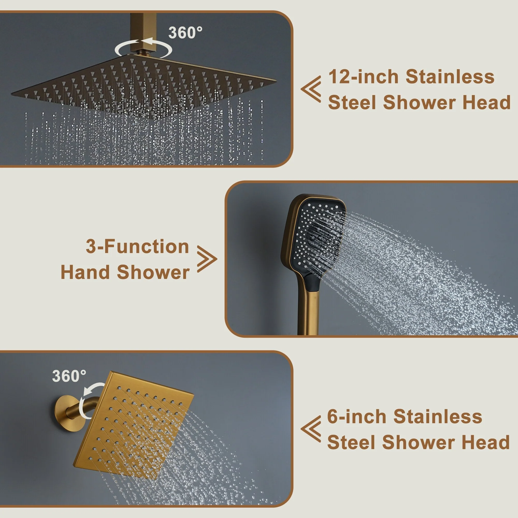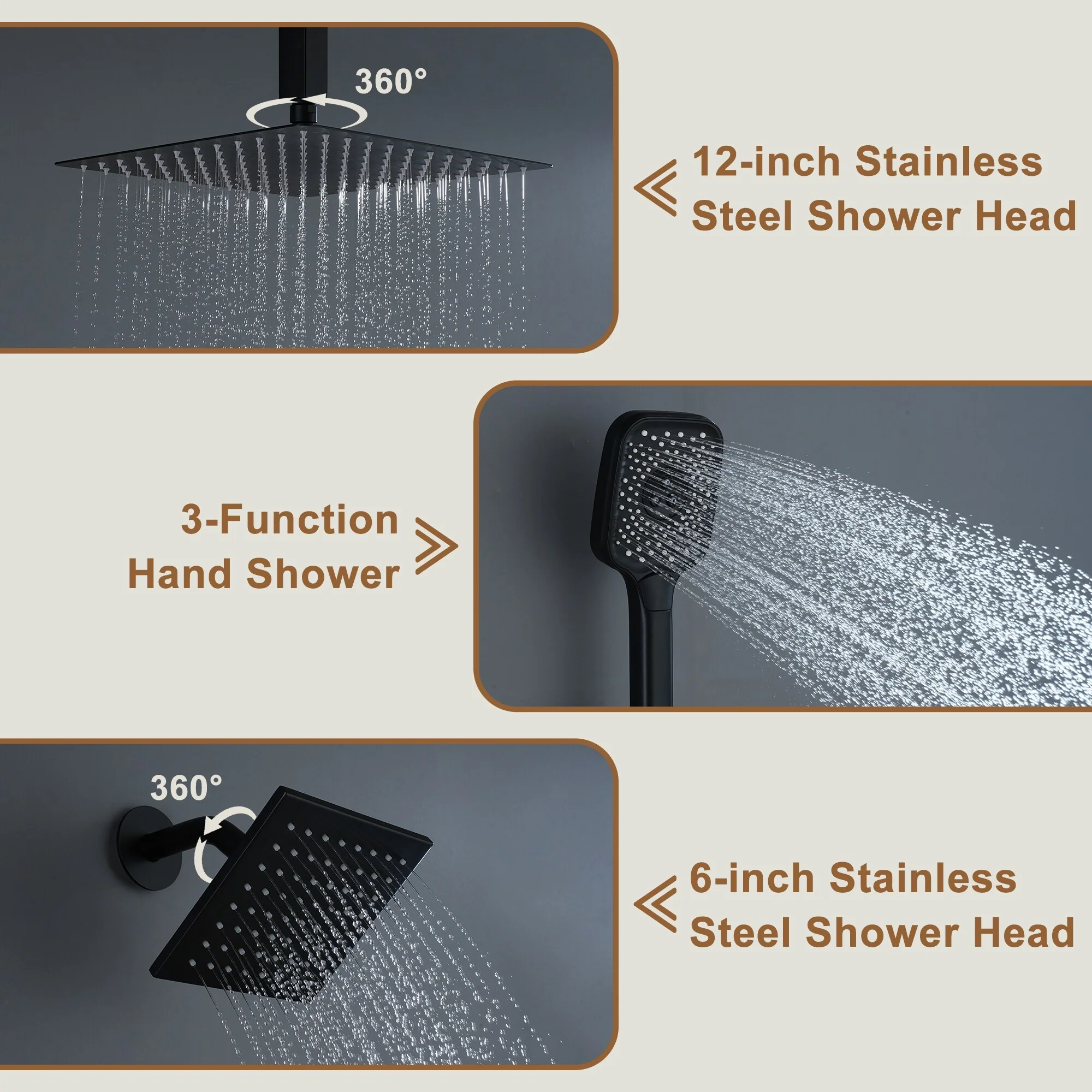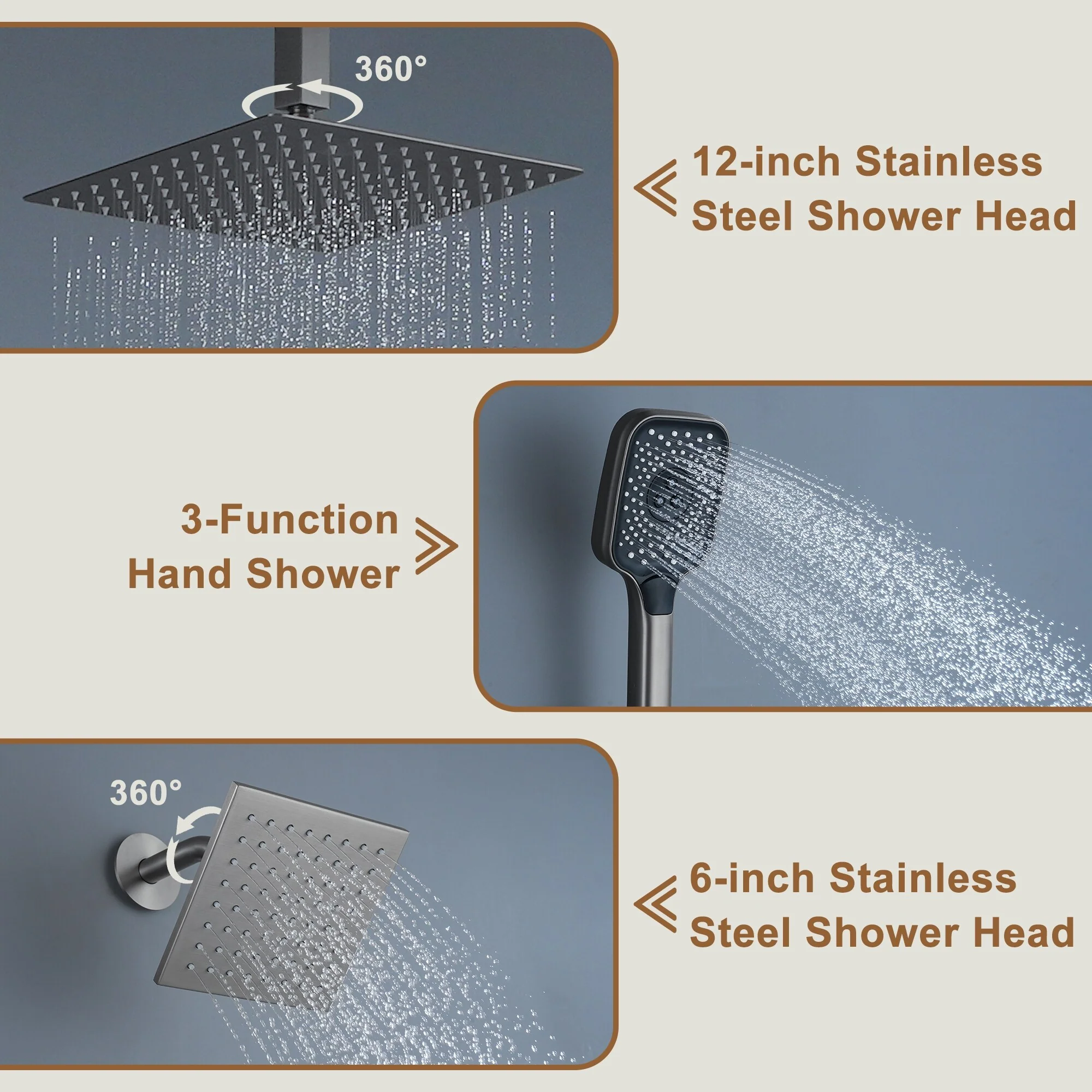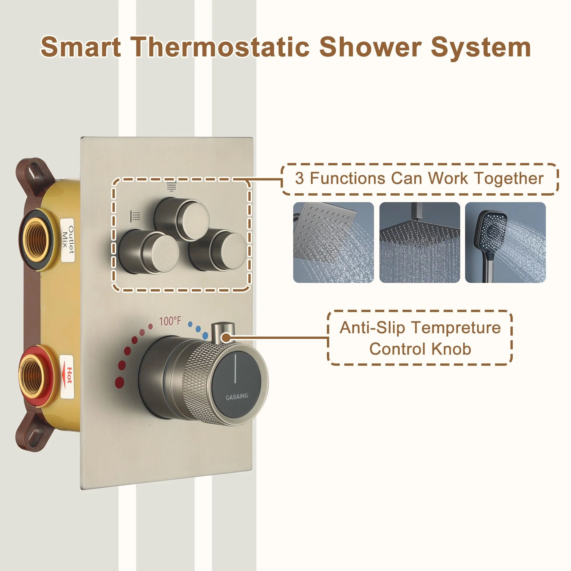- 12 in. square rain shower head 304 stainless steel, handheld shower head, 6 body jets, handheld shower holder, 59 in. shower hose 304 stainless steel, thermostatic shower valve and trim kit included