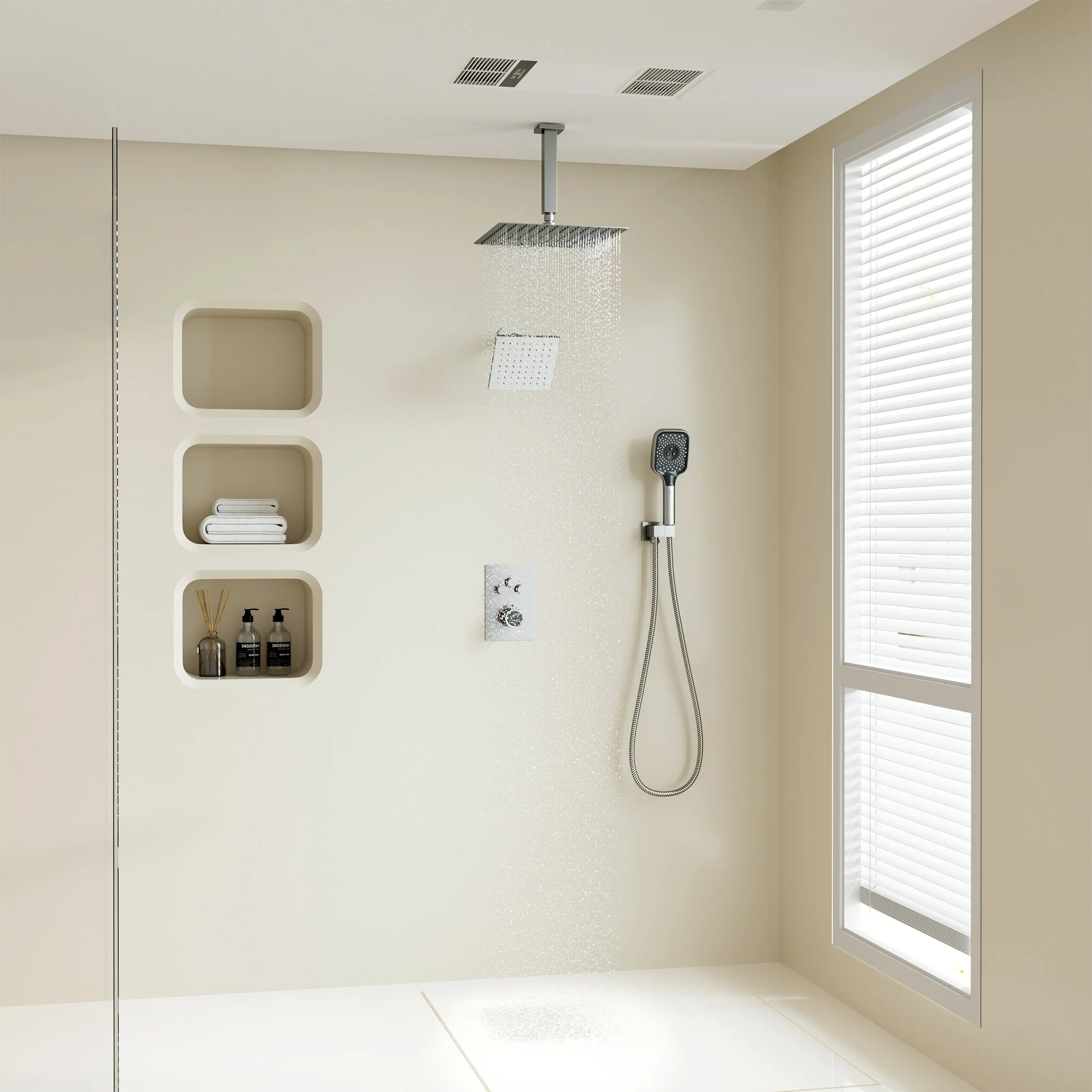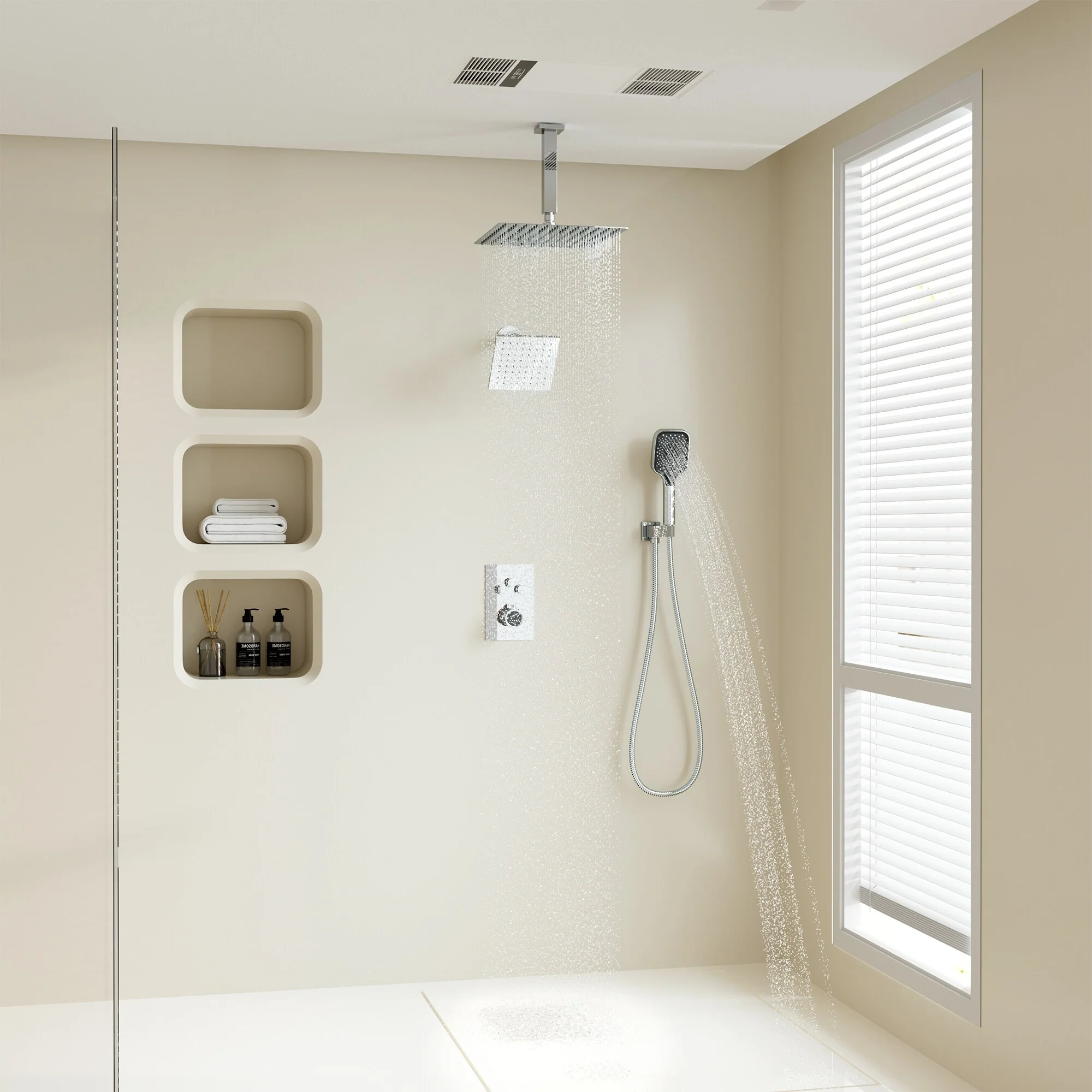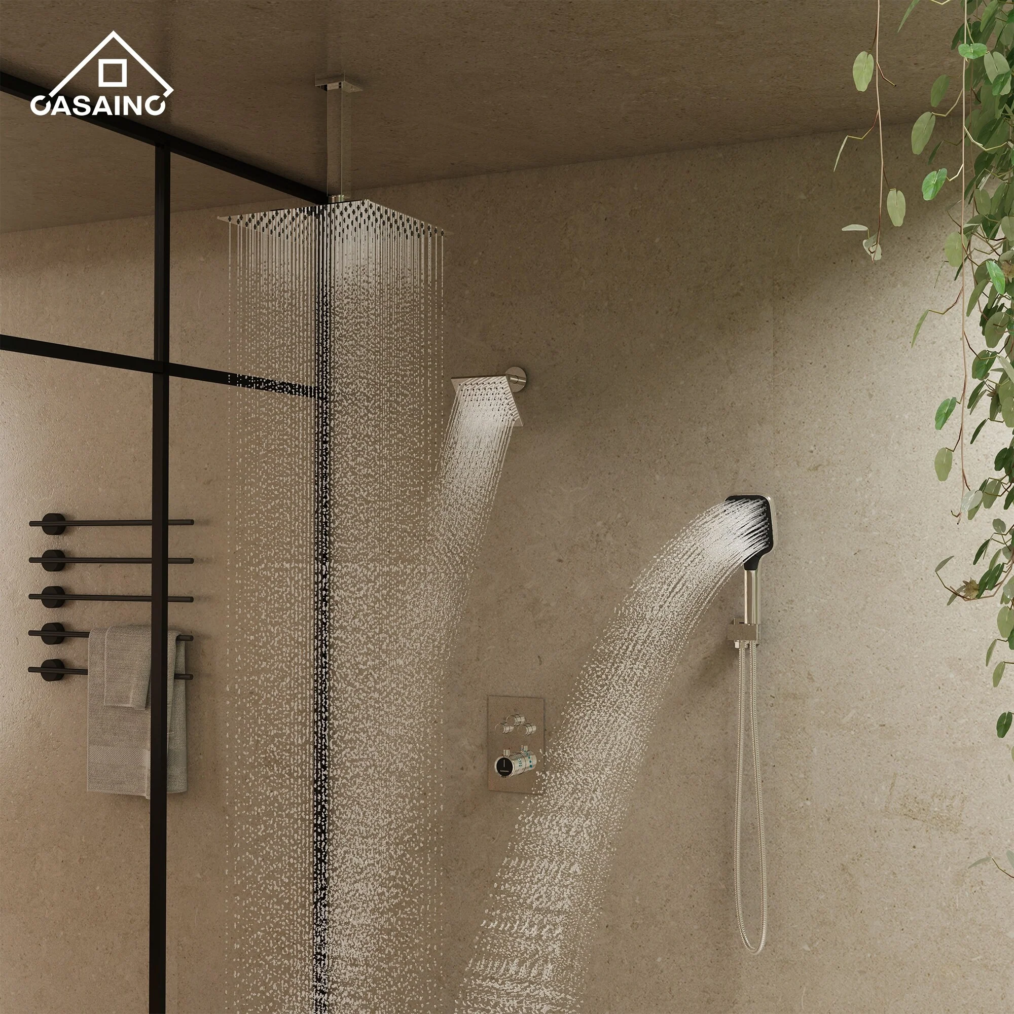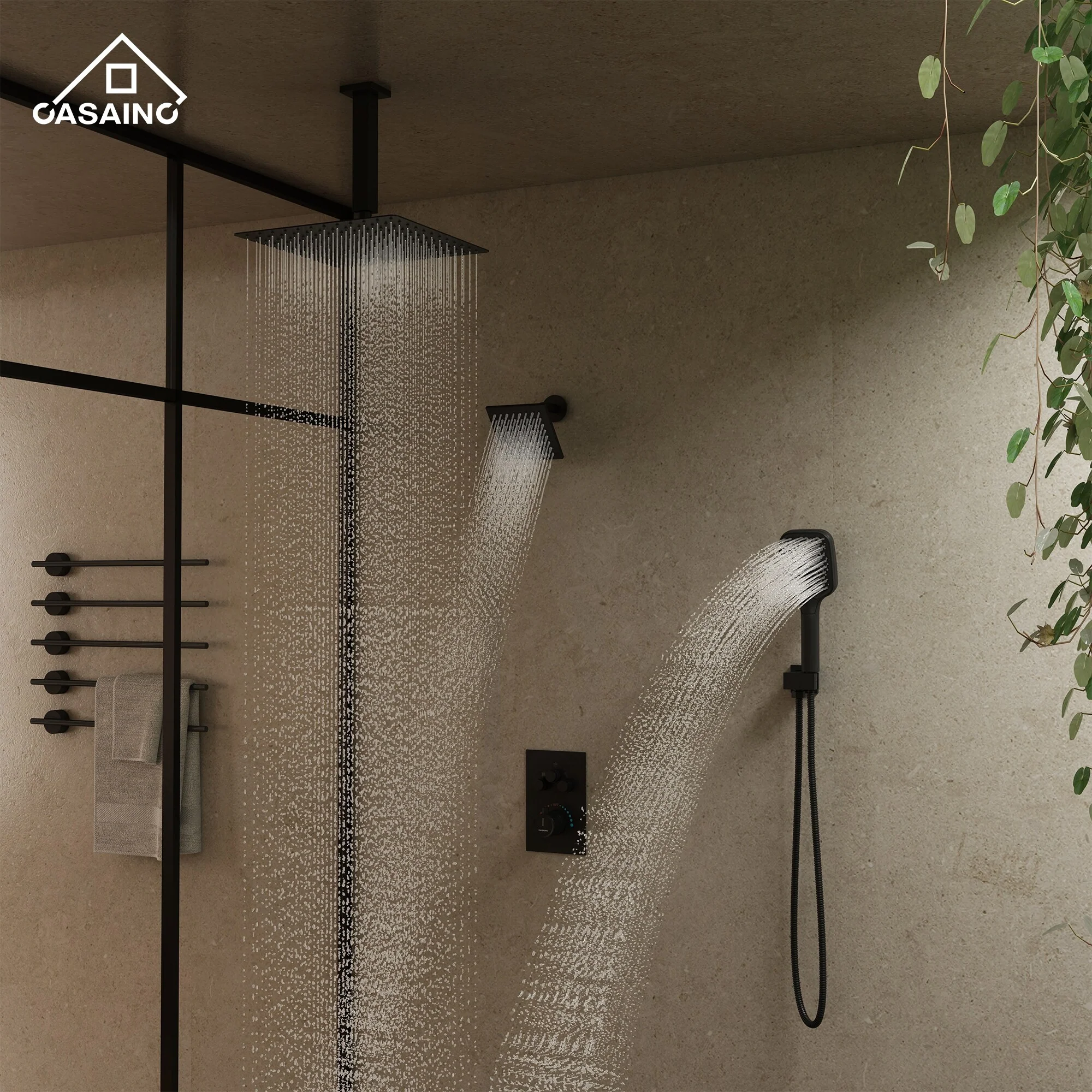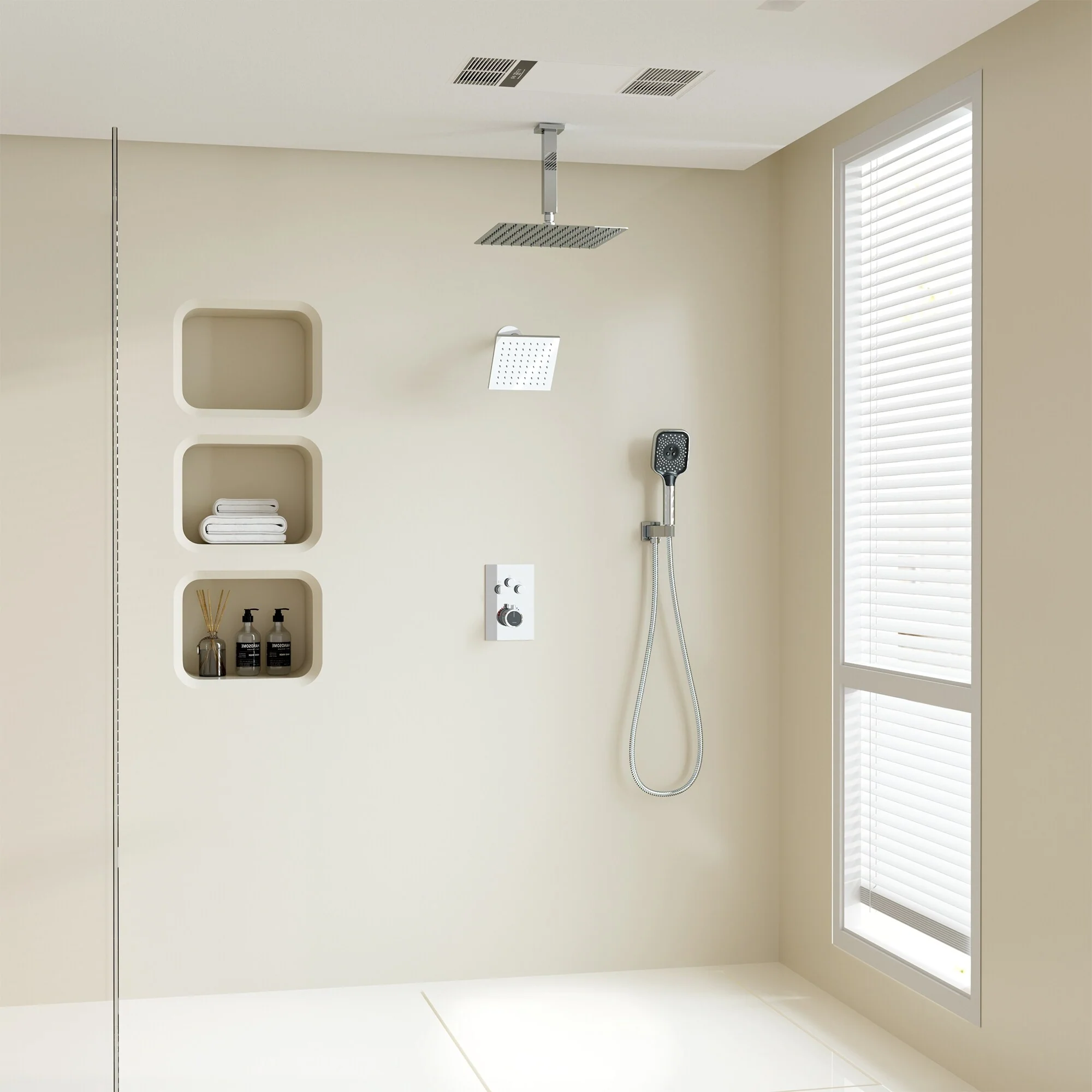 - 12 in. square rain shower head 304 stainless steel, handheld shower head, 6 body jets, handheld shower holder, 59 in. shower hose 304 stainless steel, thermostatic shower valve and trim kit included