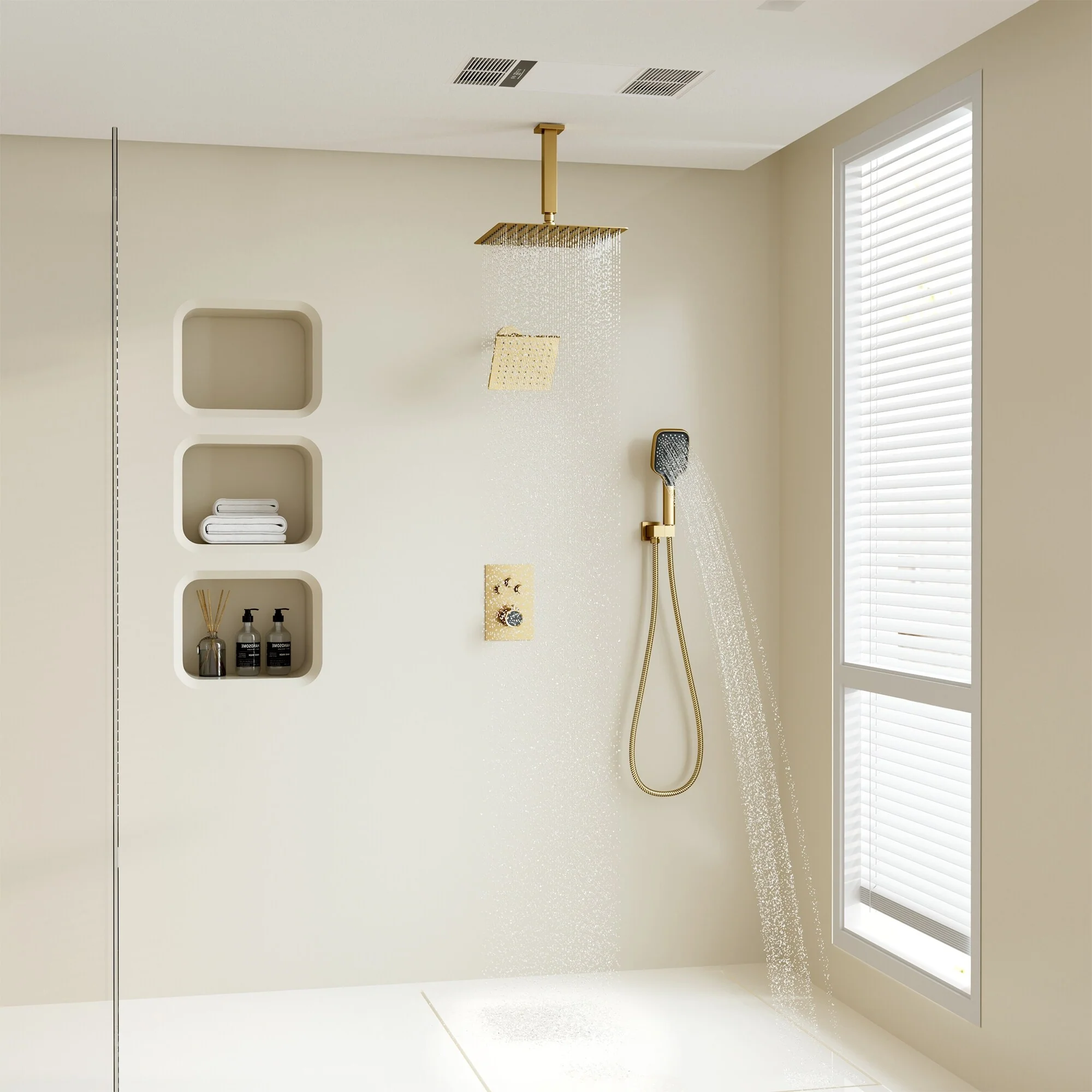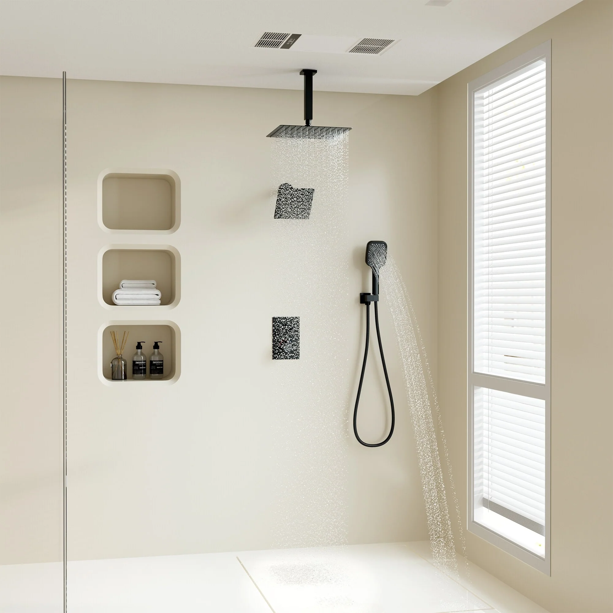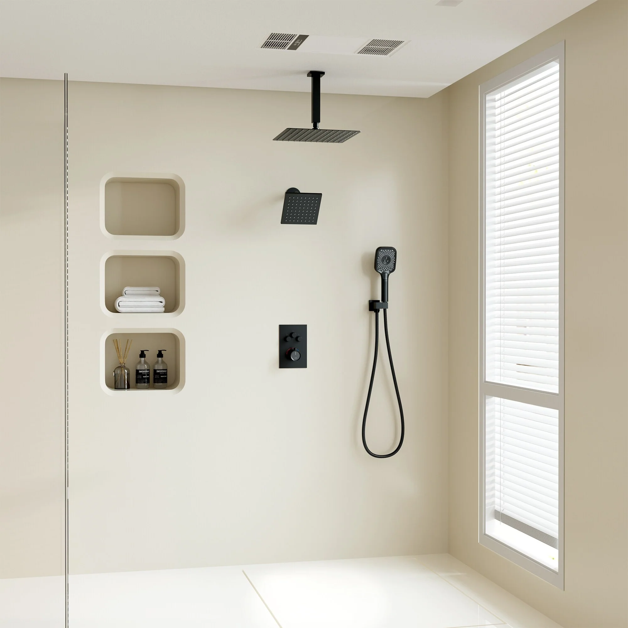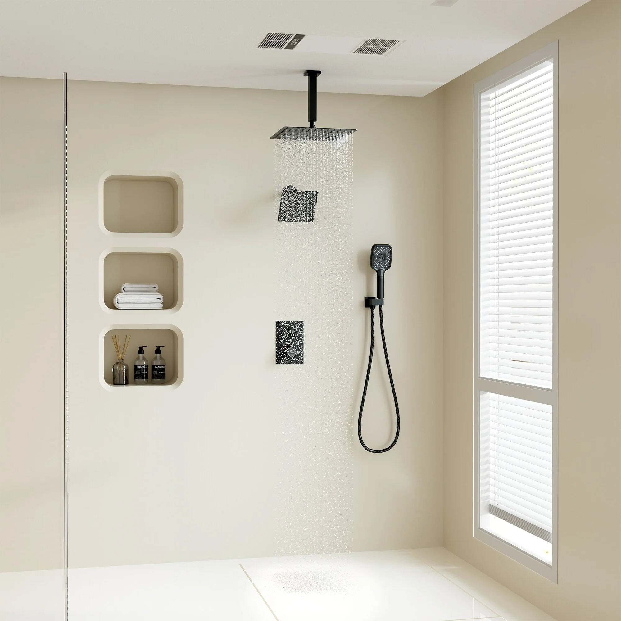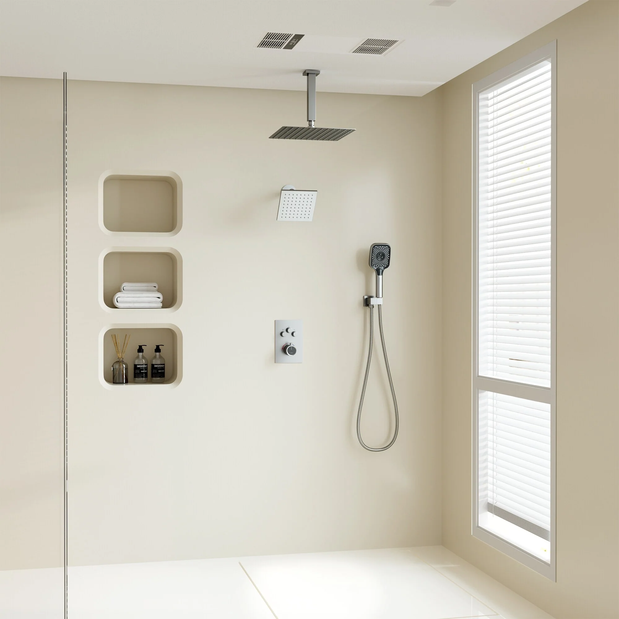 - 12 in. square rain shower head 304 stainless steel, handheld shower head, 6 body jets, handheld shower holder, 59 in. shower hose 304 stainless steel, thermostatic shower valve and trim kit included