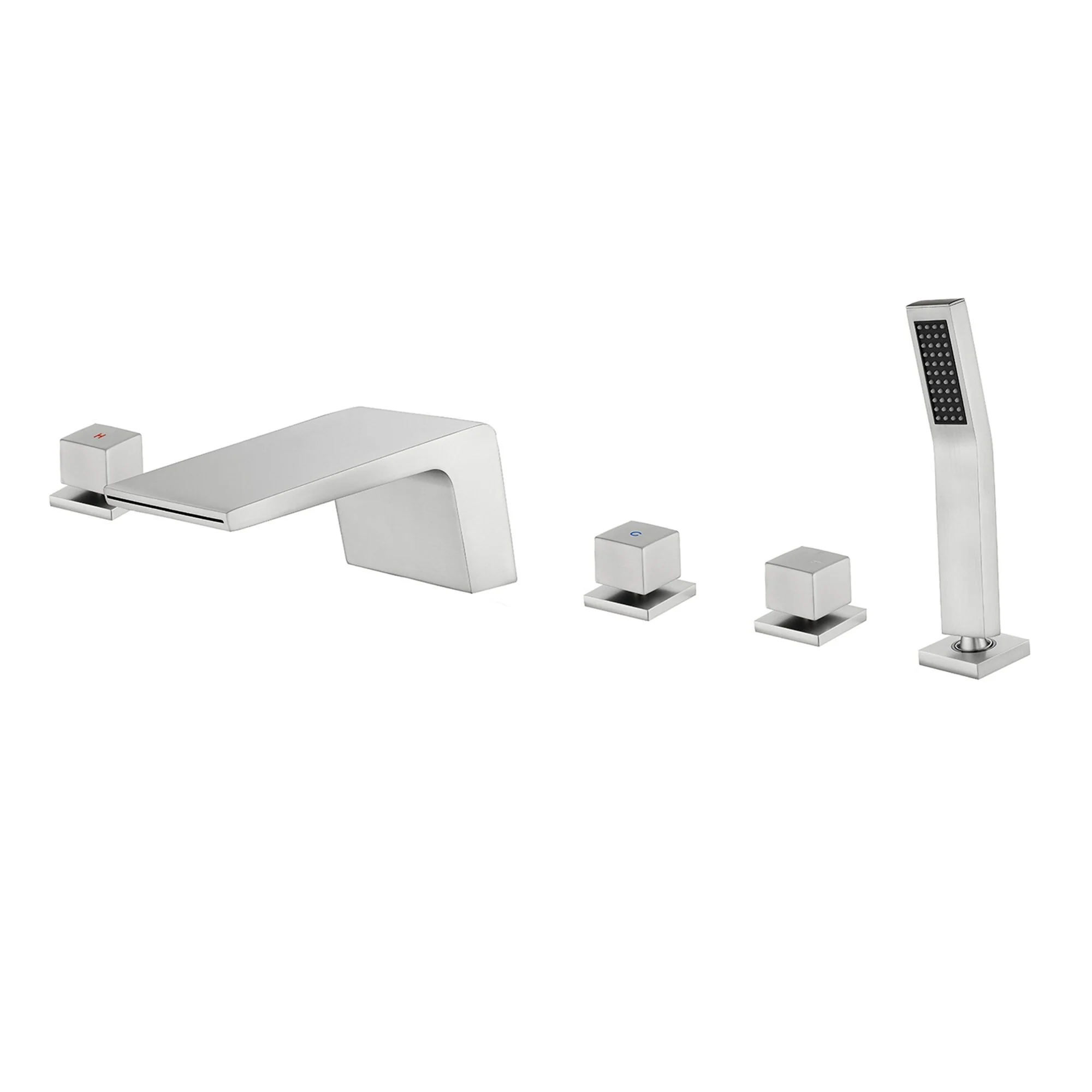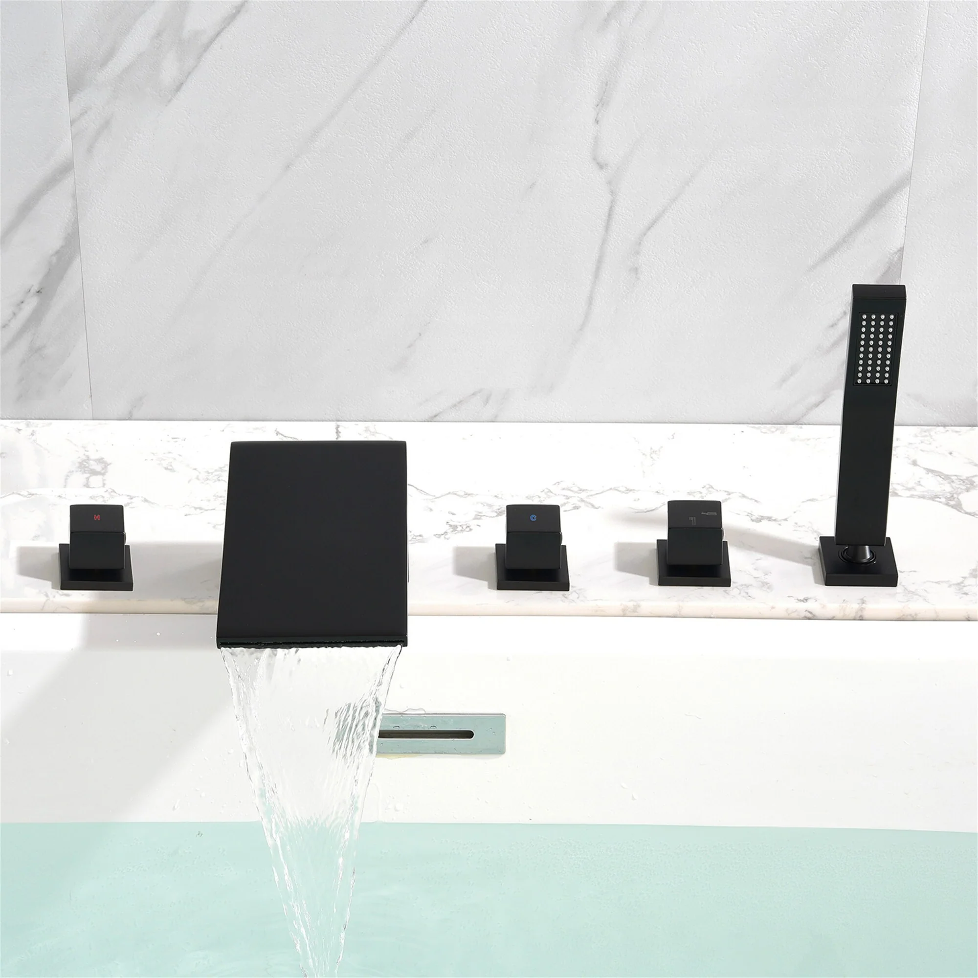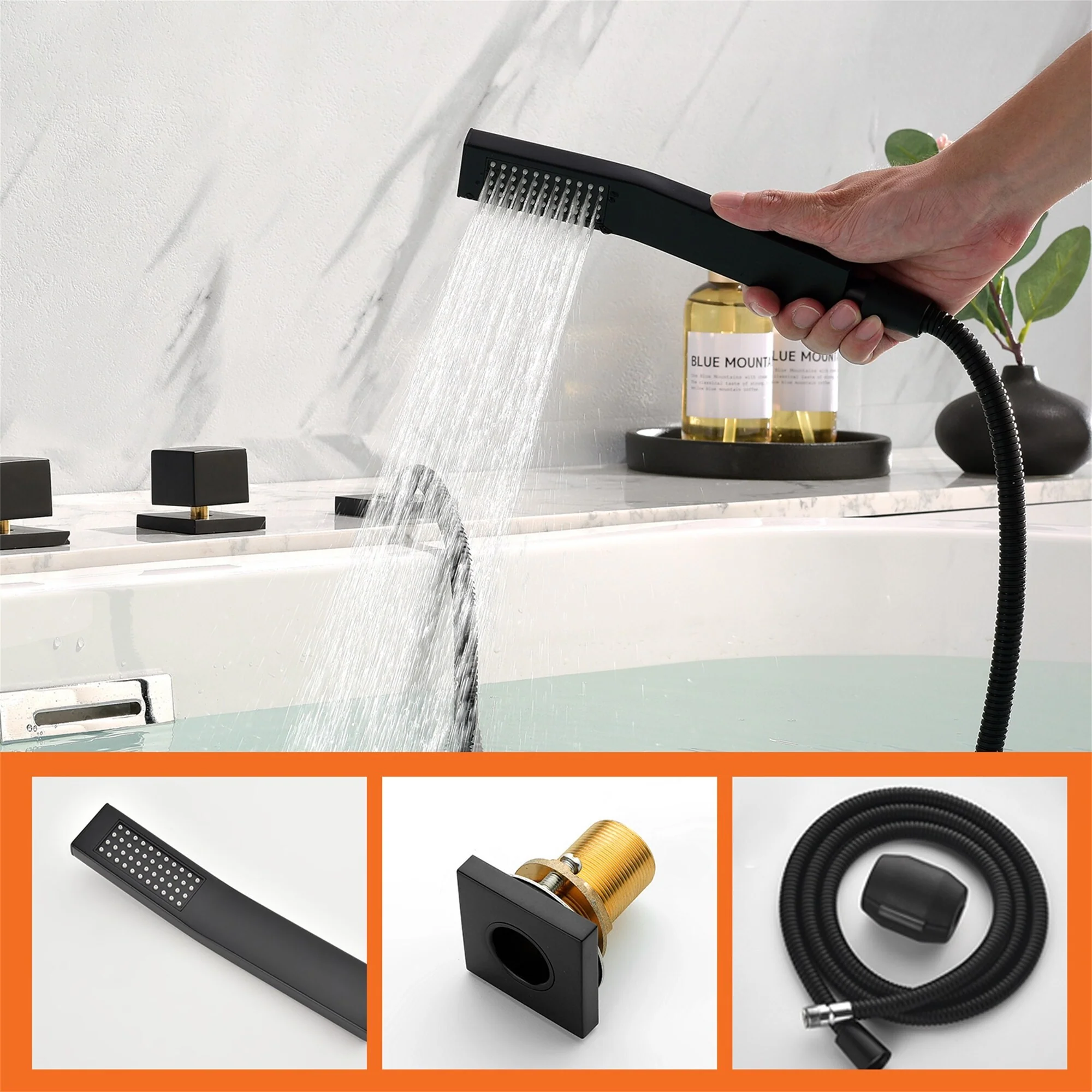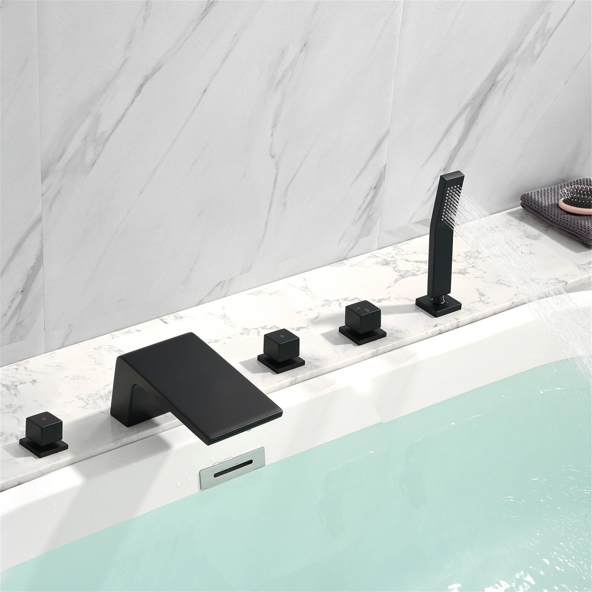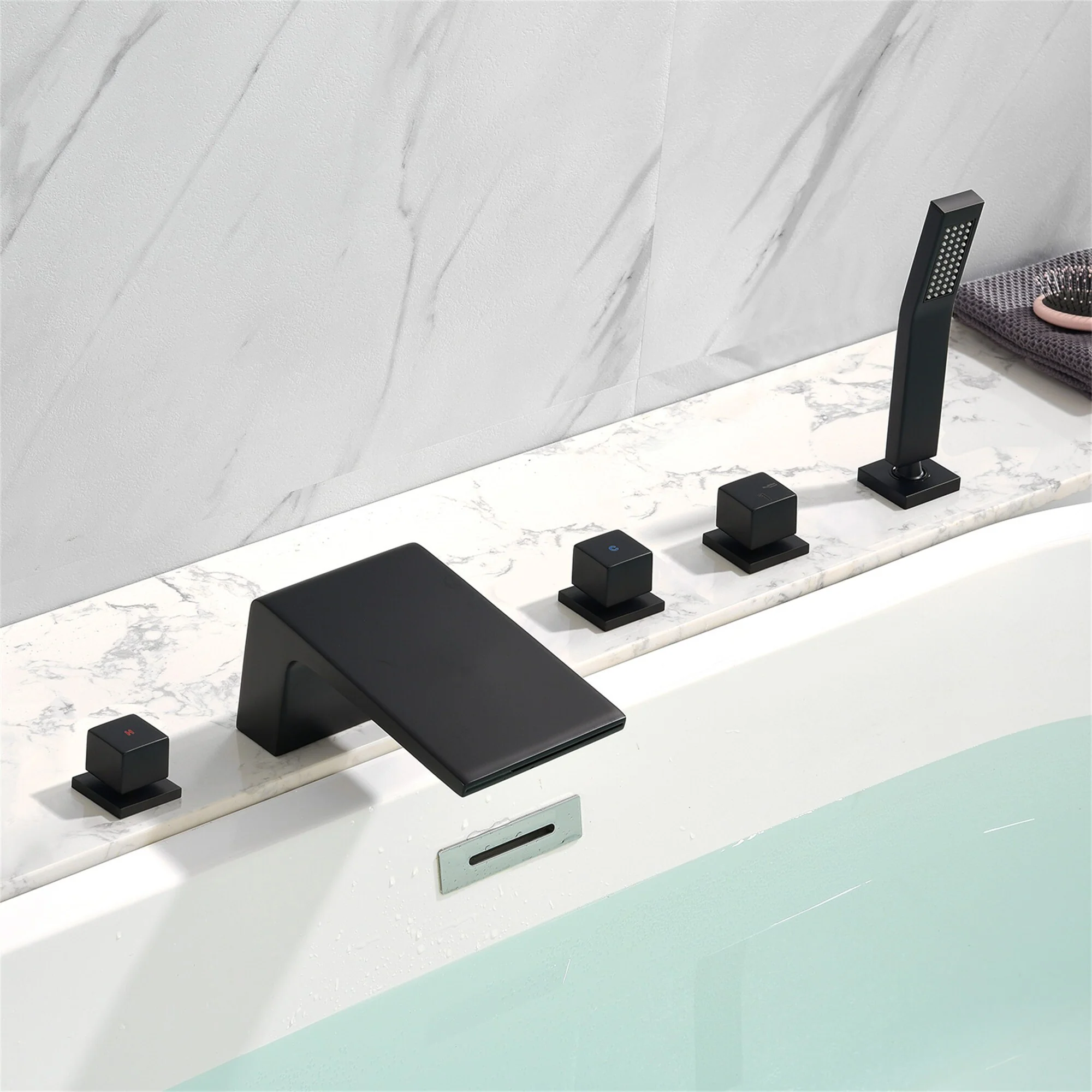 Chic and minimal in design, functional and complete, this modern deck mounted tub filler waterfall is the perfect addition to your bathroom and will give you an upgrade. Featuring a wide waterfall spout, it delivers a gentle cascade to fill the tub gently and charmingly, providing you a comfortable soaking bath experience. At the same time, it has the characteristics of high flow, which can help you fill the bathtub quickly, allowing you to enjoy a comfortable and wonderful soaking bath and relieve the fatigue of the day. The flexible hand shower allows you to take care of every inch of the body and bathes your children and pets with great convenience. Just twist the diverter knob to easily switch between the two water outlets, allowing you to enjoy two different bathing experiences. The waterfall bathtub faucet with handheld shower comes with a CUPC certified ceramic cartridge for a low leak rate. Pretty and practical, this brass tub faucet with sprayer will endow you with a fabulous, relaxing bathing time.